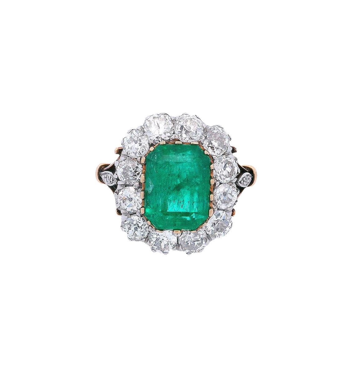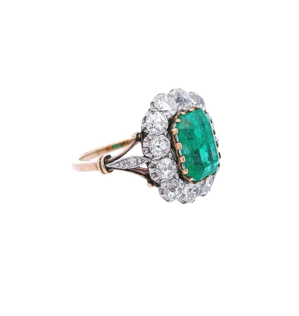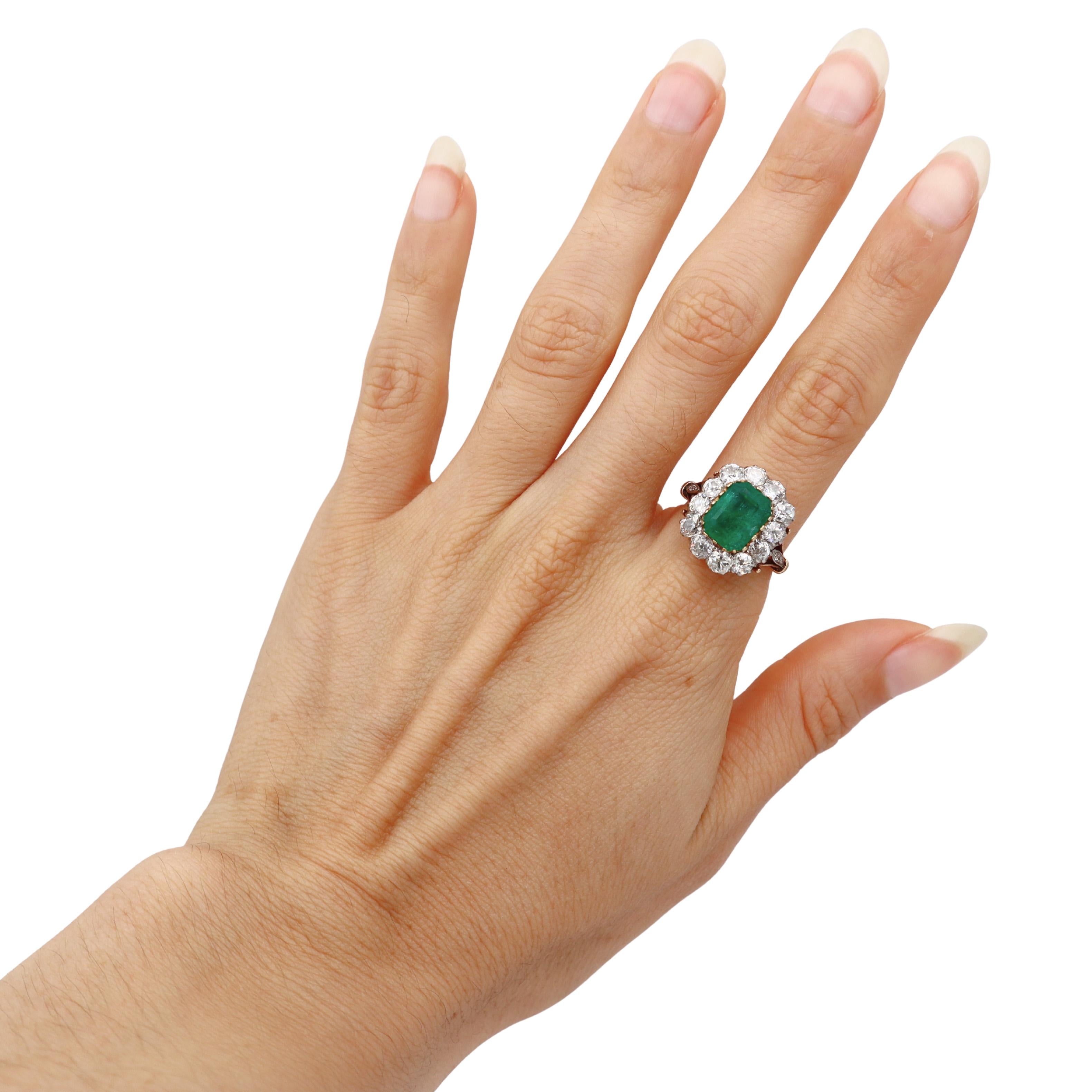 This magnificent circa 1900-1910s Edwardian cluster ring exemplifies the refined elegance of the era, crafted in lustrous 18kt yellow gold and platinum and featuring a stunning 2.80-carat emerald-cut emerald as its regal centerpiece, beautifully surrounded by 1.50 carats of old mine diamonds in H color and SI clarity. The classic cluster design creates a halo of brilliance around the vibrant green emerald, while the two-tone metal combination enhances both the emerald's natural beauty and the diamonds' sparkling fire.