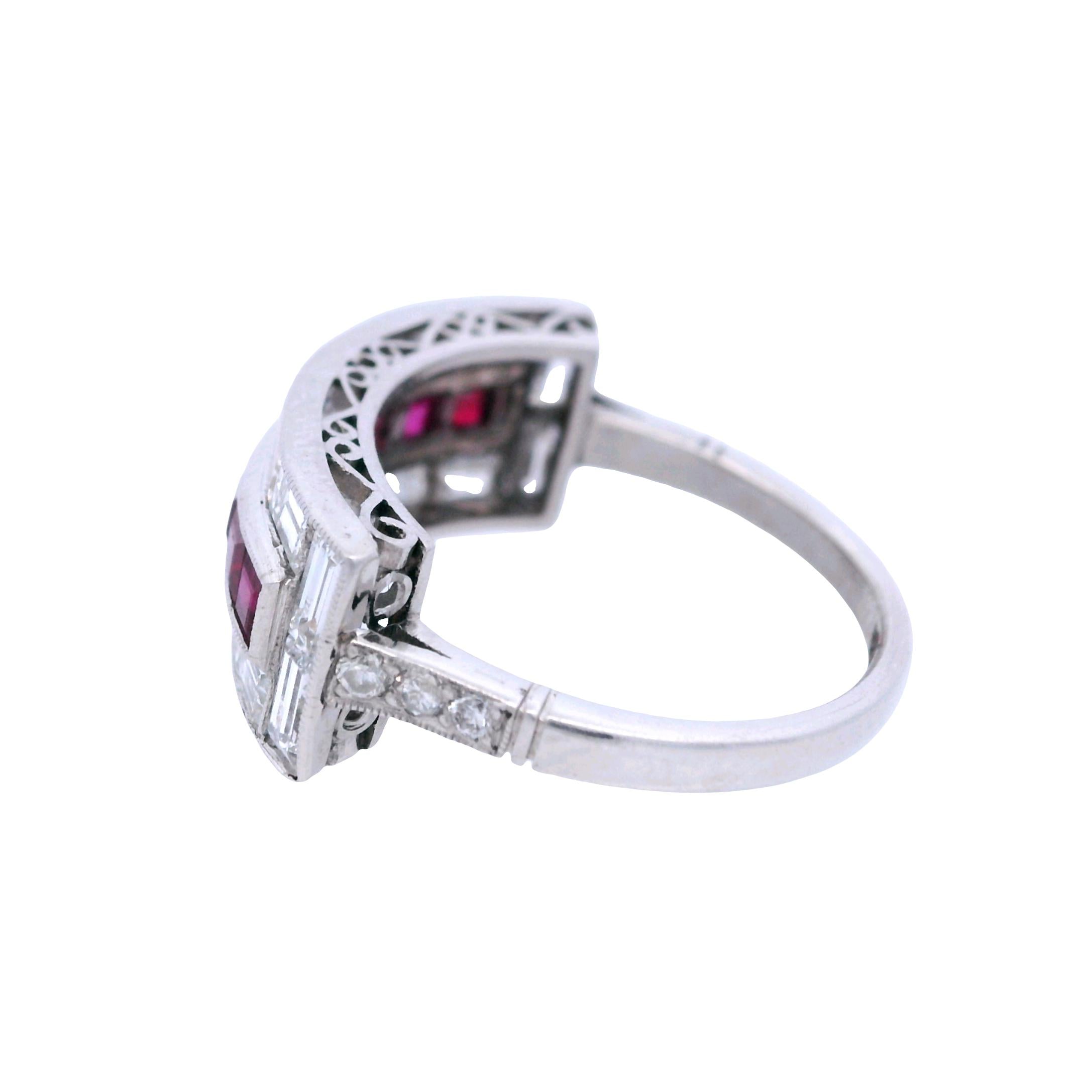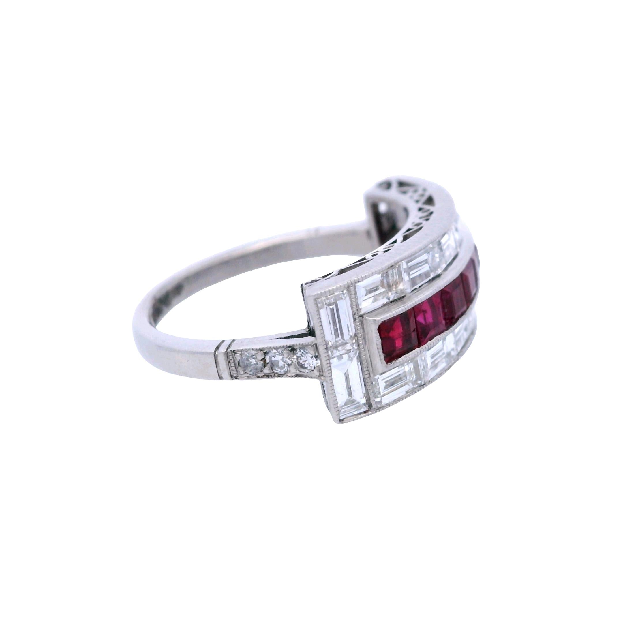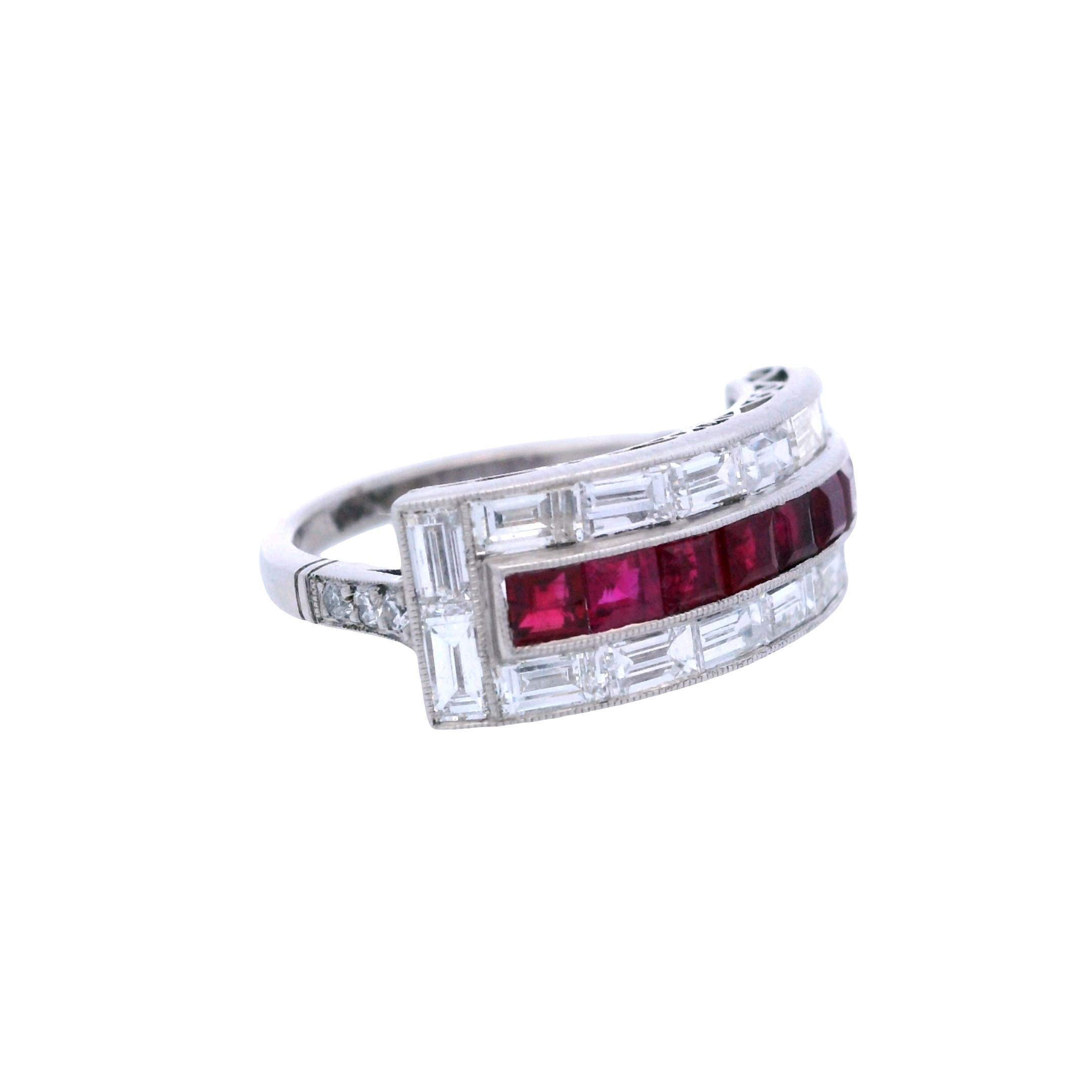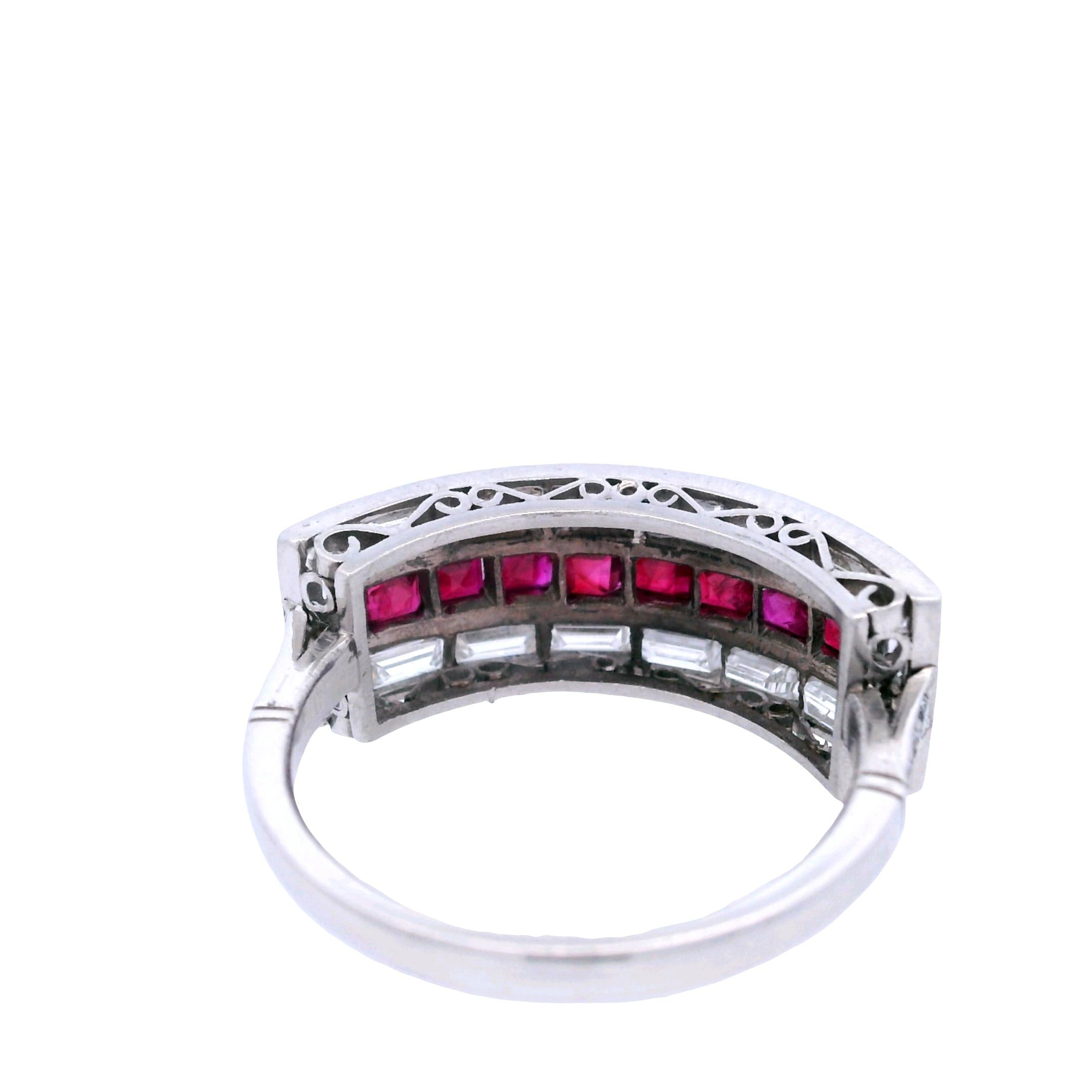 CONDITION & AUTHENTICITY: The overall condition of this piece is excellent. There is no damage to the platinum setting. All square-cut rubies and baguette diamonds are securely set in their original mountings, displaying the masterful precision of Art Deco craftsmanship.