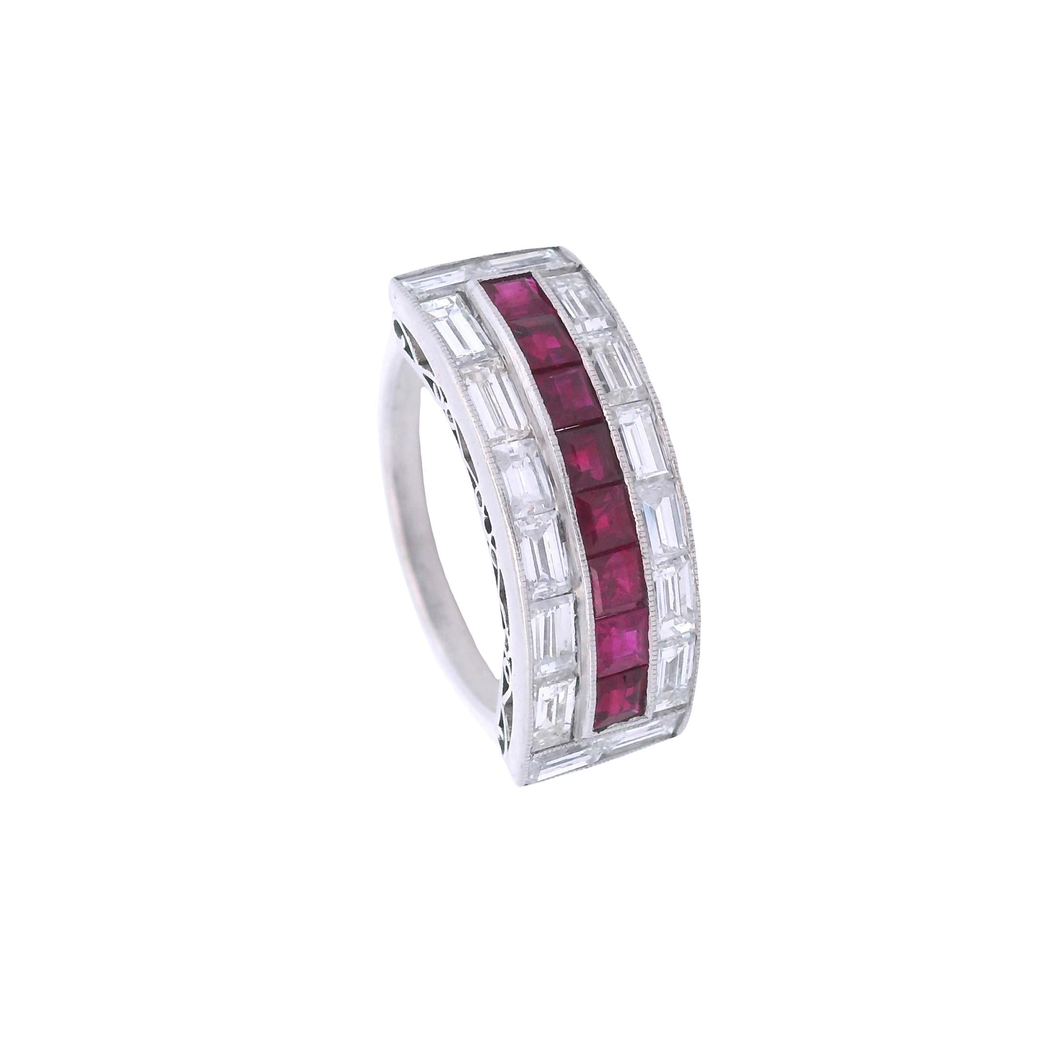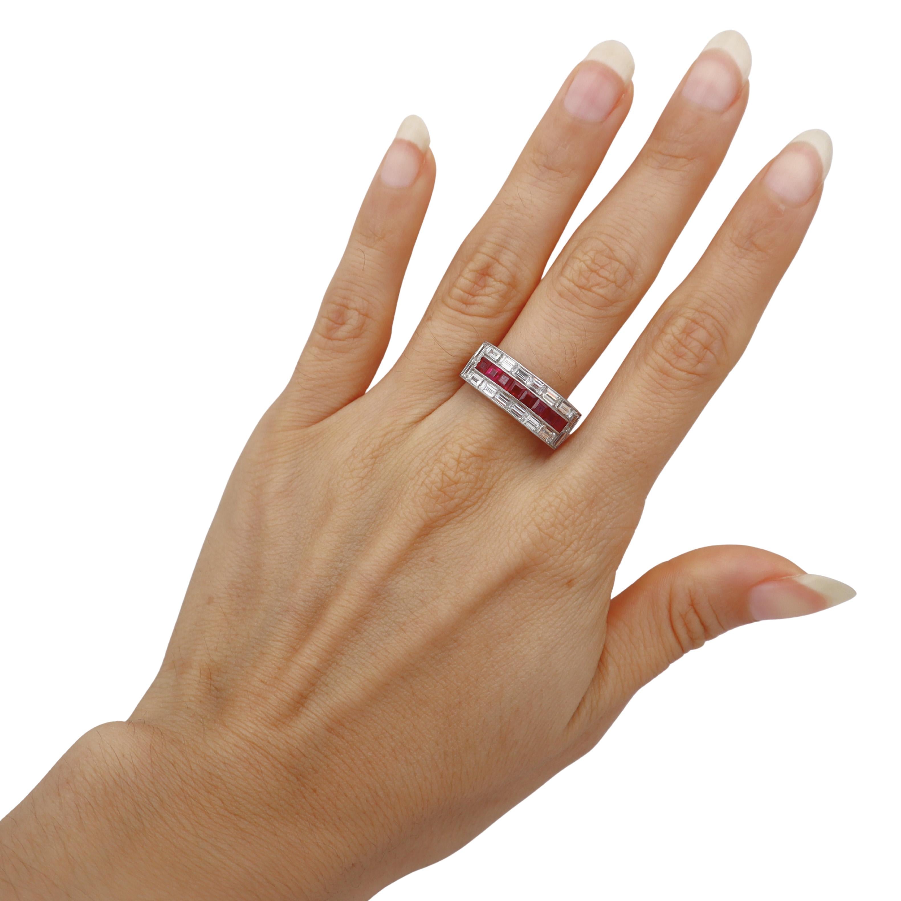 This spectacular Art Deco ring showcases the era's bold geometric design, crafted in lustrous platinum and featuring 8 gem-quality square-cut rubies totaling 1.60 carats, dramatically framed by 16 precision-cut baguette diamonds weighing 3.00 carats in exceptional VVS-VS clarity and F-G color, with additional diamonds adorning the shoulders. The striking contrast of vibrant red rubies against icy white diamonds creates a mesmerizing checkerboard pattern that epitomizes Art Deco's love for geometric symmetry and bold color combinations.