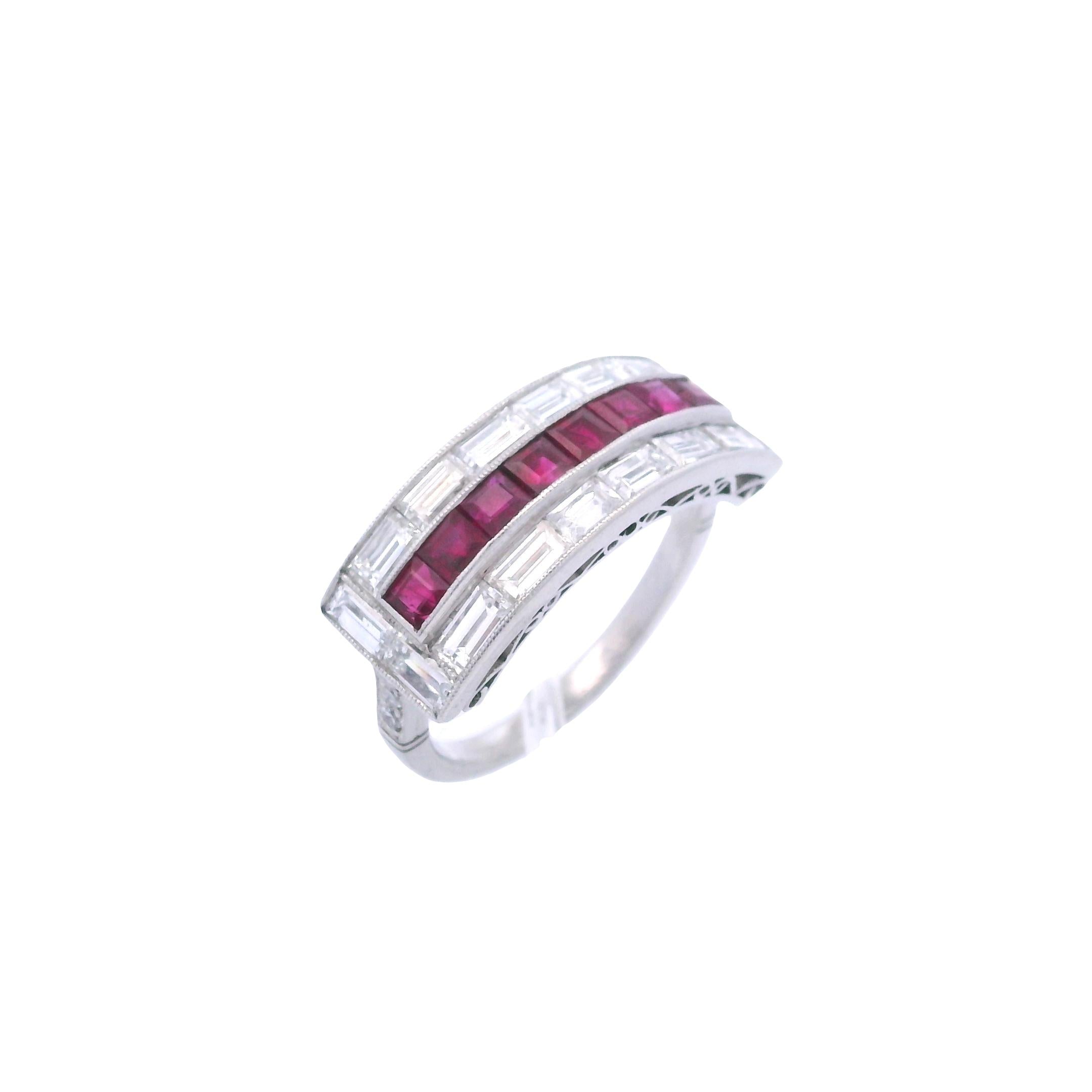 The exceptional quality of the baguette diamonds, with their premium F-G color and VVS-VS clarity grades, ensures maximum brilliance and fire that beautifully complements the rich red rubies.