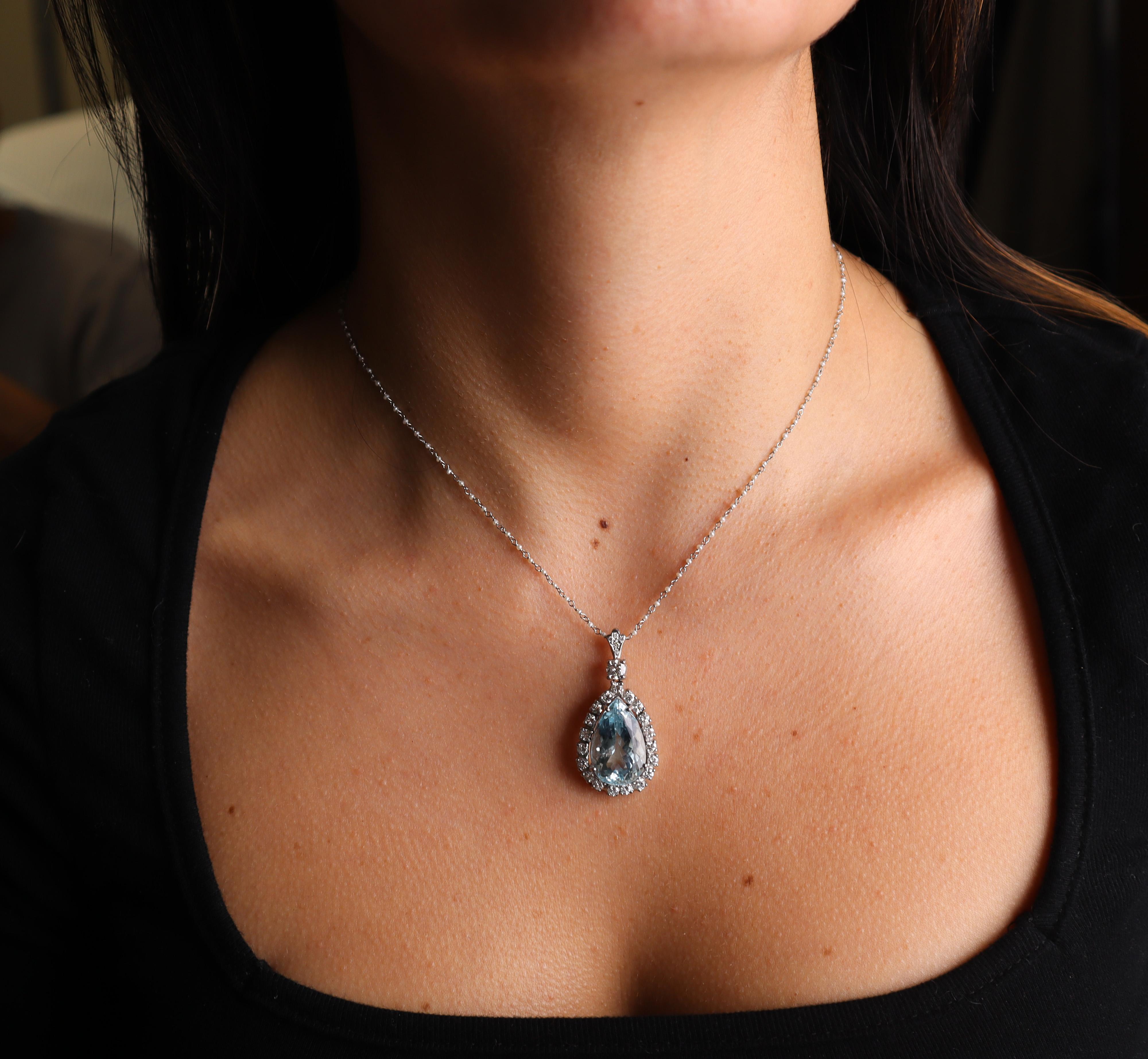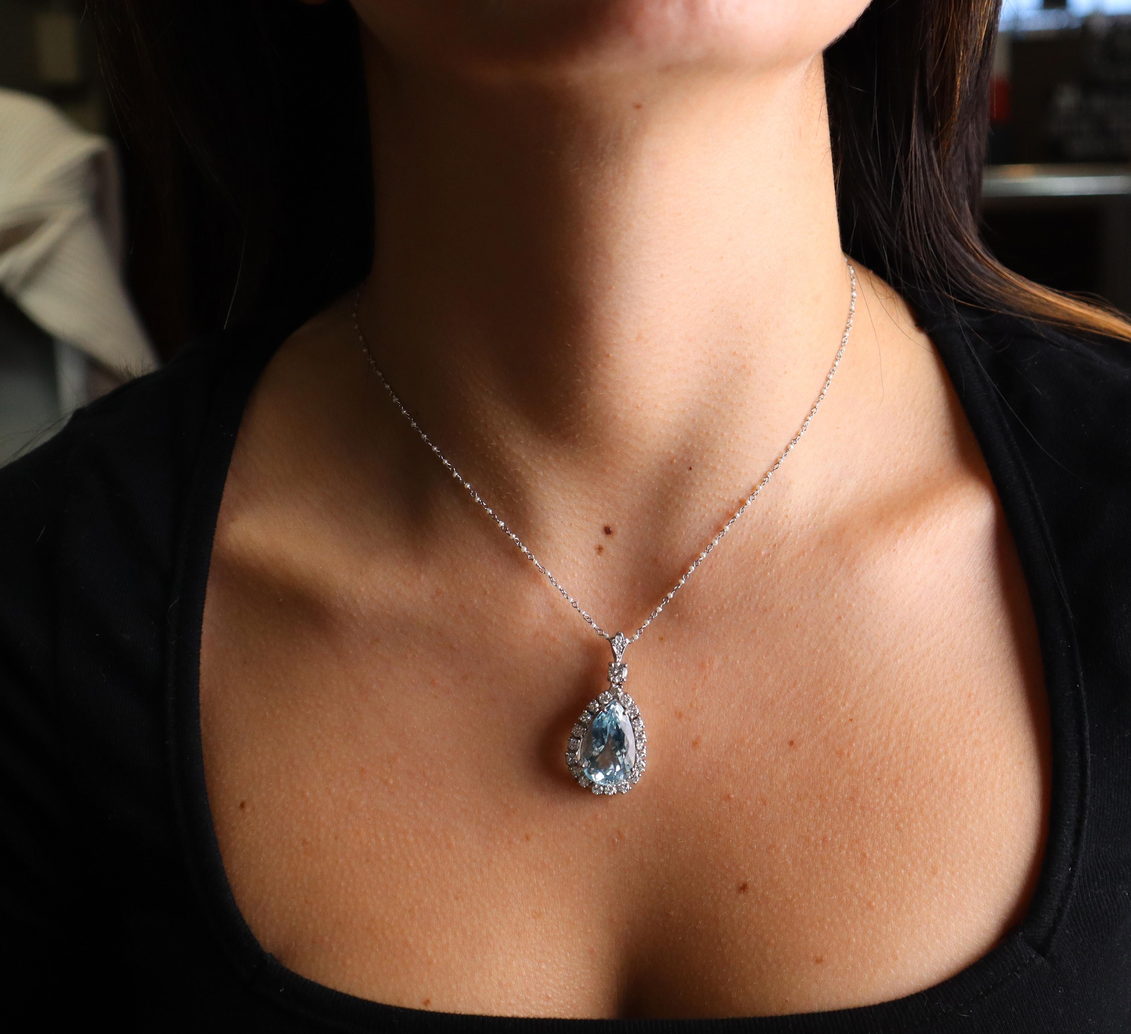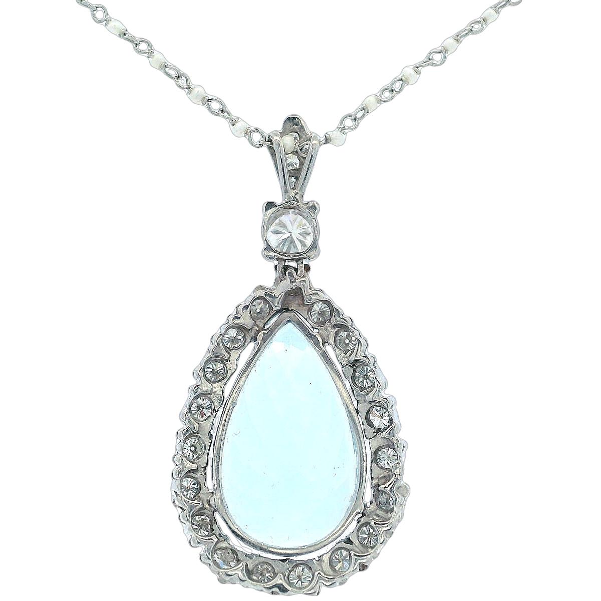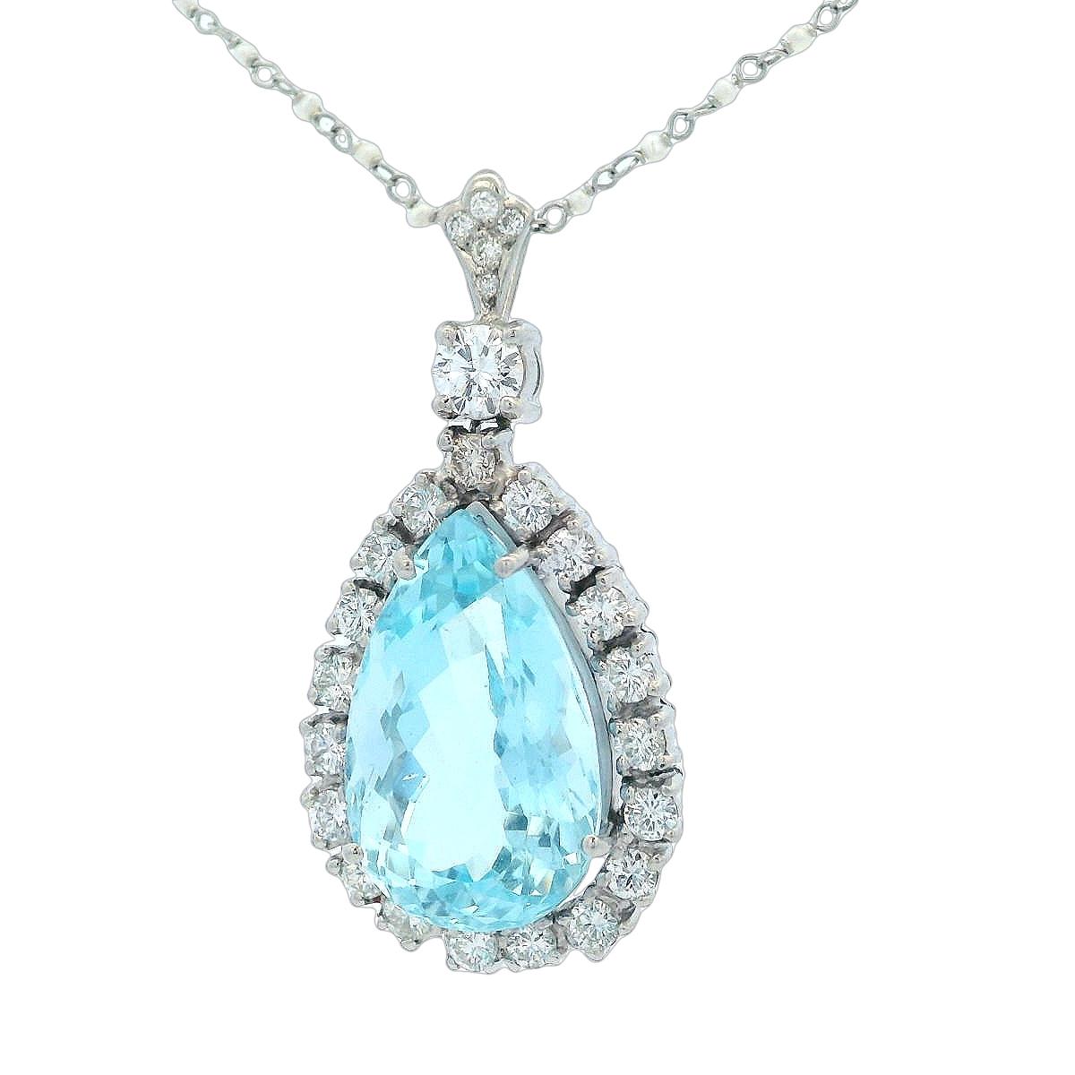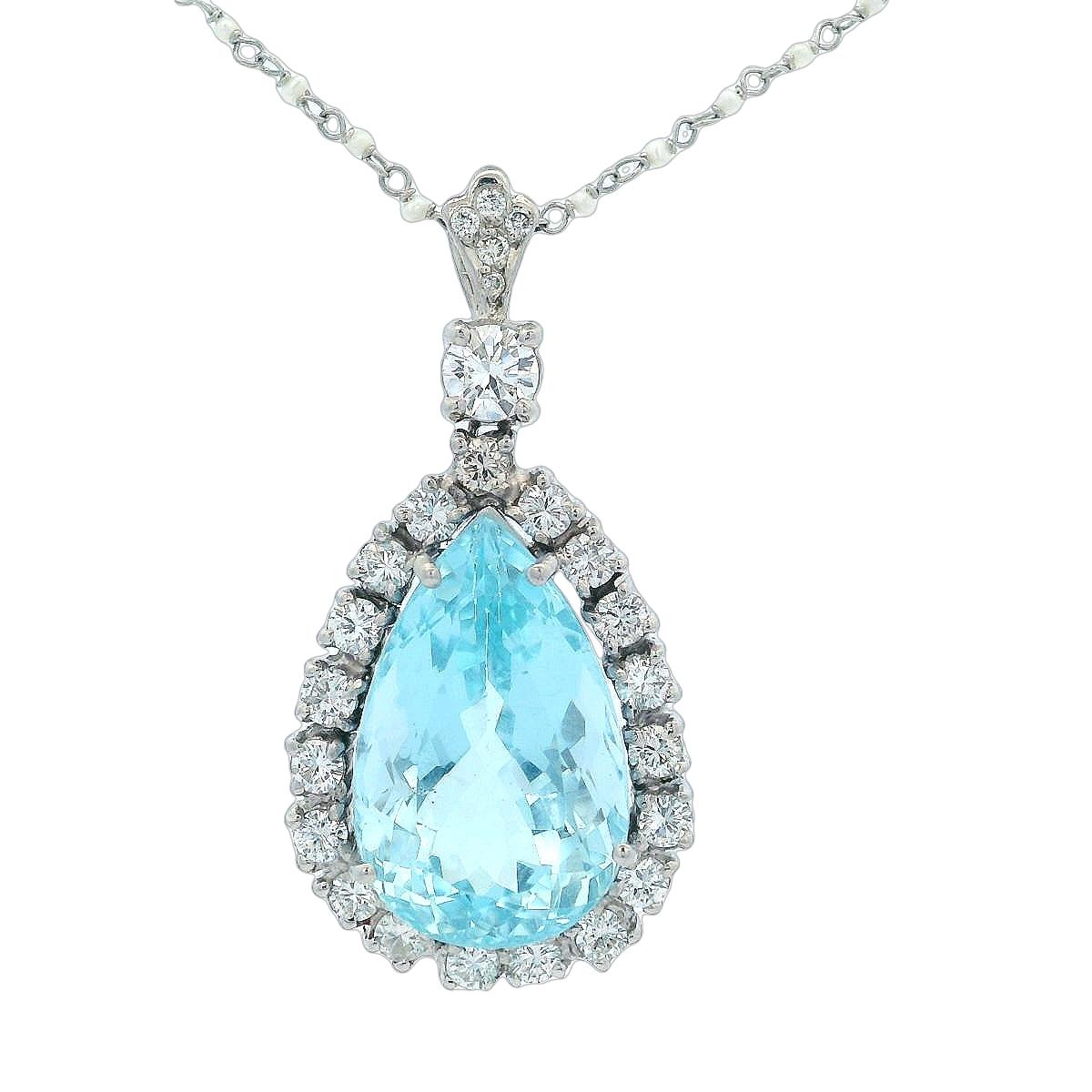 This exquisite Estate Pendant Necklace is crafted in platinum and features a stunning pear-shaped aquamarine weighing approximately 12.50 carats. The aquamarine is surrounded by round cut diamonds totaling about 1.20 carats, with an F-G color grade and VS clarity, adding brilliant sparkle.