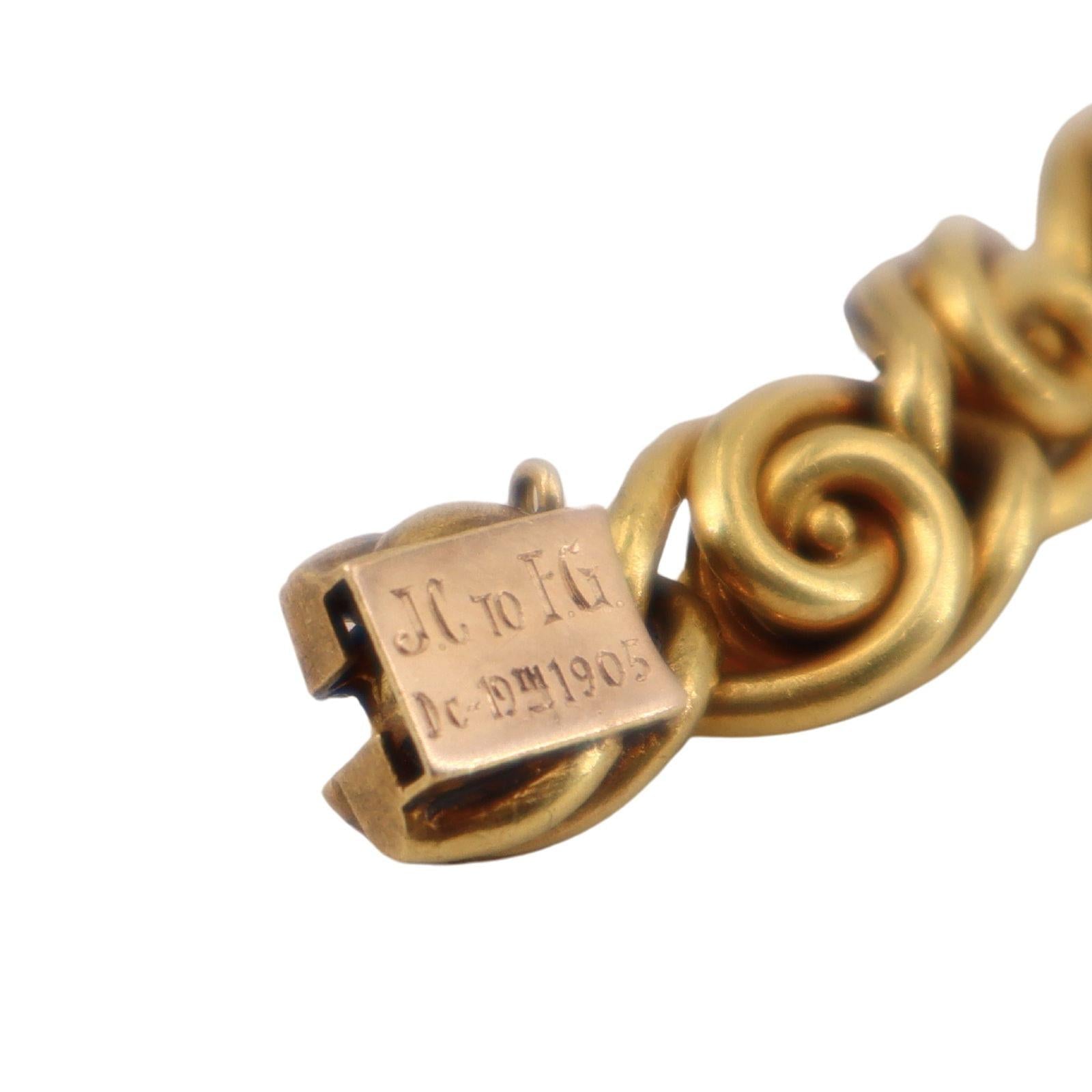 The piece is marked with the French eagle head, signifying its quality and authenticity, and reflects the meticulous artistry and refined taste of early 20th-century French goldsmiths. Perfect for collectors and connoisseurs of antique jewelry, this bracelet is a wearable work of art.