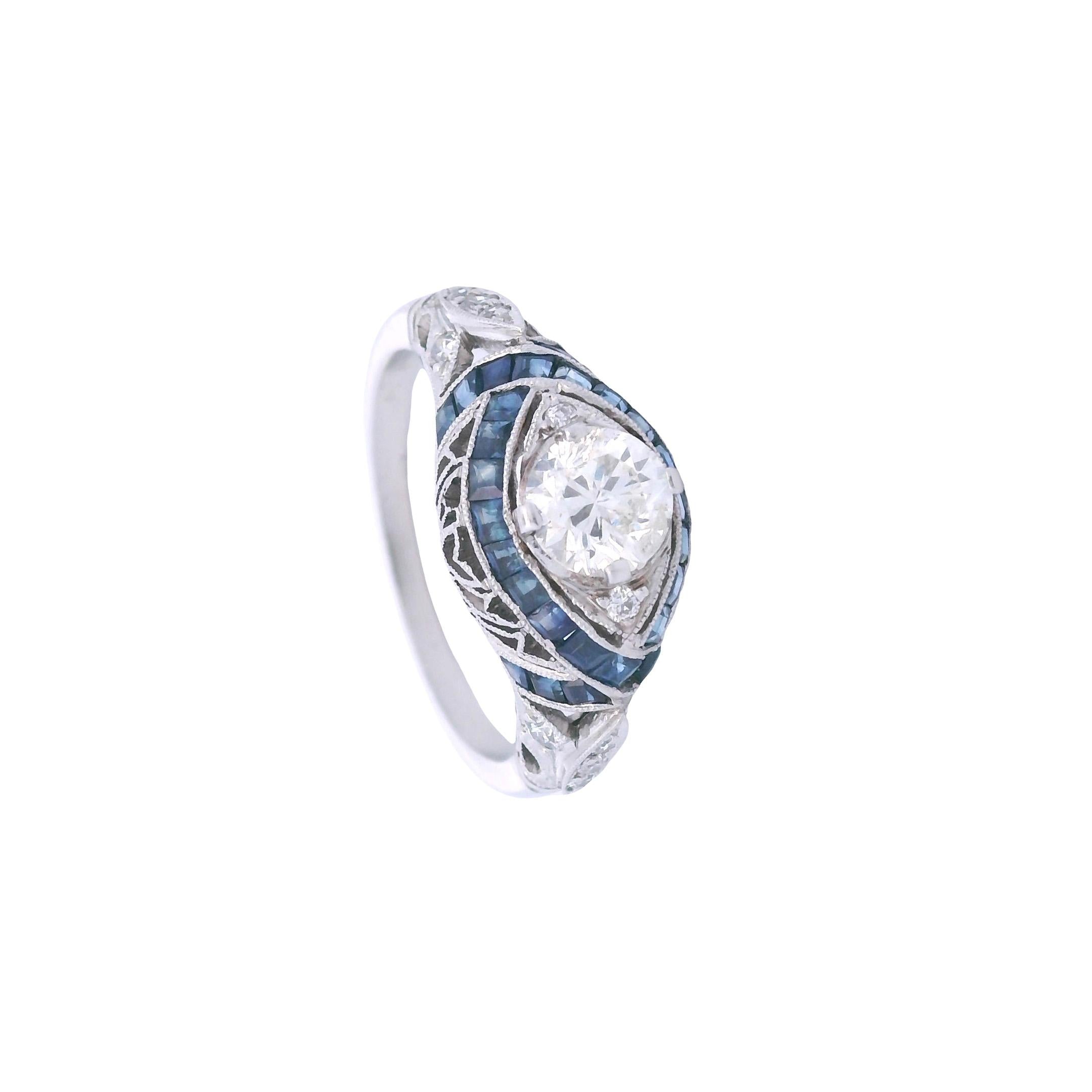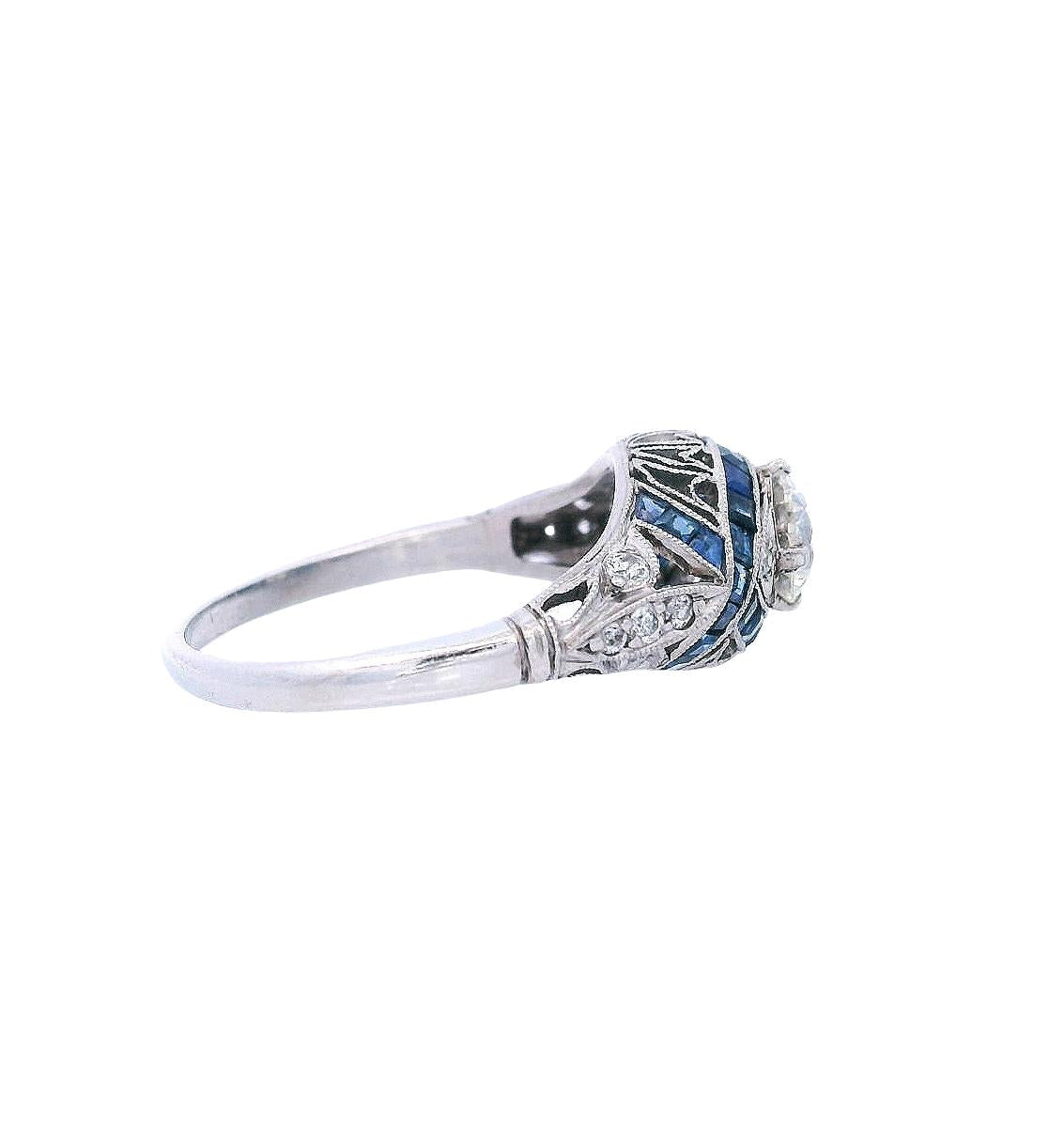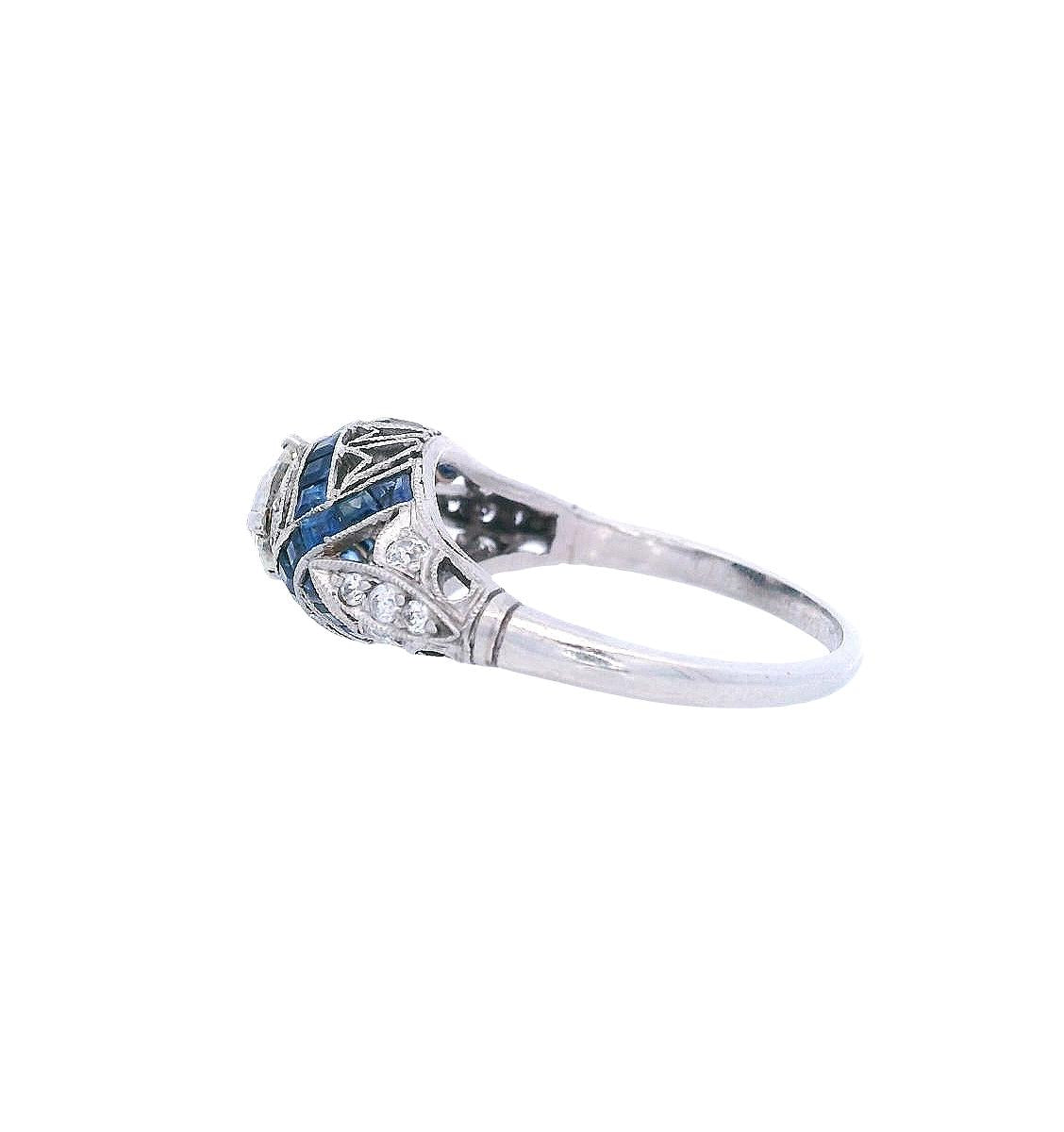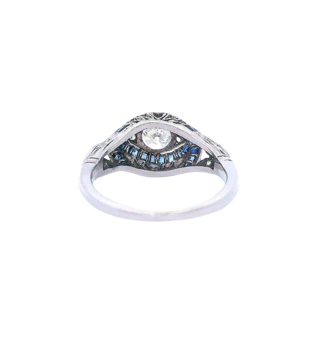 This exquisite Art Deco filigree ring showcases the era's masterful craftsmanship in lustrous platinum, featuring a beautiful 0.75-carat center diamond complemented by 0.16 carats of accent diamonds and 0.60 carats of vibrant blue sapphires. The intricate filigree work creates delicate patterns that frame the gemstones with ethereal beauty, epitomizing the sophisticated artistry of the 1920s.