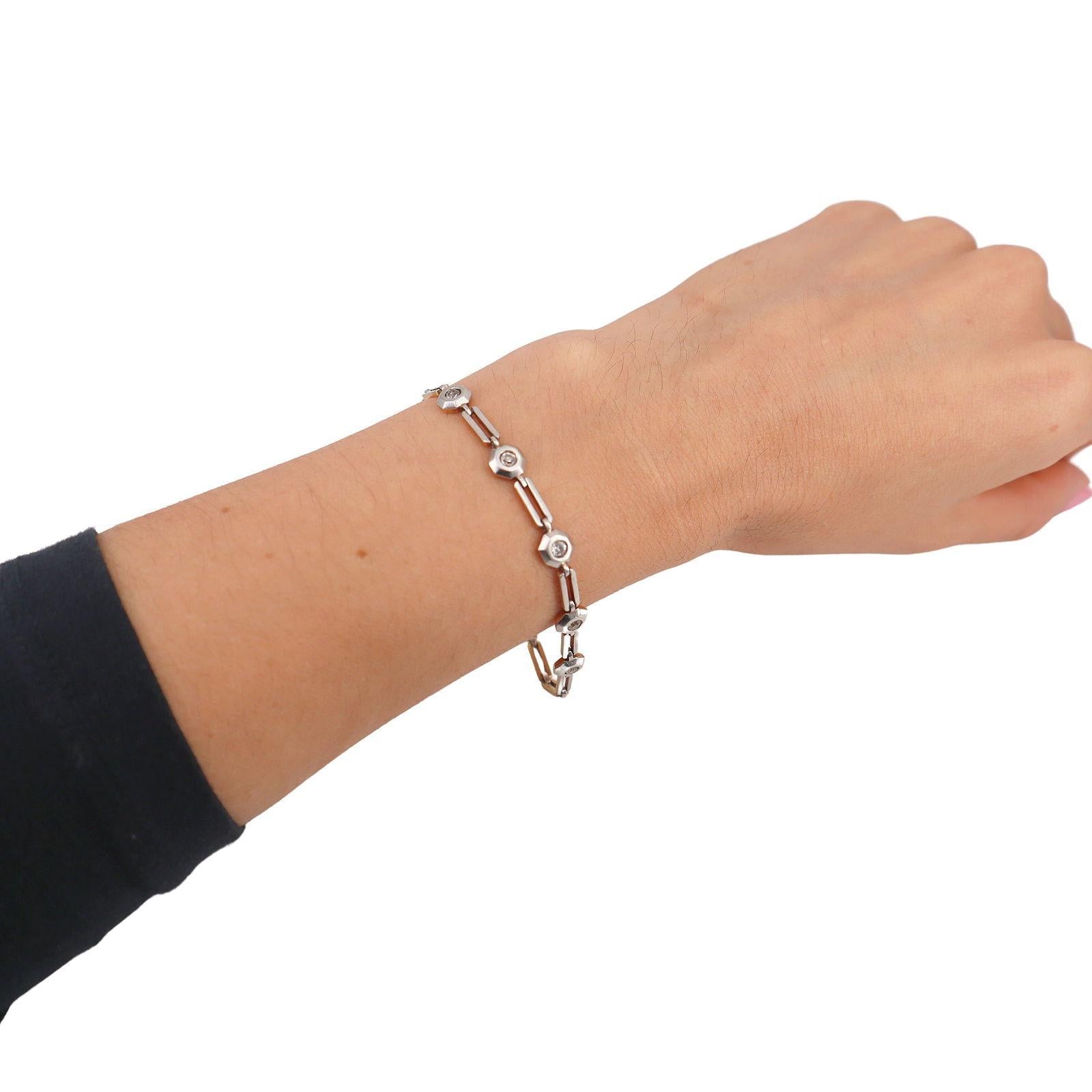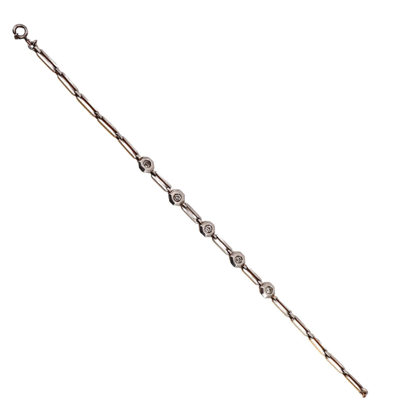 This elegant Art Deco bracelet, dating from circa 1915–1920s, is expertly crafted in 18kt yellow gold with platinum on top. The design features five natural old mine-cut diamonds, together weighing approximately 0.50 carats (J–K color, SI1 clarity), adding subtle brilliance and vintage charm to the geometric lines of the era. This bracelet is a refined example of early 20th-century craftsmanship and timeless Art Deco style.