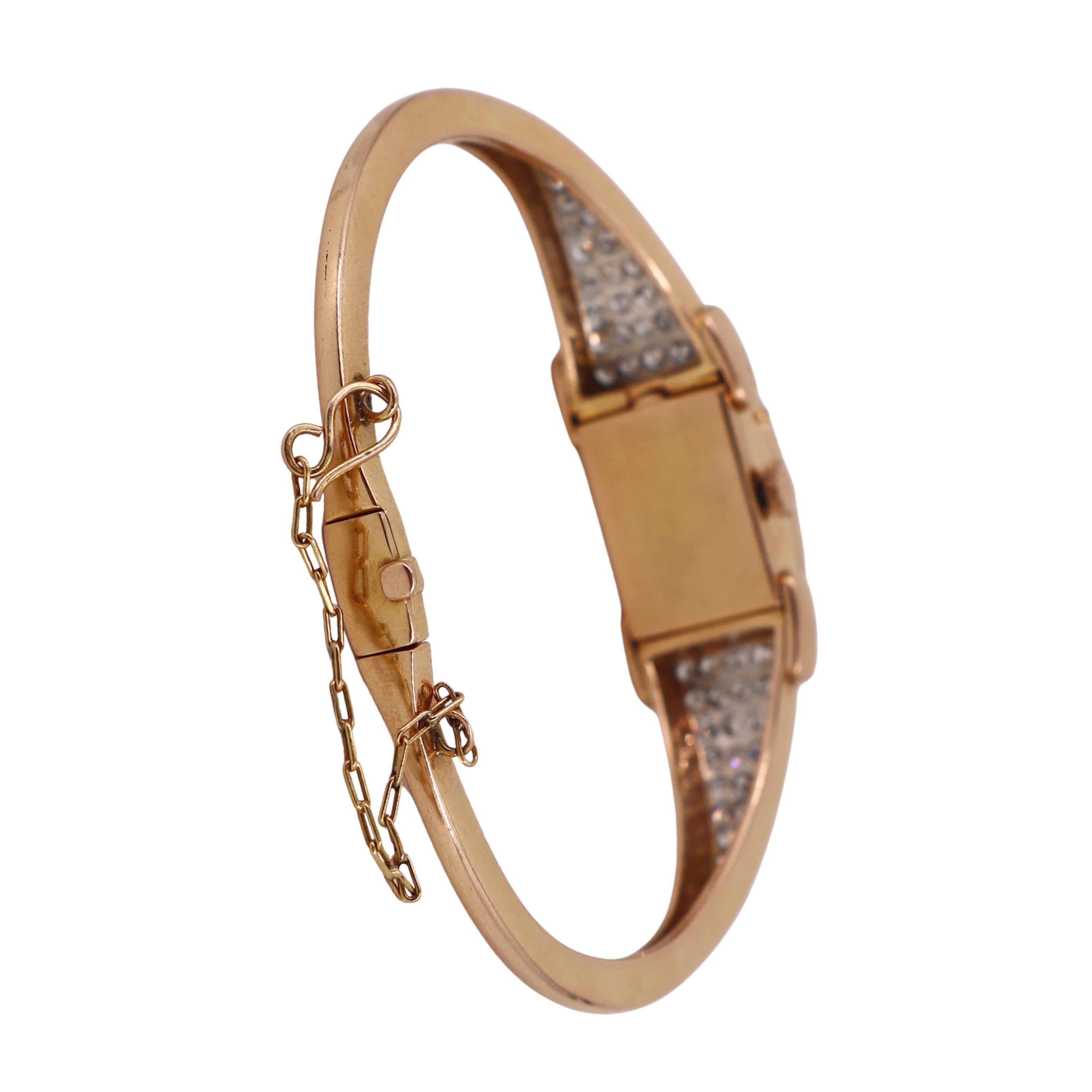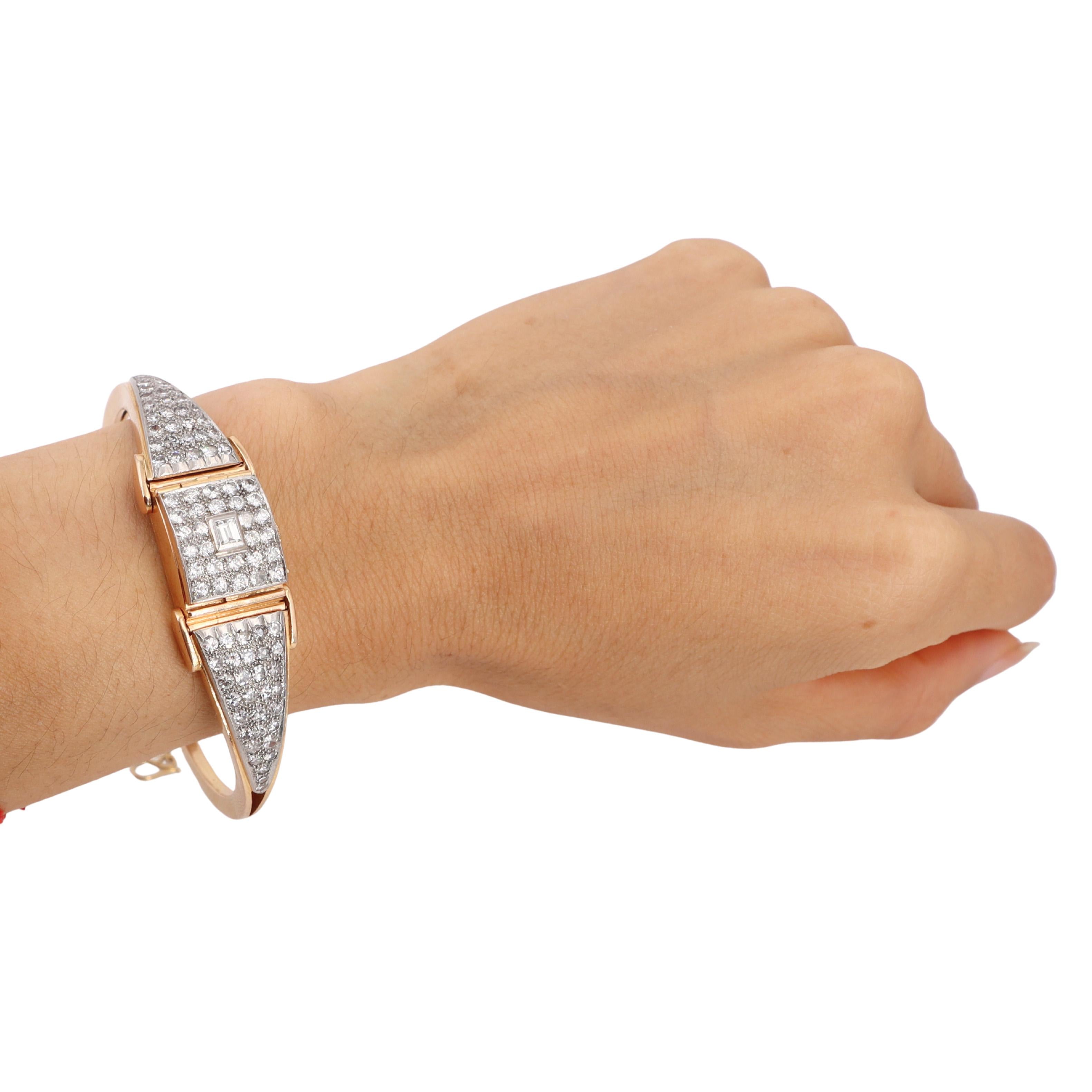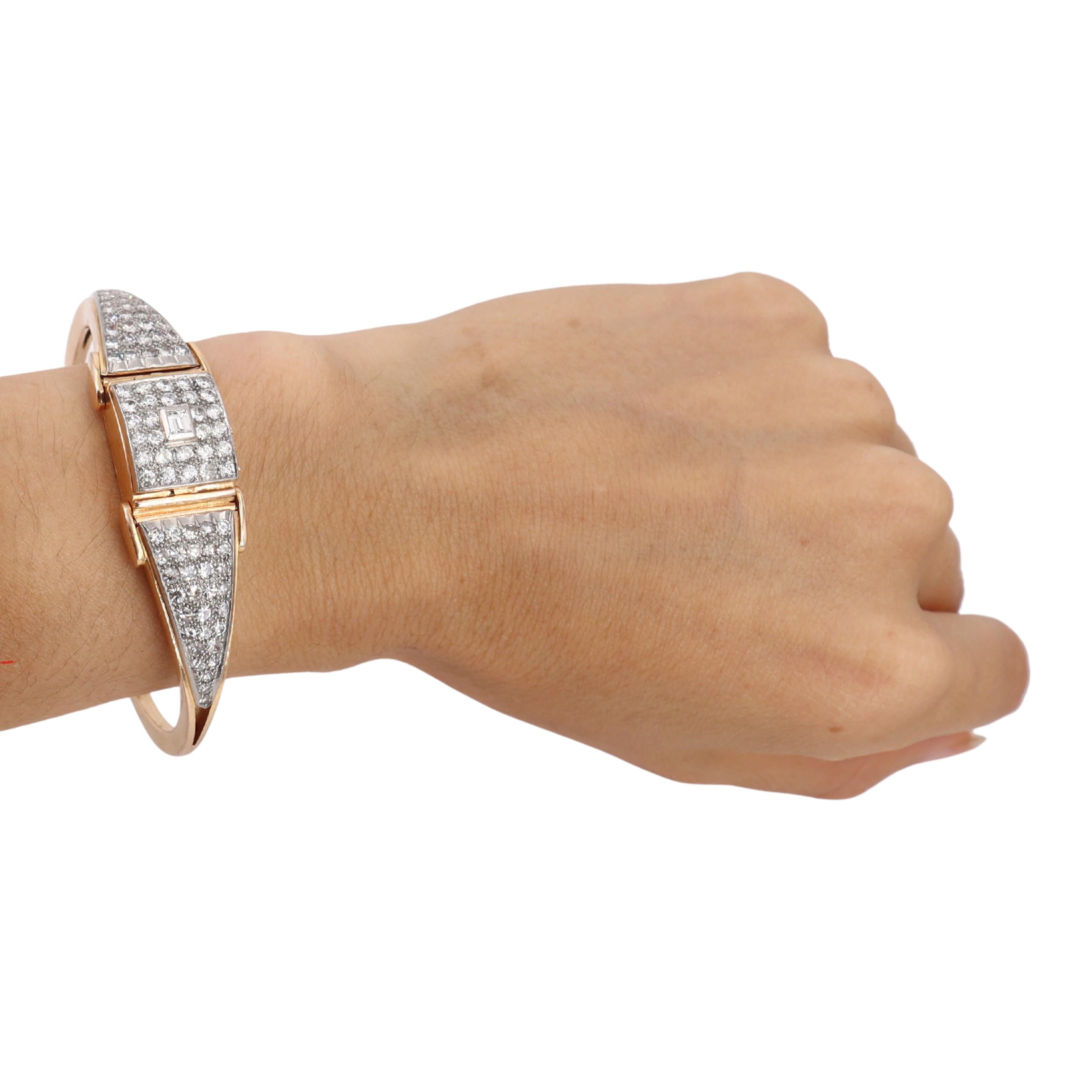 This extraordinary circa 1920s Art Deco bangle bracelet represents the pinnacle of Jazz Age luxury, expertly crafted in lustrous 18kt rose gold with platinum detailing and featuring a pavé setting of single-cut diamonds totaling 2.70 carats in G-H color and VS clarity, beautifully complemented by center baguette-cut diamonds and old-cut diamonds weighing 1.70 carats in H color and VS clarity. The remarkable piece conceals a manual-winding Universal Genève watch movement, combining timeless elegance with functional artistry in true Art Deco fashion.