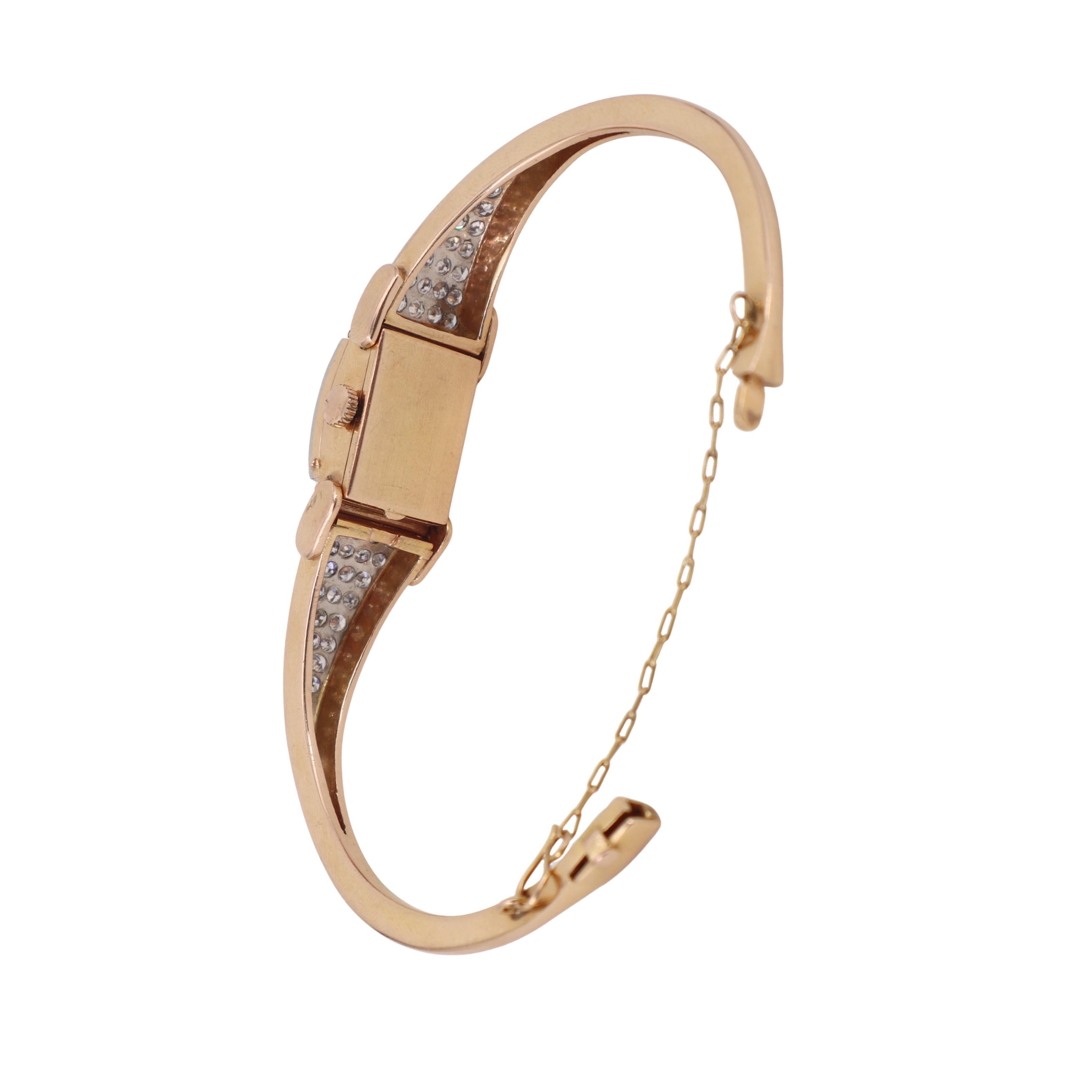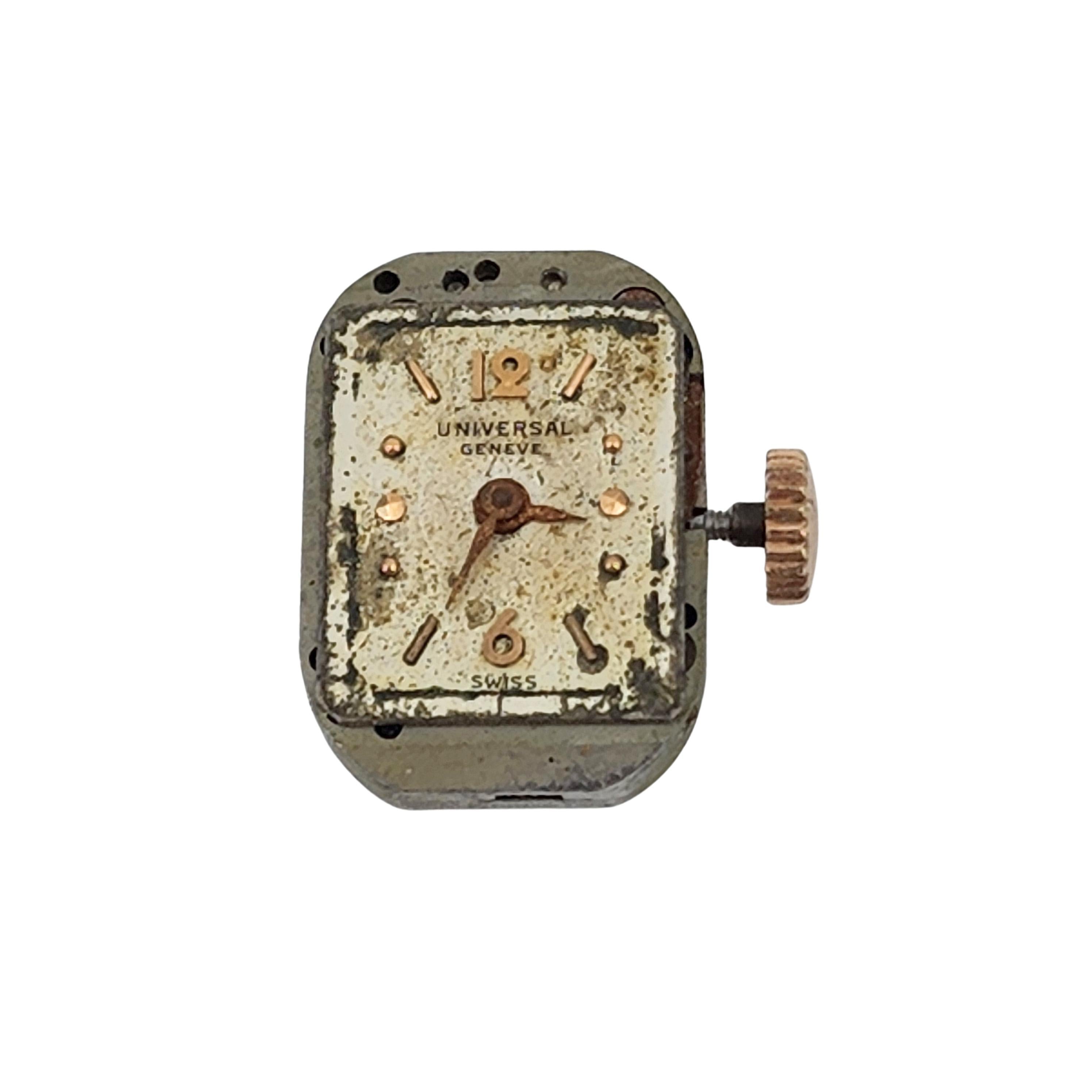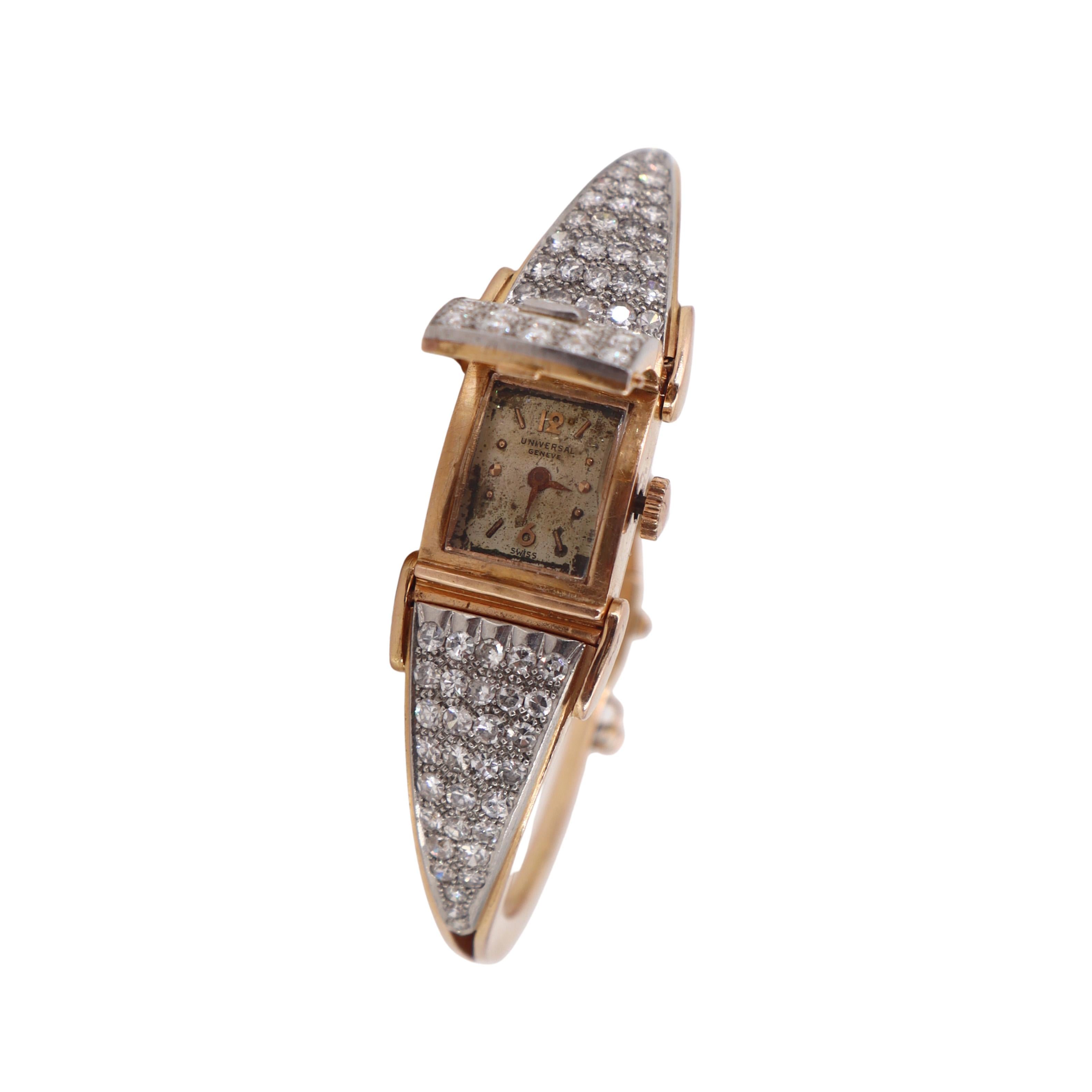 CONDITION & AUTHENTICITY: The overall condition of this piece is excellent. There is no damage to the rose gold or platinum settings. All diamonds are securely set in their pavé mountings, and the Universal Genève watch movement functions properly, displaying exceptional period craftsmanship.