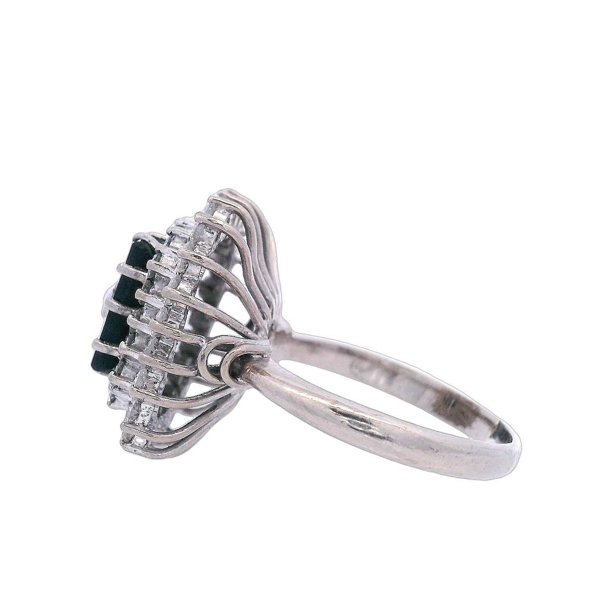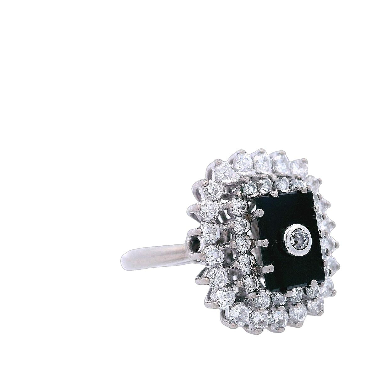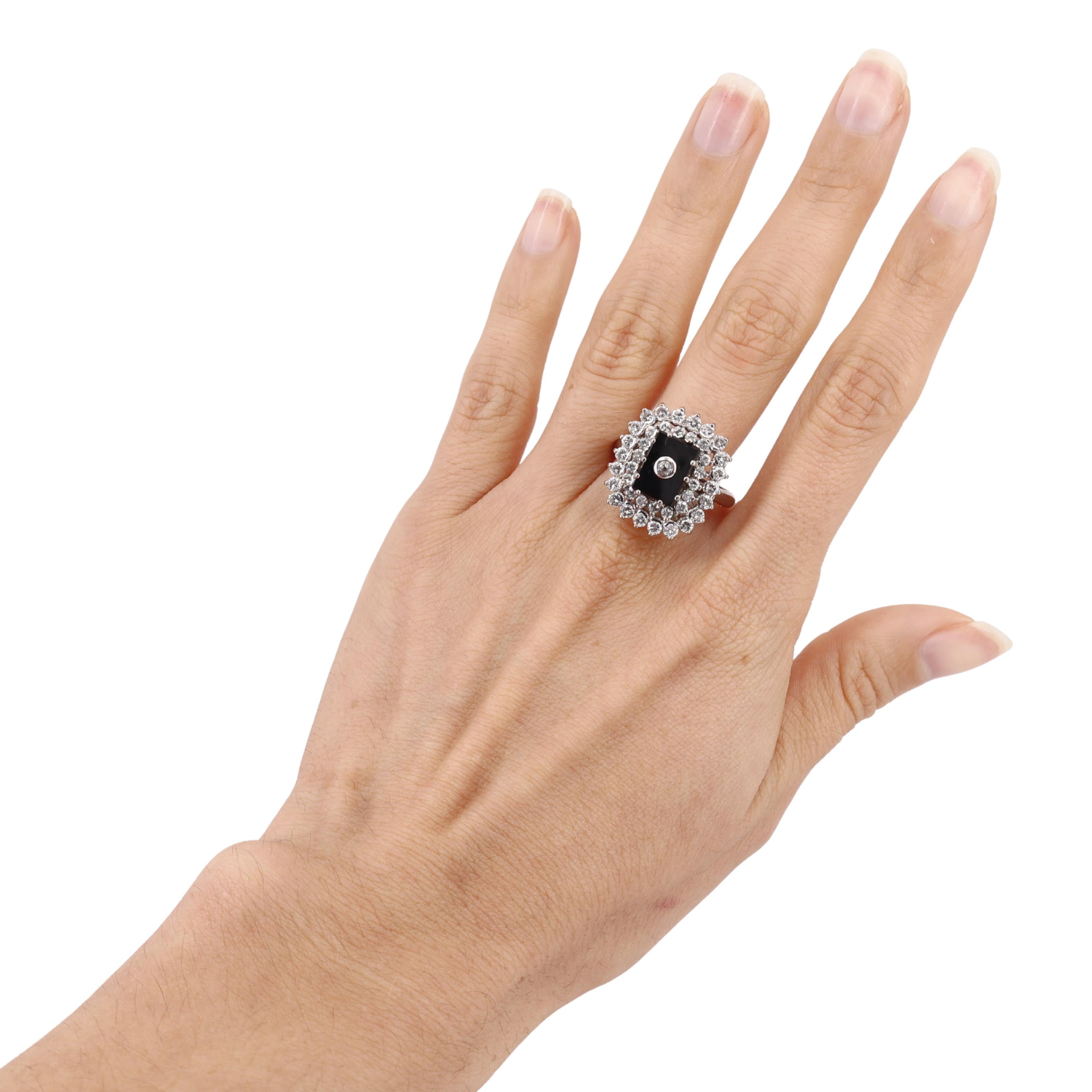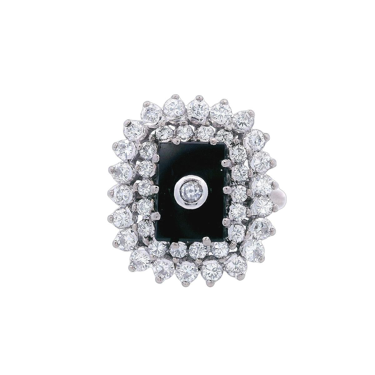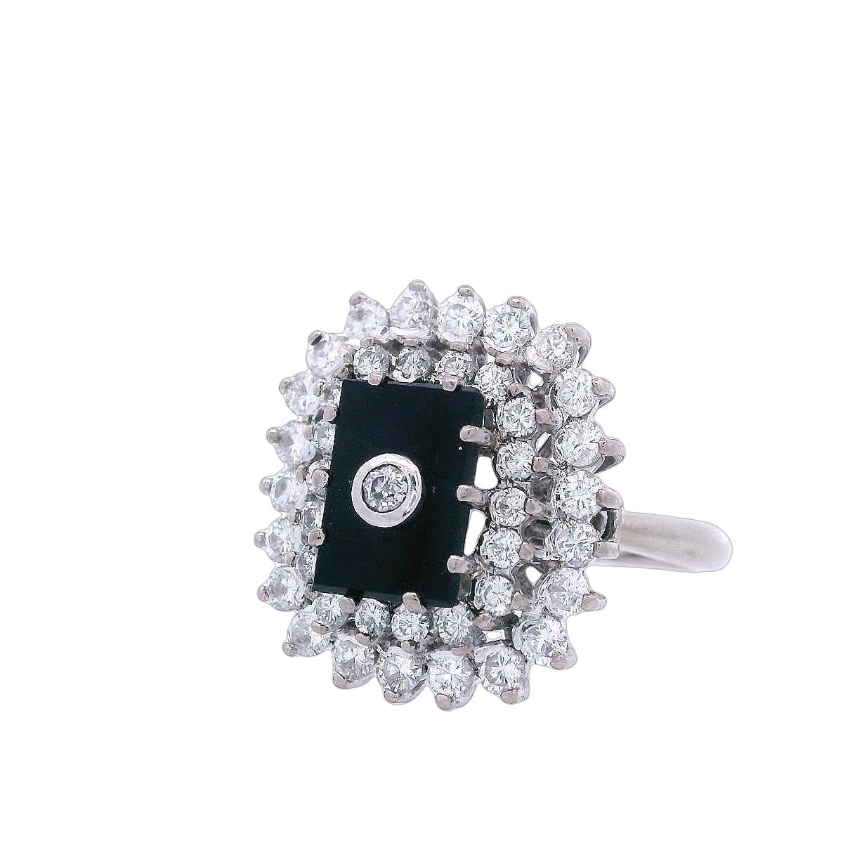 Step back in time to the elegance of the 1940s with this stunning Art Deco ring. Crafted from 18kt white gold, this exquisite piece showcases a center rectangular onyx, which serves as a striking focal point. The onyx is beautifully complemented by round cut diamonds that weigh approximately 1.30 carats.