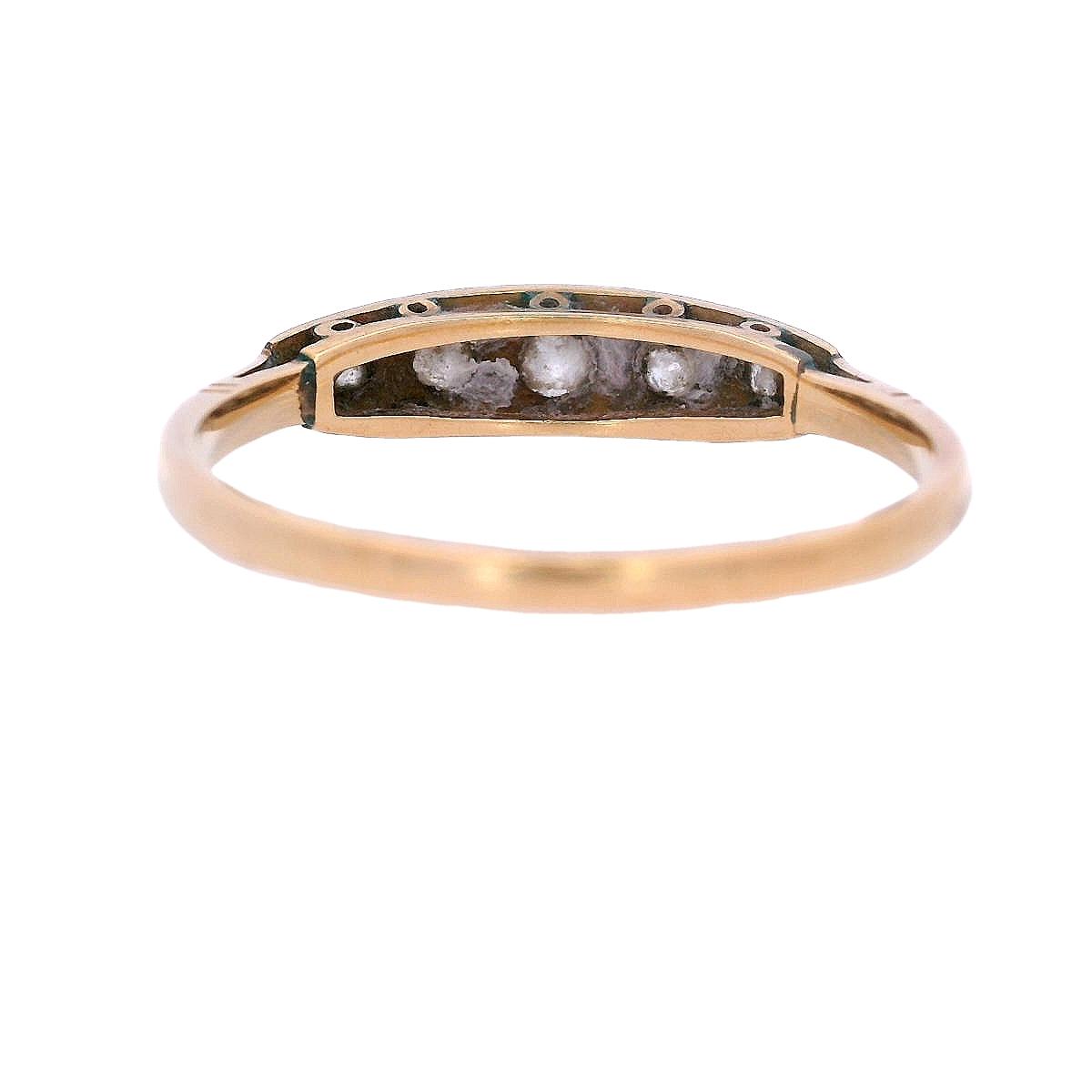 Adorning the ring are five graduated old mine-cut diamonds, with a total weight of approximately 0.26 carats. These diamonds are graded H-J in color and SI in clarity, offering a lovely combination of vintage character and radiance. This captivating piece is a true testament to the enduring sophistication of Art Deco jewelry and a perfect addition to any discerning collector's repertoire.