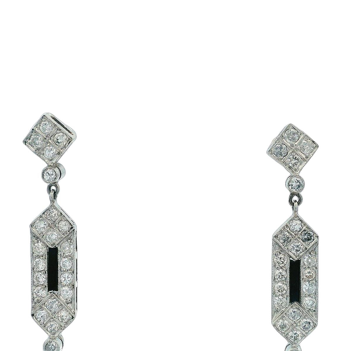 Art Deco Style Platinum hanging Earrings with Diamonds and Onyx