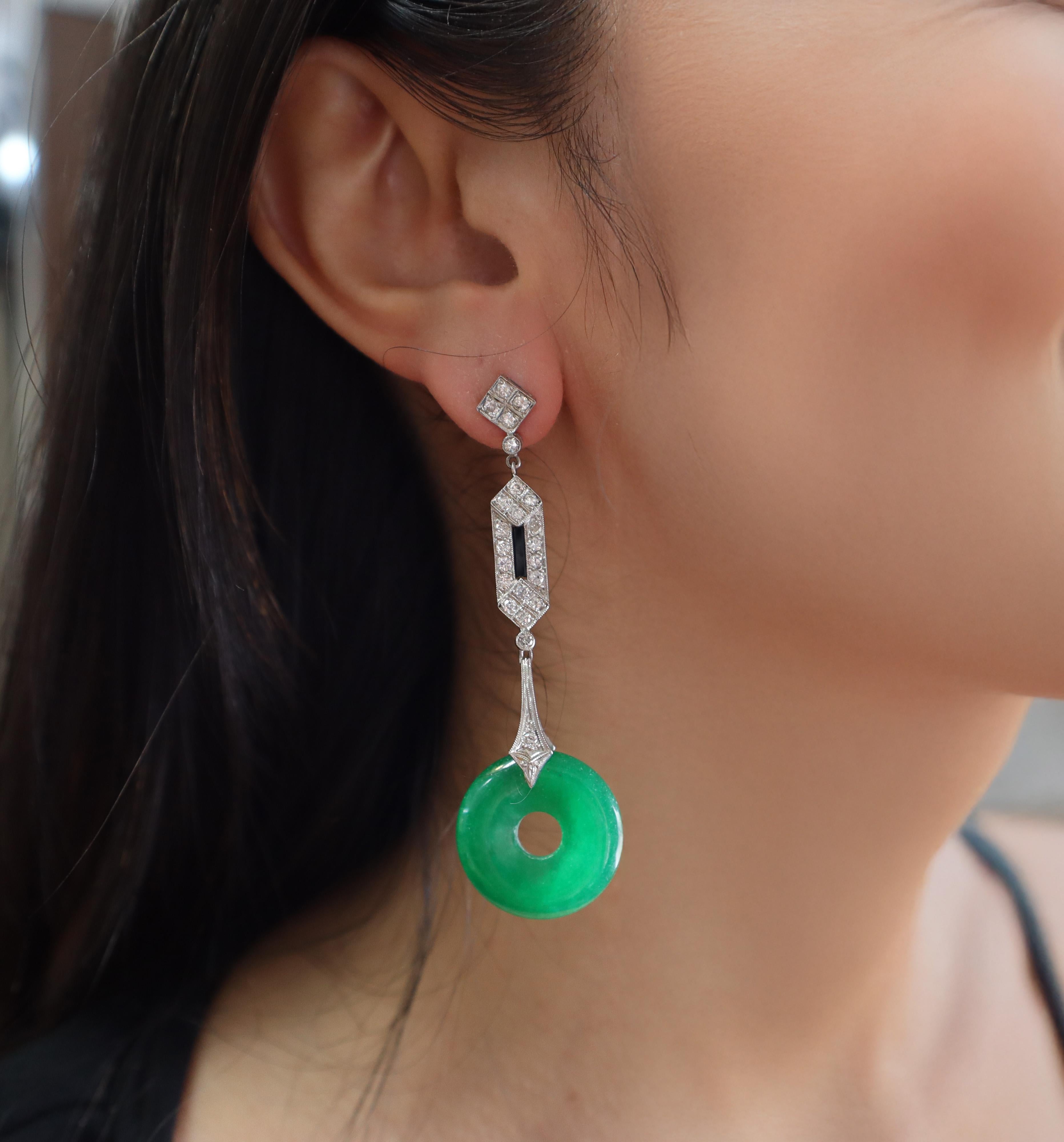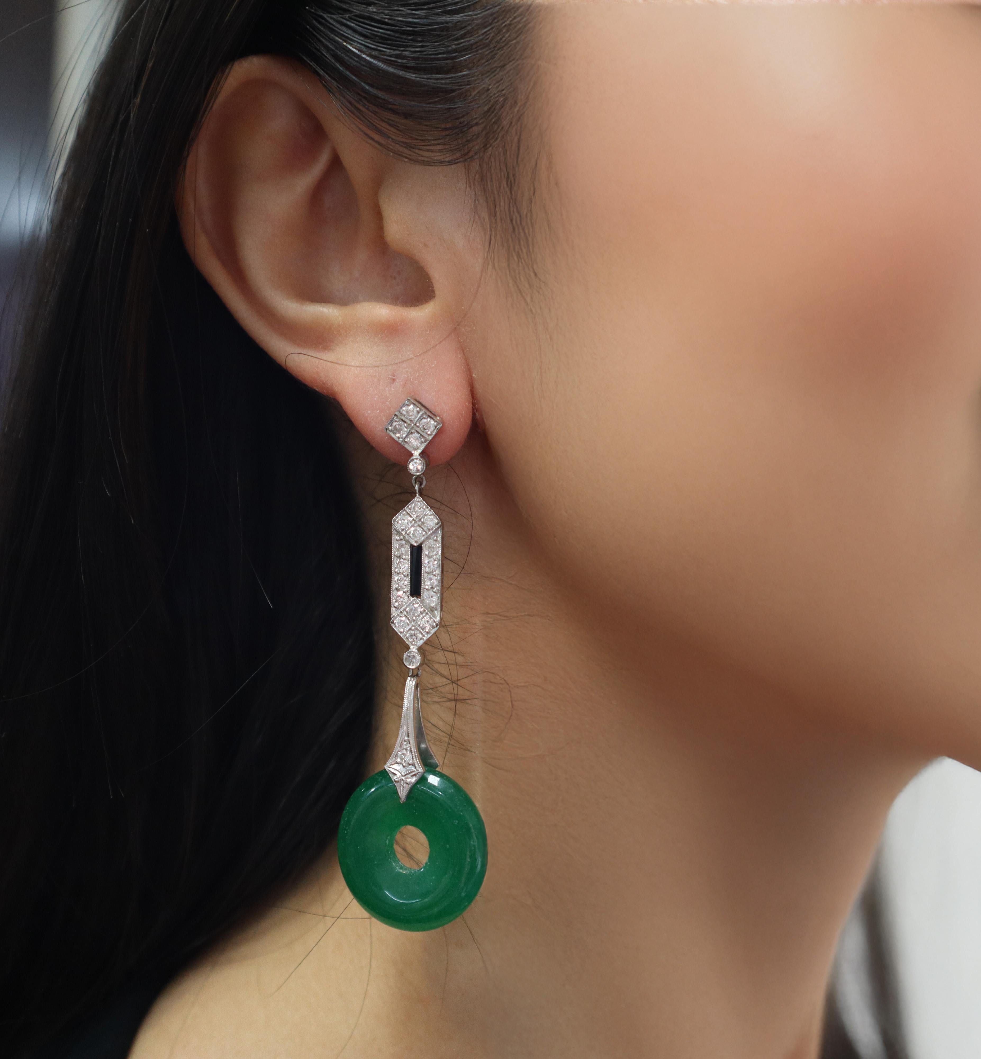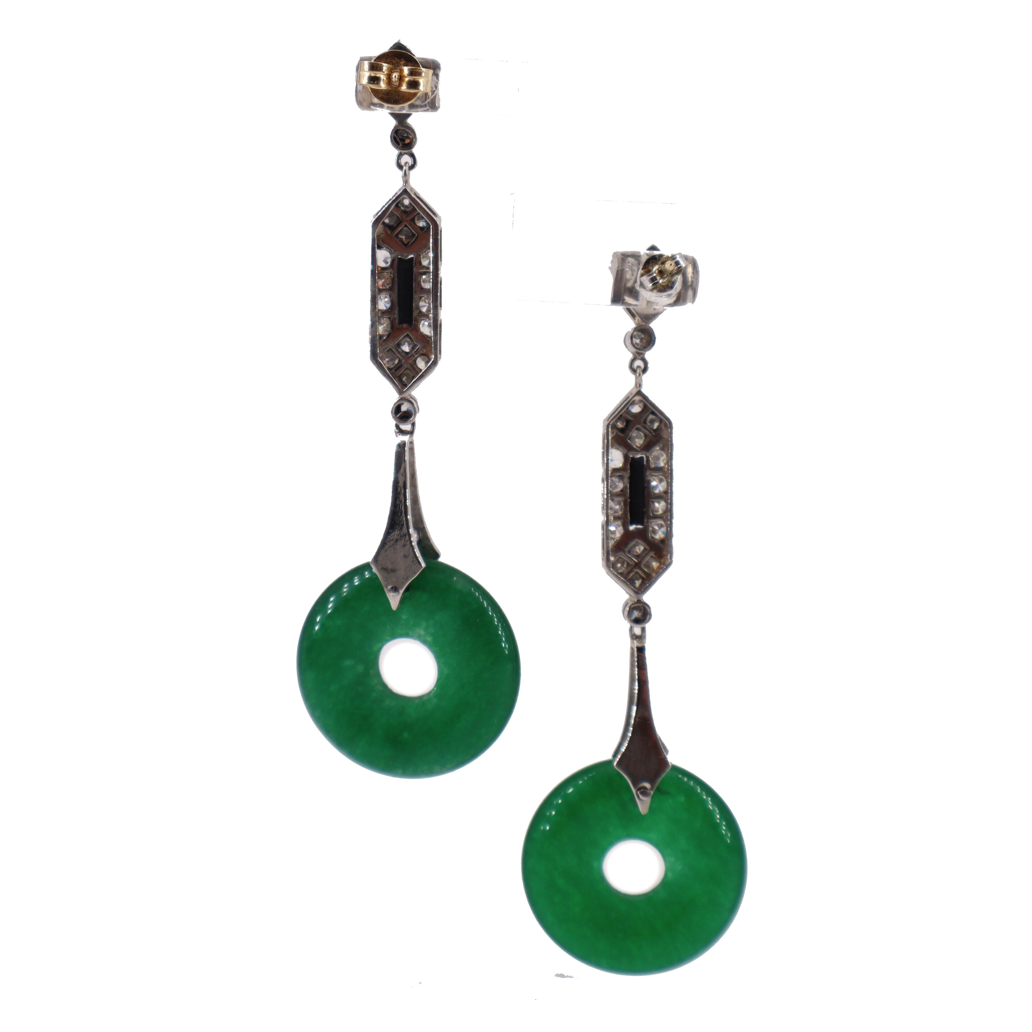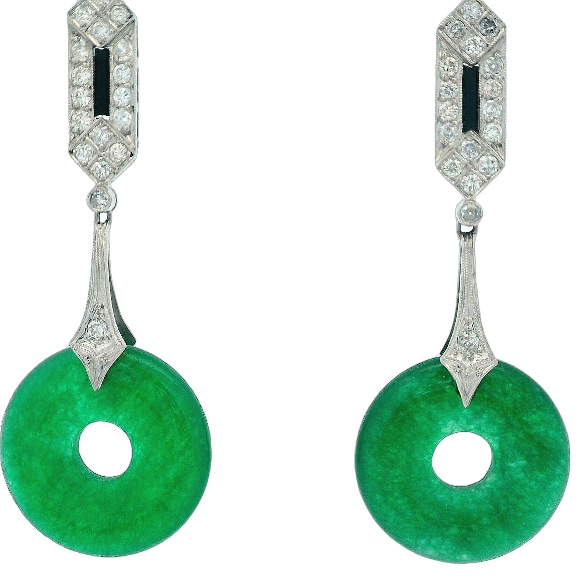 The design is beautifully enhanced by two pieces of black onyx and two pieces of round polished dyed green quartz, creating a striking contrast that exudes elegance. These earrings are a perfect blend of sophistication and vintage charm, making them an ideal accessory for both formal occasions and everyday wear. Elevate your jewelry collection with these exquisite creations that embody the timeless allure of the Art Deco era.