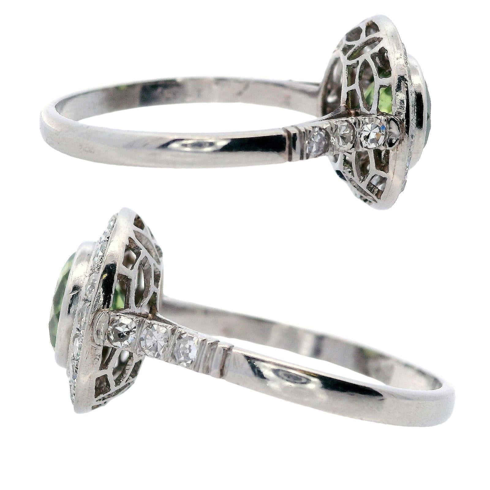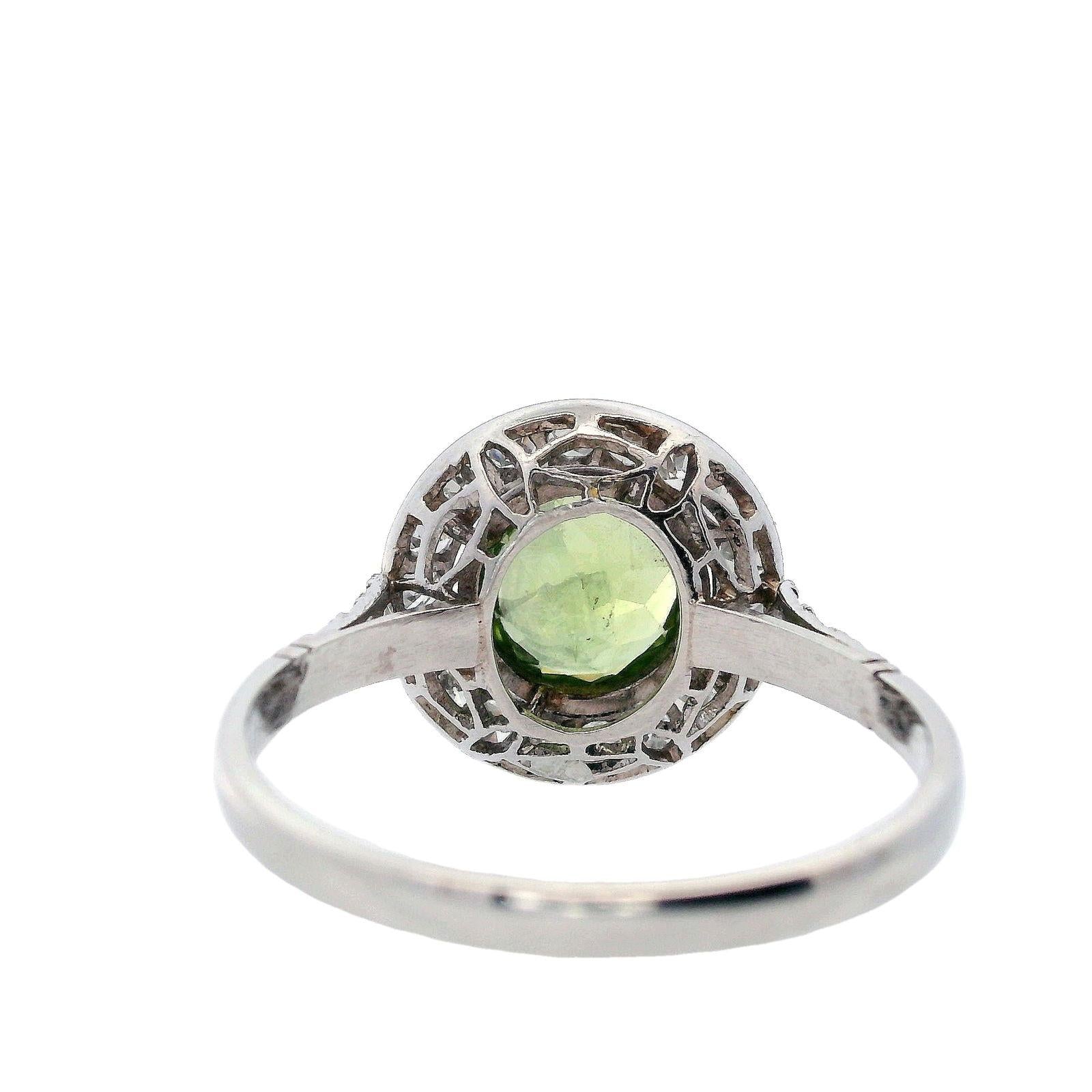 Introducing our stunning Halo Platinum Ring, designed to capture the essence of elegance and sophistication. At its center, a mesmerizing Round cut Peridot weighing approximately 1.40 carats shines brilliantly, showcasing its vibrant green hue. Surrounding this captivating gemstone is a halo of Single cut Diamonds, totaling approximately 0.50 carats, adding a dazzling sparkle to the piece. Each diamond is graded as colorless, ensuring a high-quality brilliance that enhances the overall design. The platinum band provides a luxurious and durable foundation, perfect for everyday wear or special occasions.