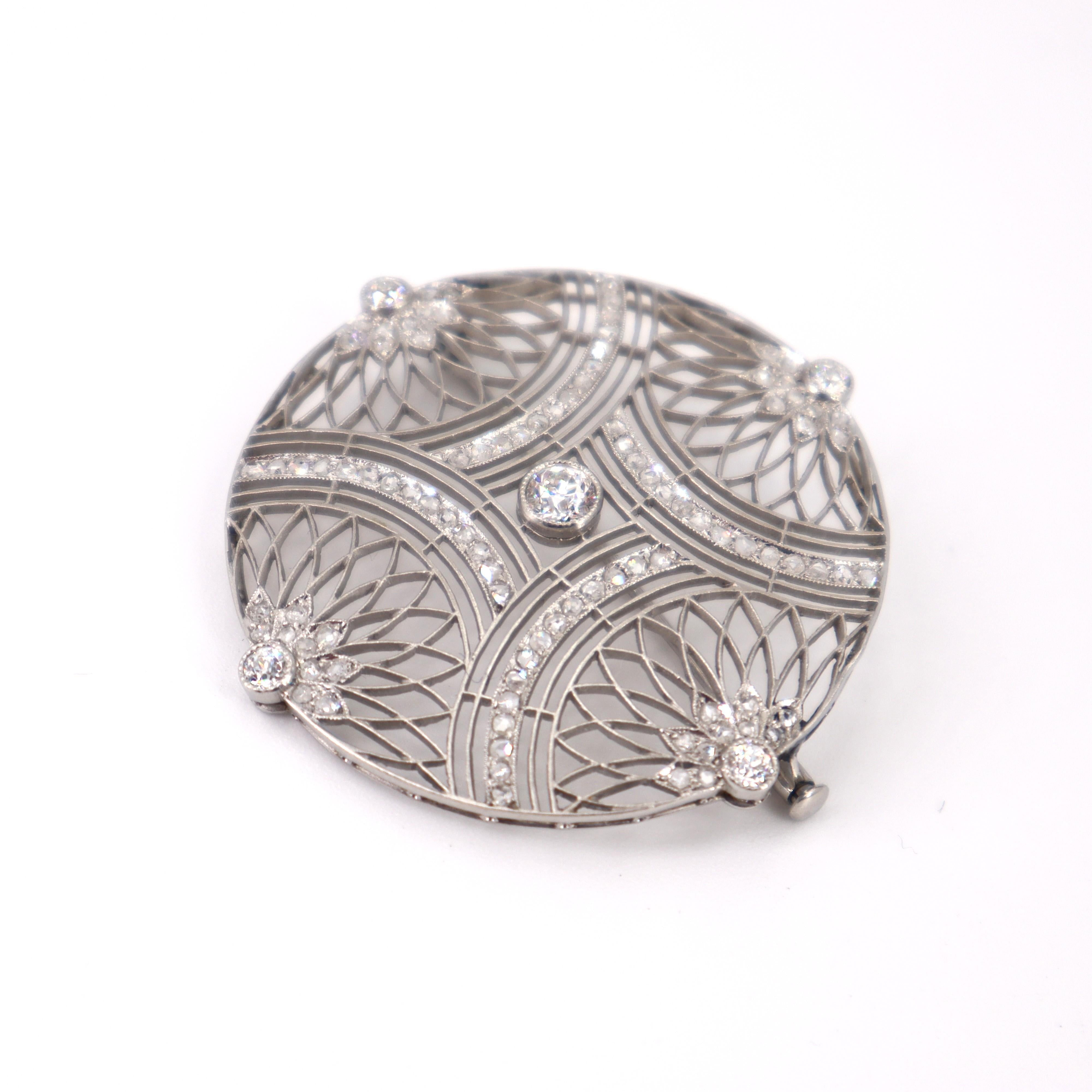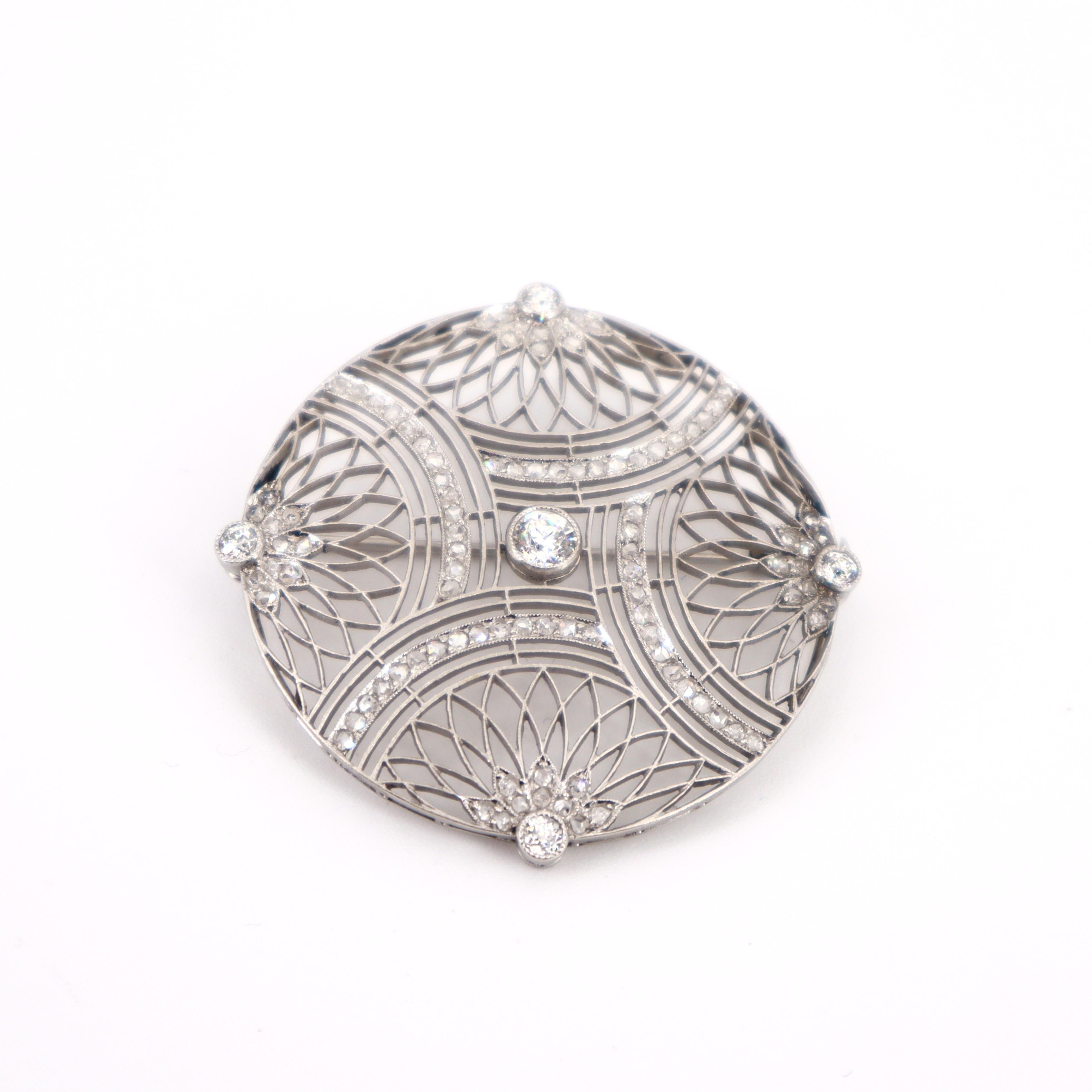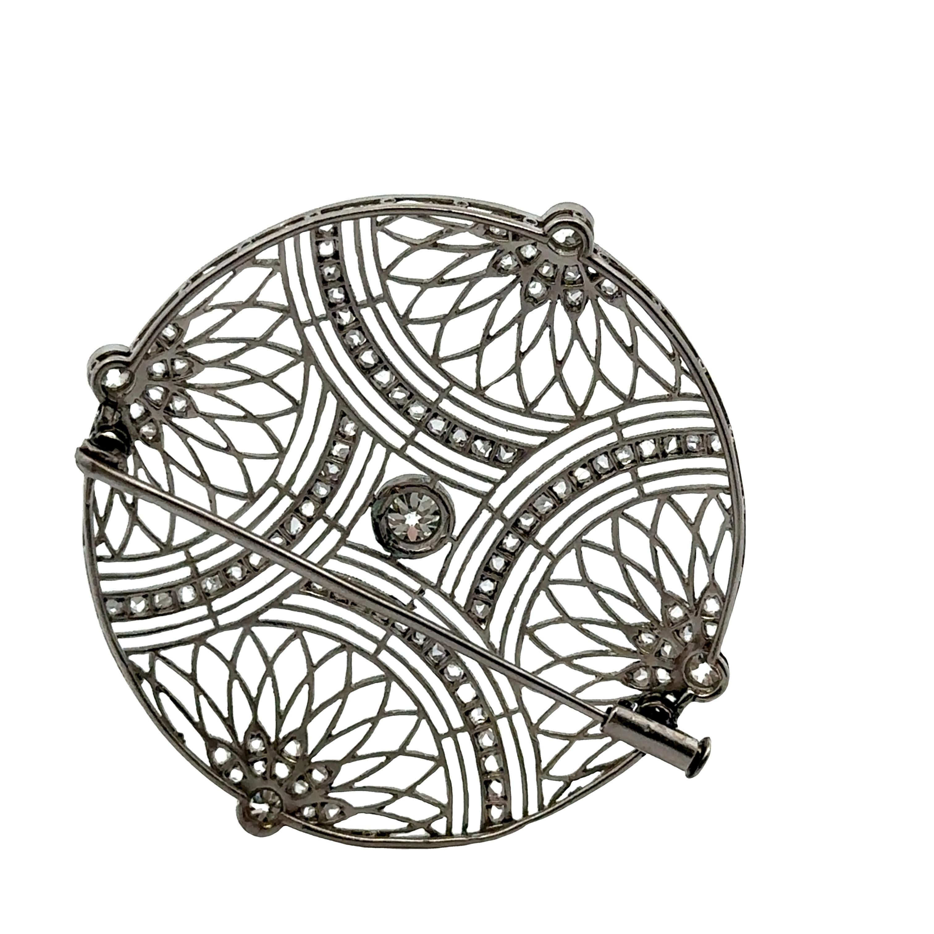 This exceptional Art Deco filigree brooch showcases the exquisite artistry and sophisticated craftsmanship of the Jazz Age, expertly crafted in luxurious platinum and featuring 5 dazzling old mine diamonds weighing 0.75 carats in H color and SI1 clarity as captivating centerpieces, beautifully surrounded by mesmerizing rose-cut diamonds totaling 1.00 carats. The delicate and intricate filigree pattern adds elegant sophistication reminiscent of the fine craftsmanship of the Art Deco period, while the substantial 1.60-inch diameter creates impressive presence.