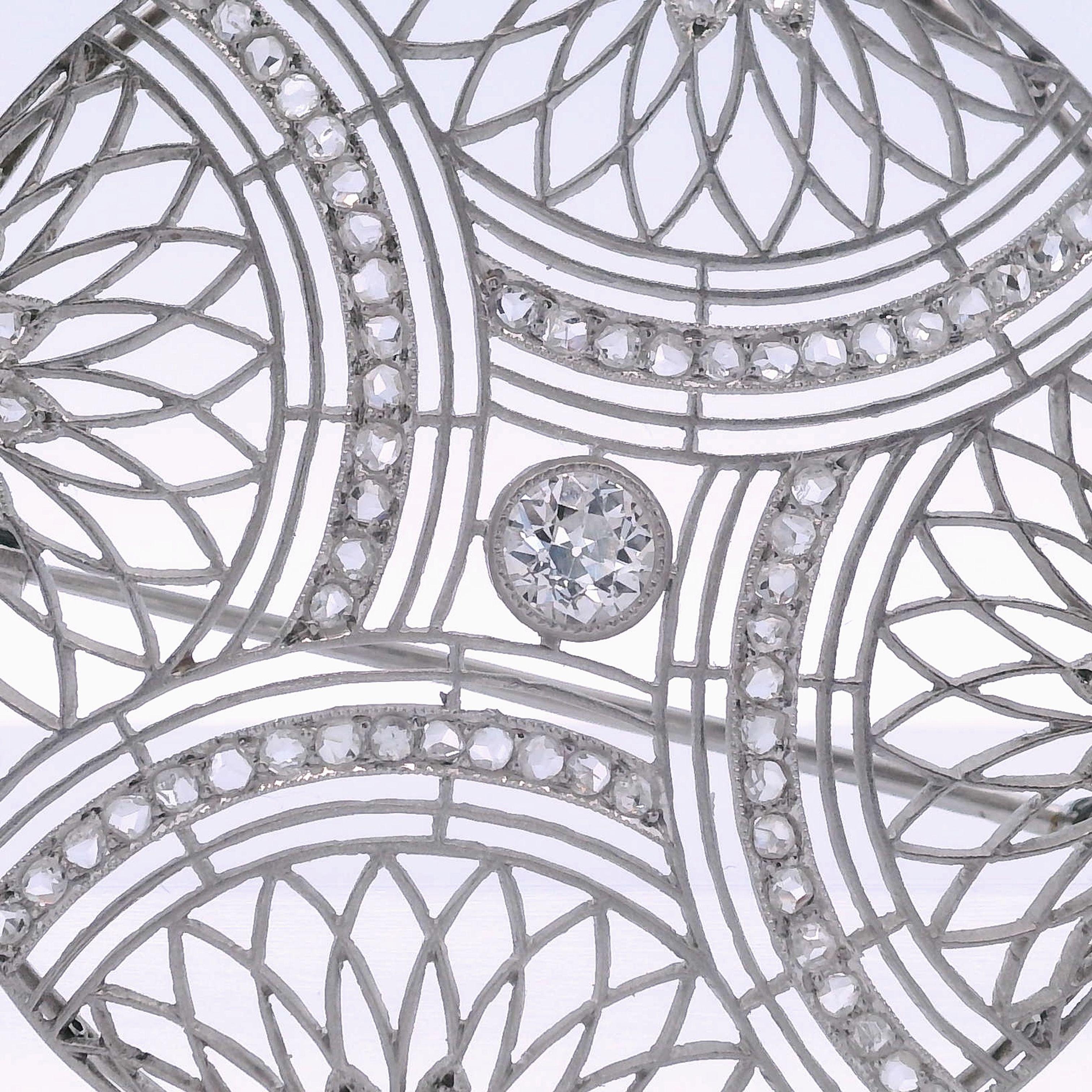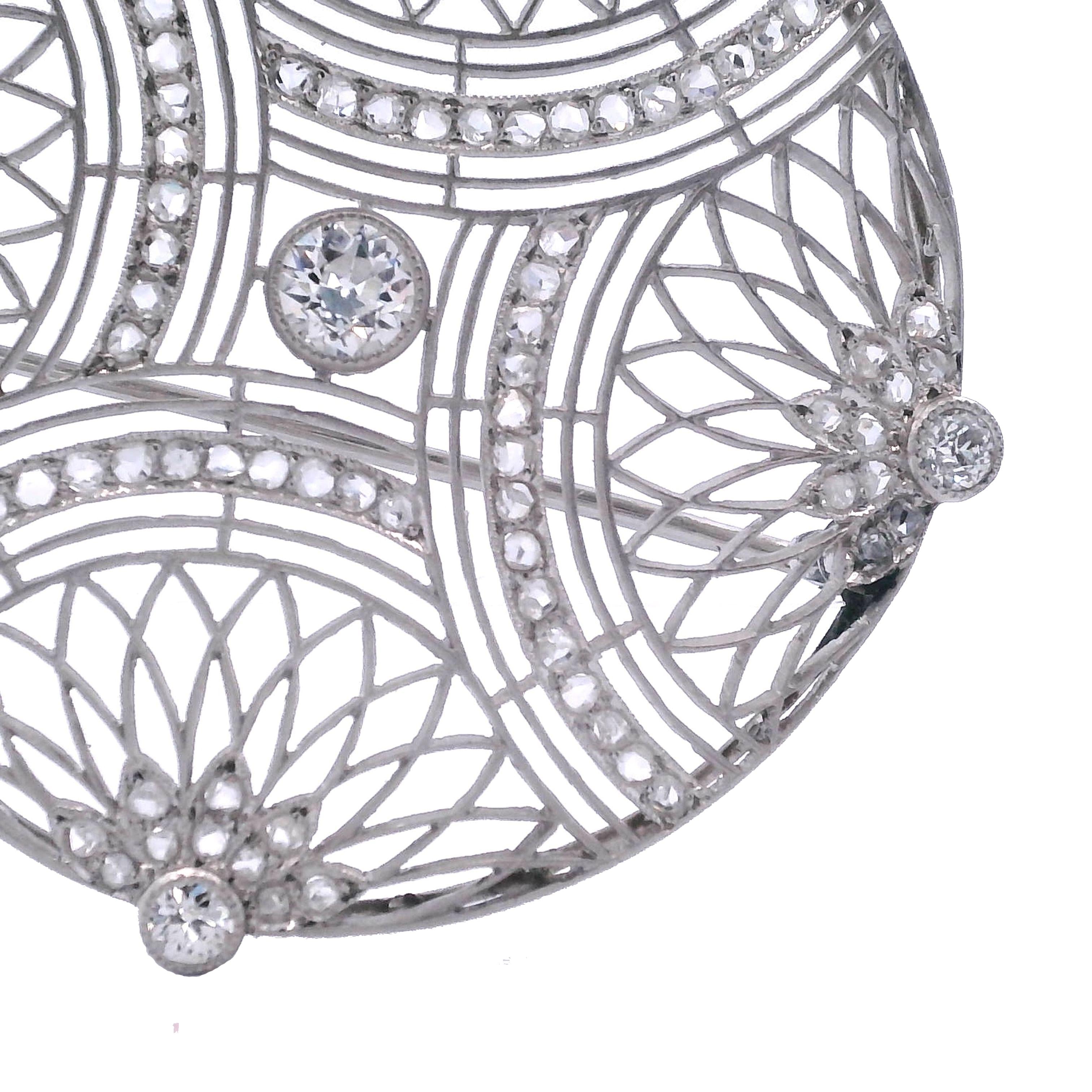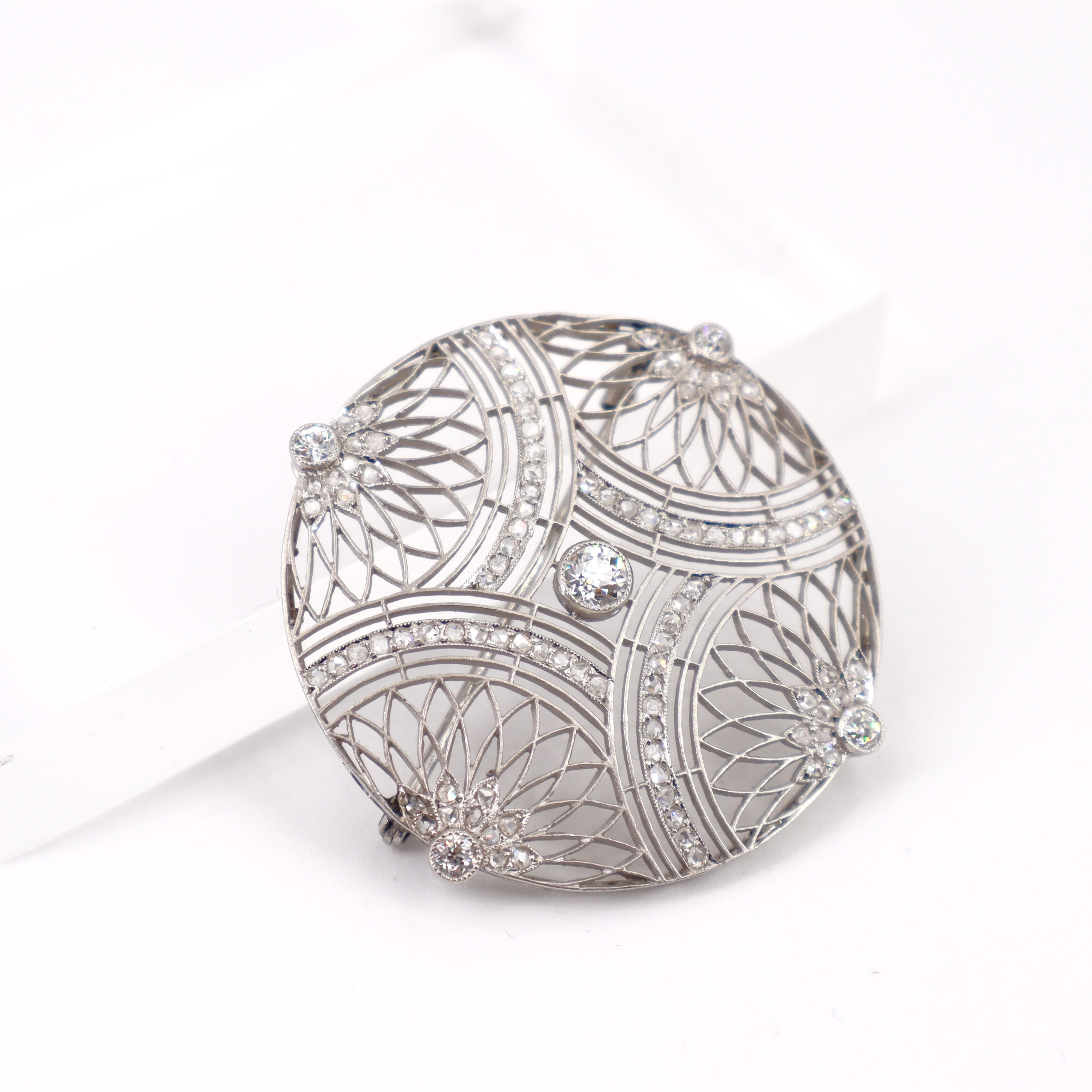 This exceptional Art Deco filigree brooch showcases the exquisite artistry and sophisticated craftsmanship of the Jazz Age, expertly crafted in luxurious platinum and featuring 5 dazzling old mine diamonds weighing 0.75 carats in H color and SI1 clarity as captivating centerpieces, beautifully surrounded by mesmerizing rose-cut diamonds totaling 1.00 carats. The delicate and intricate filigree pattern adds elegant sophistication reminiscent of the fine craftsmanship of the Art Deco period, while the substantial 1.60-inch diameter creates impressive presence.