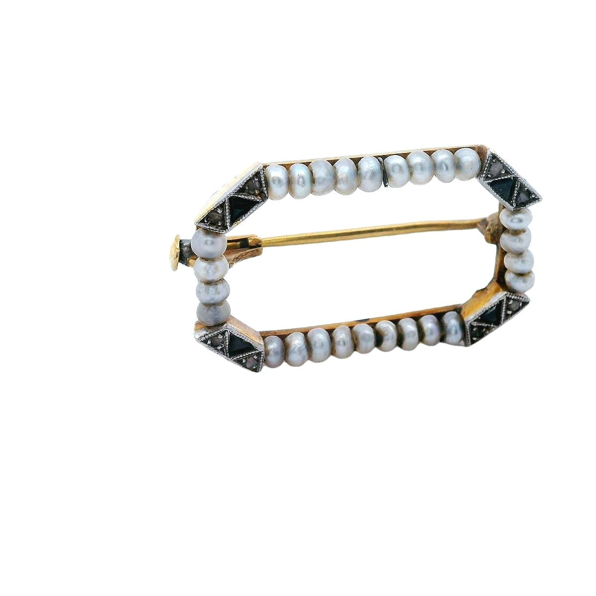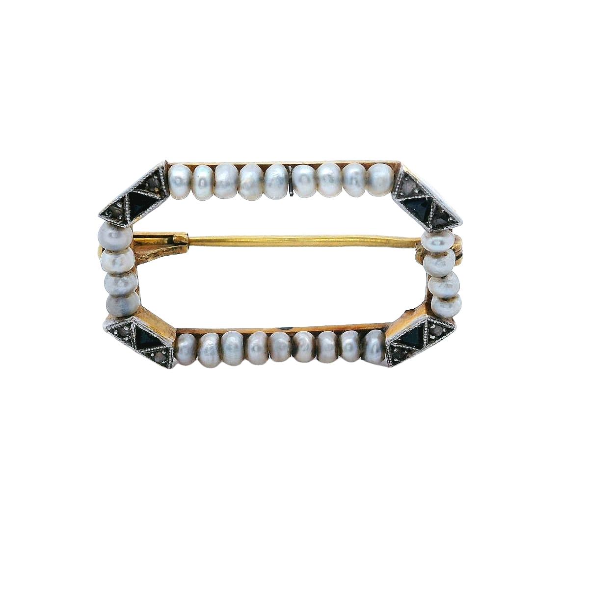 The brooch features 26 micro pearls, arranged in a delicate and symmetrical design, exuding timeless sophistication. It is further adorned with four blue sapphires, adding a vibrant touch of color, and eight rose-cut diamonds, weighing approximately 0.04 carats, which provide a subtle sparkle. The piece is fitted with a secure pin mechanism, ensuring it stays in place when worn.