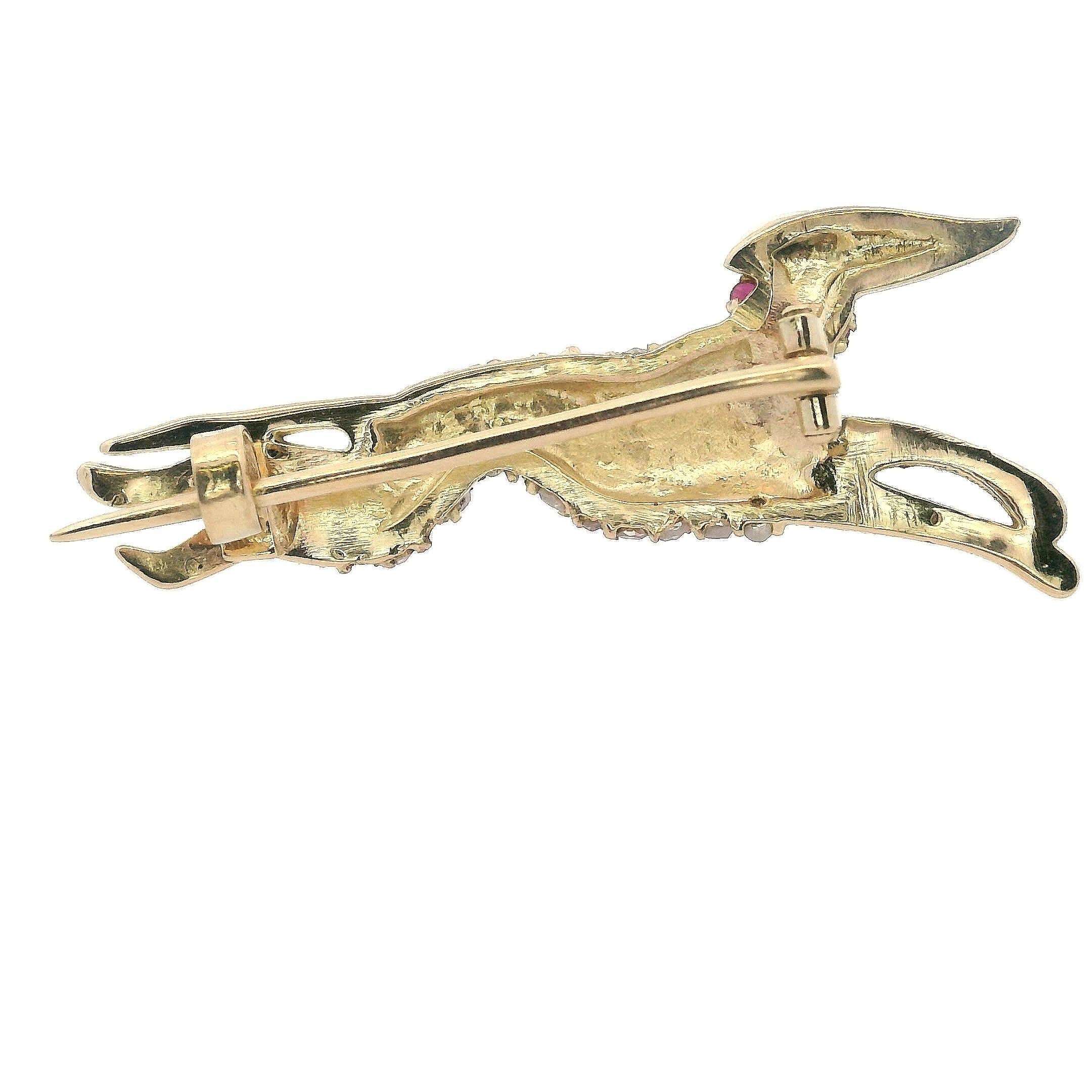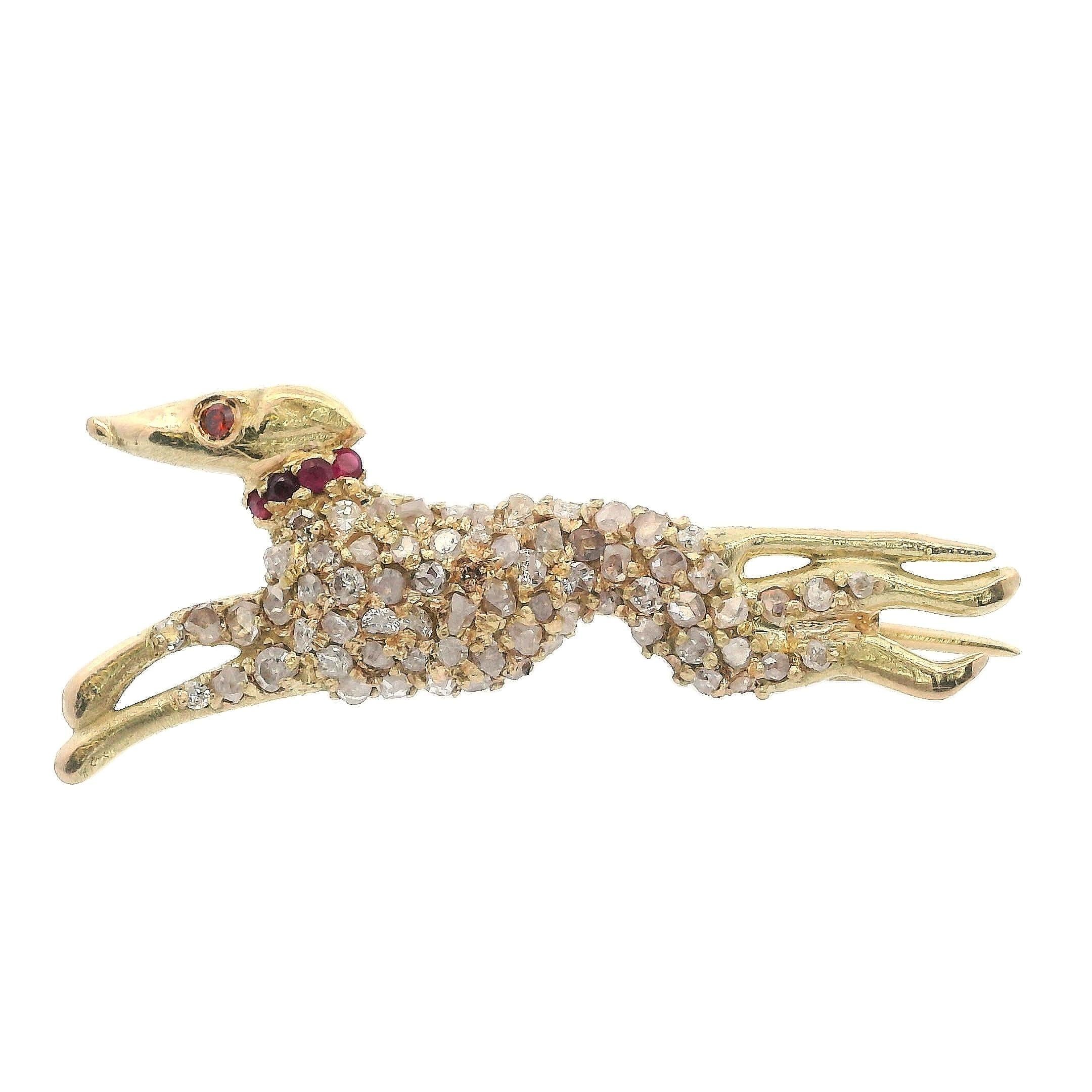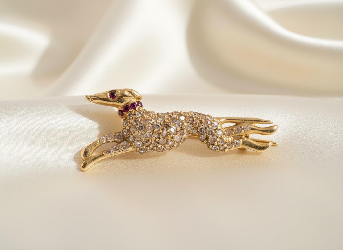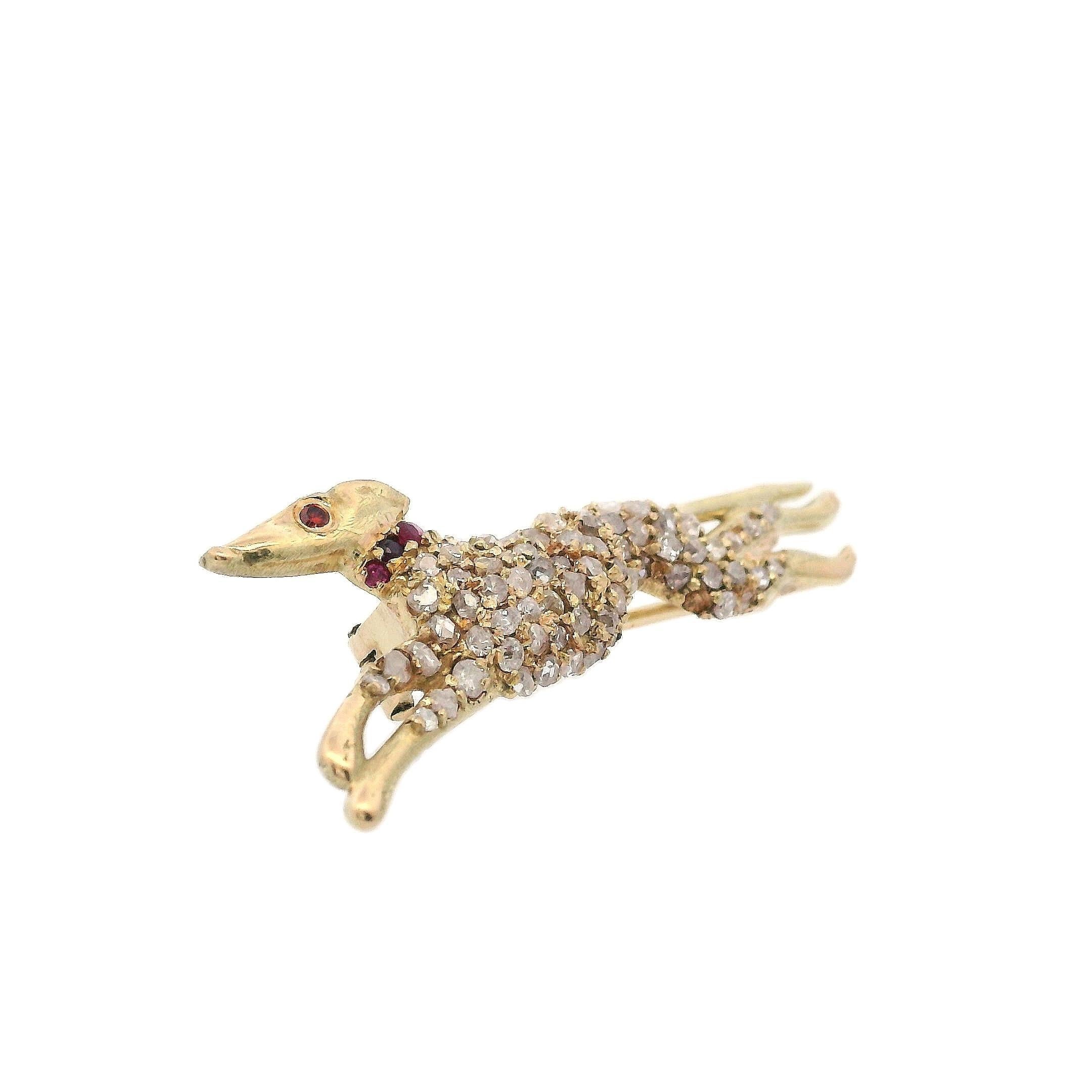 This charming dog brooch is expertly crafted in 18k yellow gold and features a whimsical design brought to life with pavé-set natural rose cut diamonds (approximately 0.30 carats) and five natural round-cut rubies arranged in a graceful, eye-catching pattern. The captivating play of light from the diamond pavé setting against the warm ruby accents perfectly showcases the meticulous craftsmanship and playful artistry characteristic of fine figural jewelry.