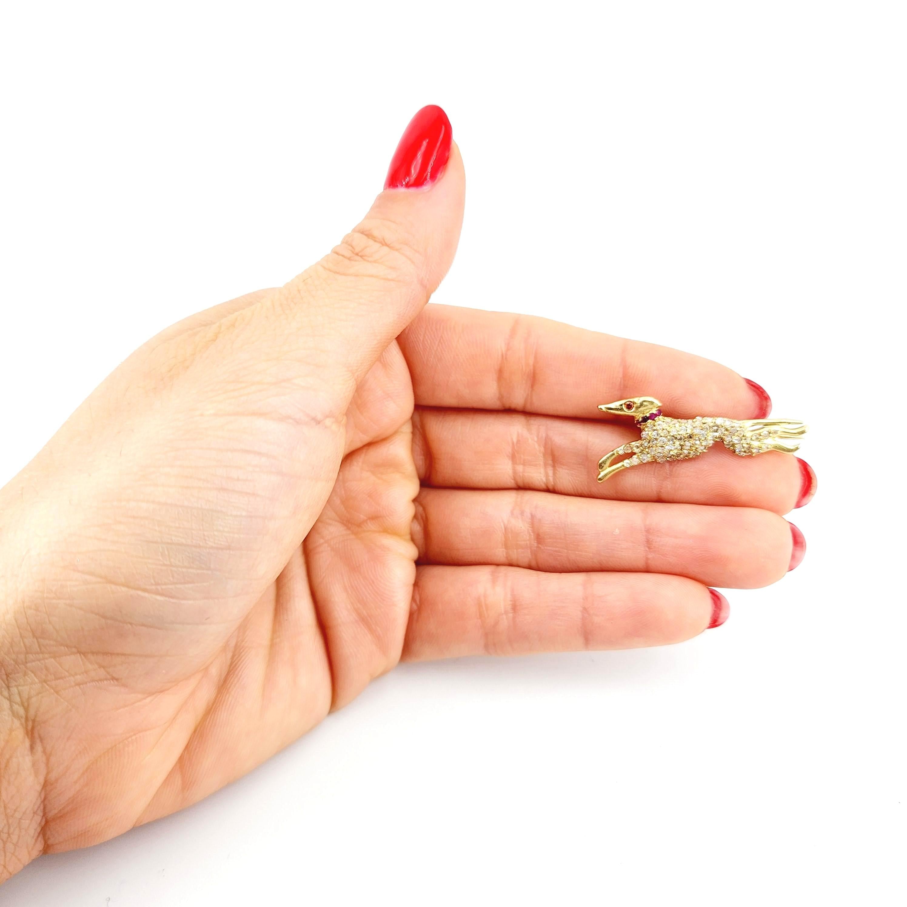 The overall condition of this piece is excellent. There is no damage to the gold or gemstone settings. All diamonds and rubies are securely set, displaying beautiful brilliance and color, reflecting the whimsical artistry and fine craftsmanship of figural jewelry design.