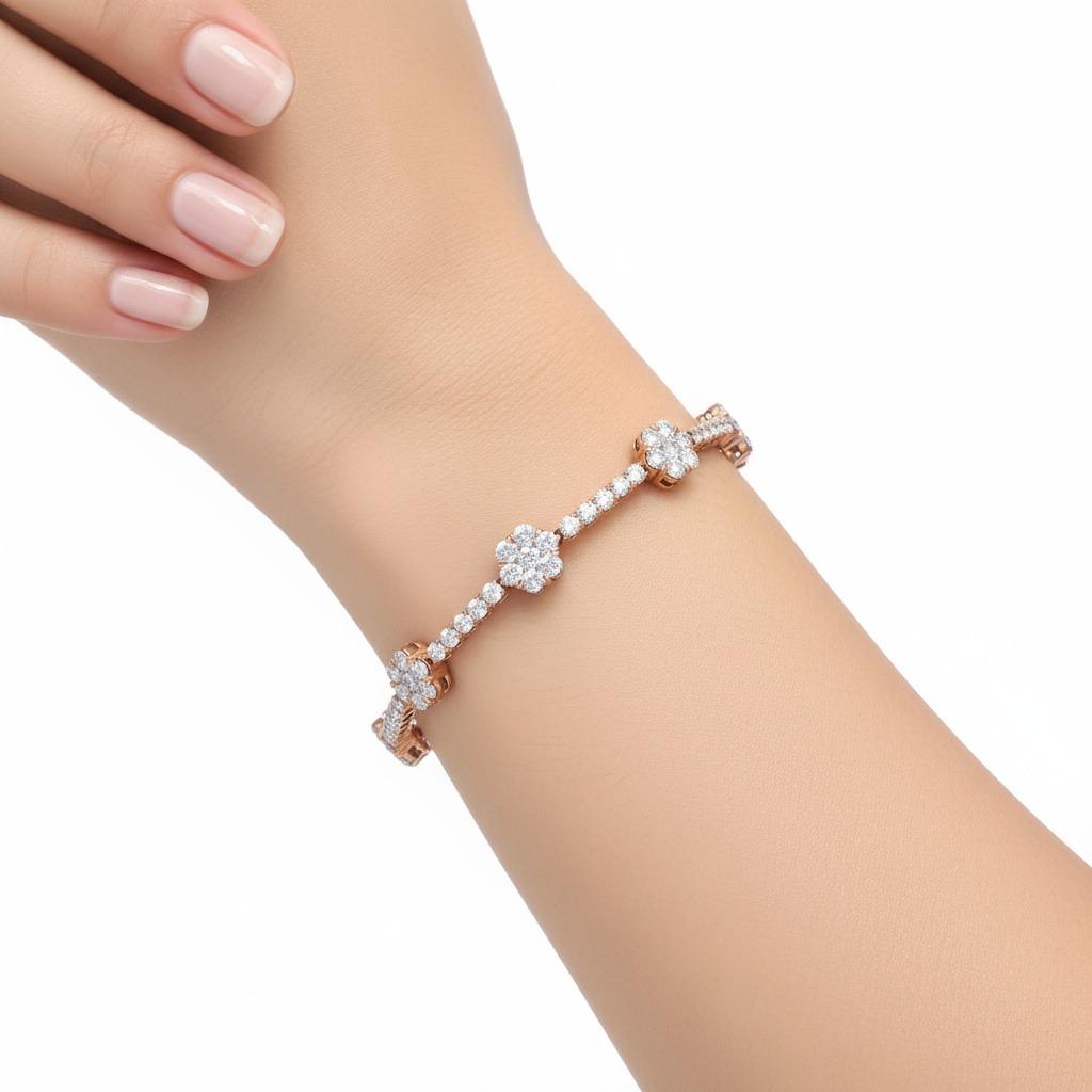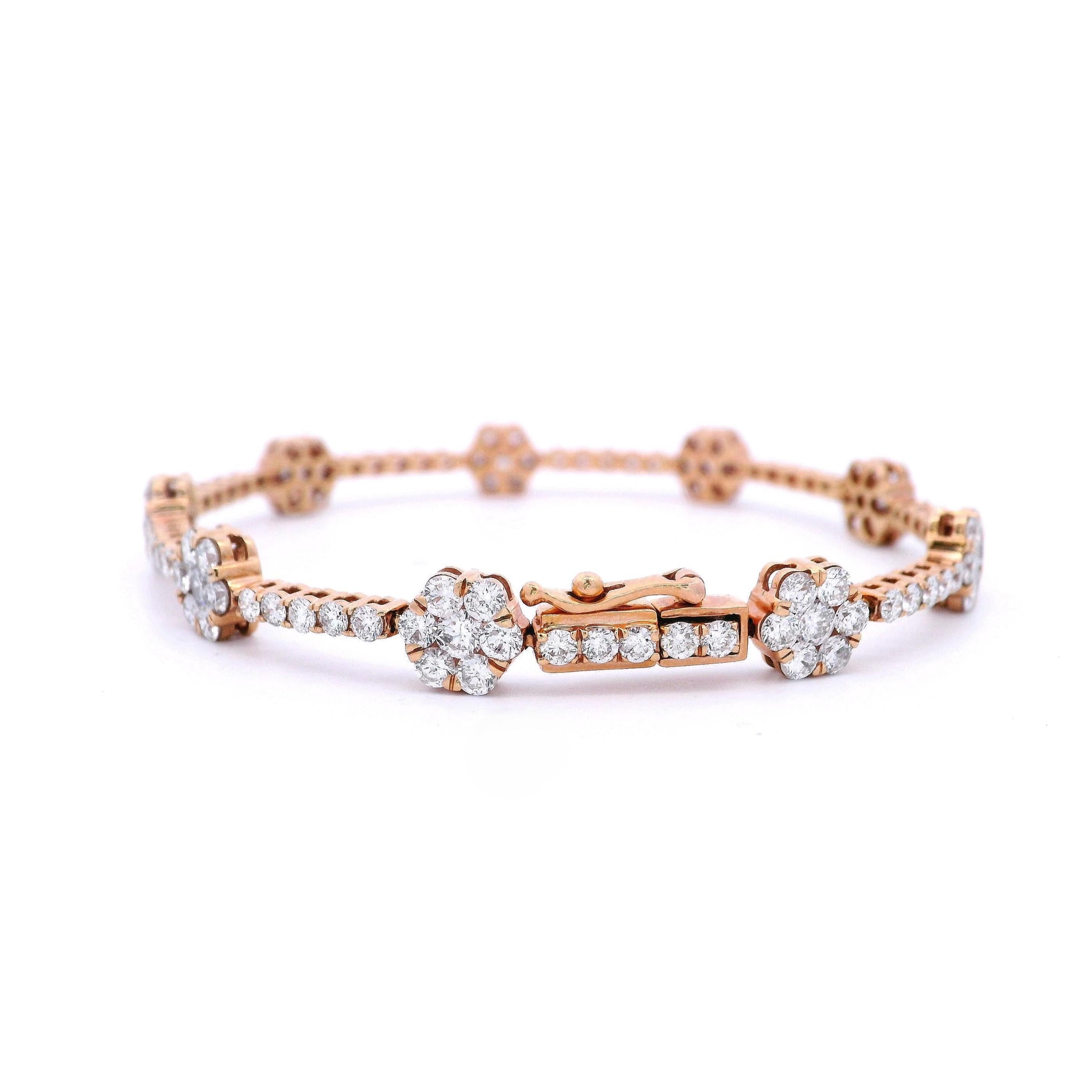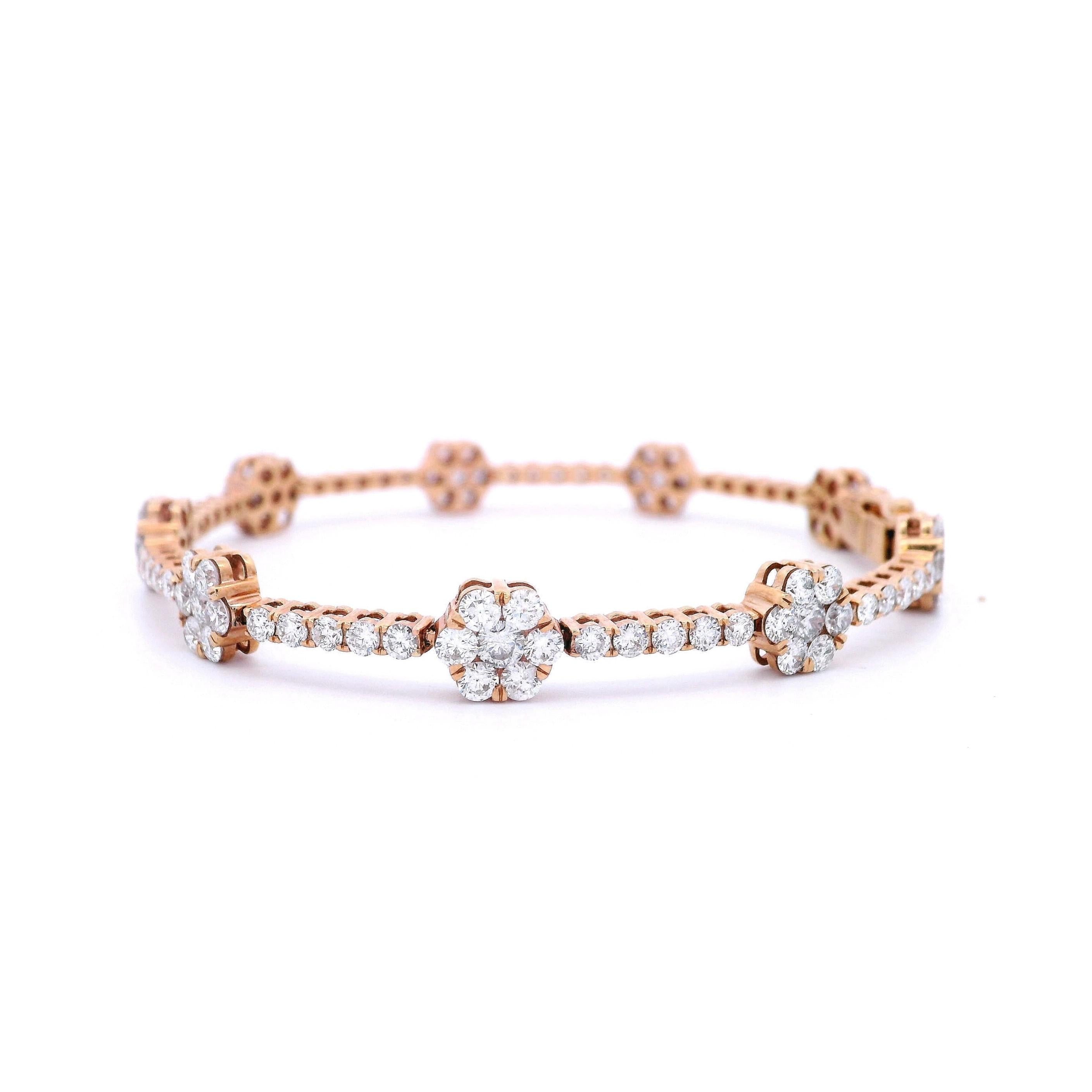 This exquisite flower tennis bracelet showcases exceptional contemporary craftsmanship from the renowned jewelry house of Yılmaz Fine Jewellery, expertly crafted in lustrous 18kt rose gold and accented with 110 calibrated round-cut diamonds totaling 5.30 carats in exceptional E-F color and VVS1 clarity. The delicate flower motif creates elegant movement and sophistication, while the precision-set diamonds ensure maximum sparkle and brilliance throughout the refined design.