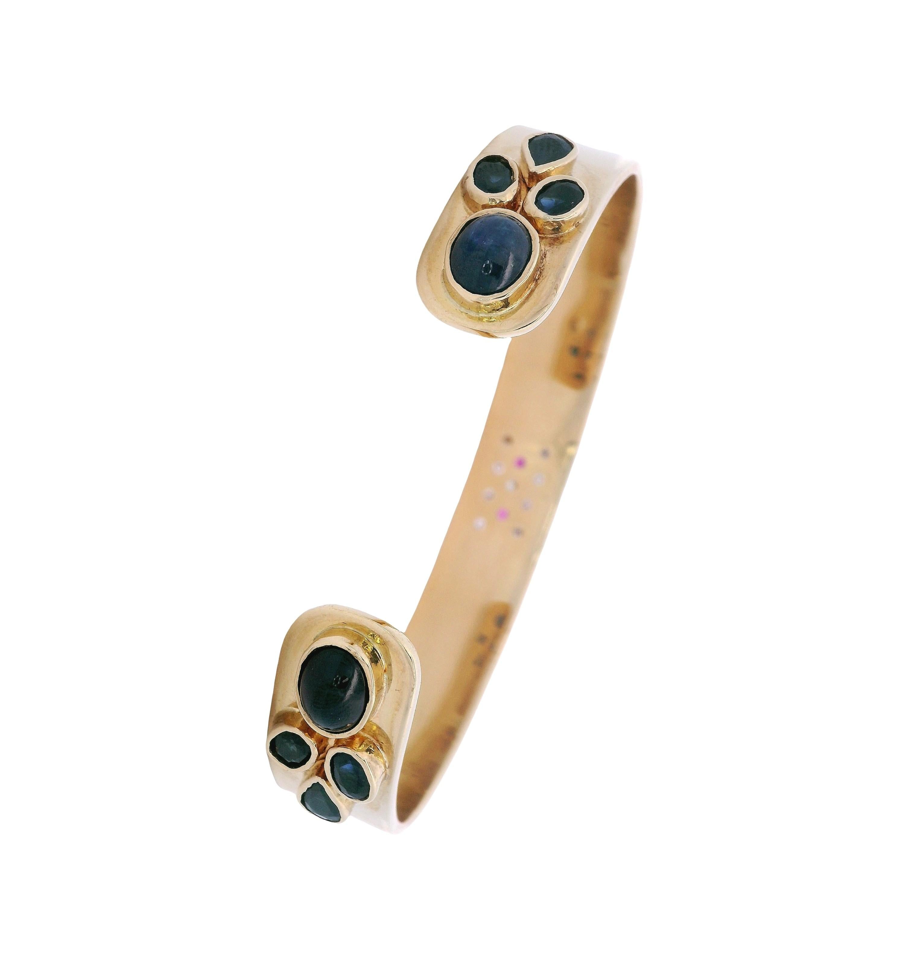 This exquisite 18kt yellow gold cuff bracelet showcases a harmonious blend of natural gemstones, accented with two cabochon blue sapphires, four oval-cut blue sapphires, and two pear-cut blue sapphires totaling approximately 8.50 carats. Complementing the vibrant sapphires are two round-cut rubies and nine round-cut diamonds totaling approximately 0.20 carats in G-H color, creating a sophisticated contrast of rich colors and brilliant sparkle.