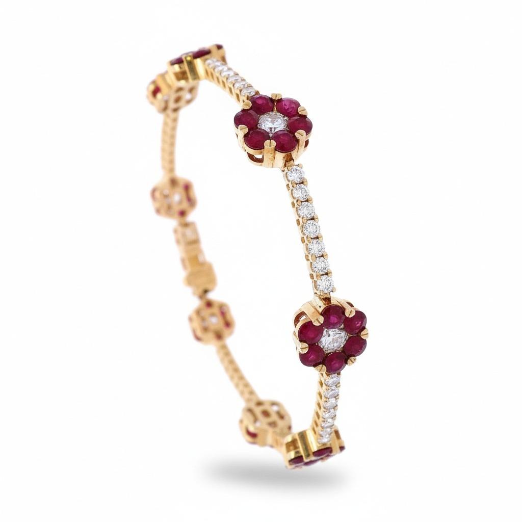 This exquisite flower tennis bracelet showcases exceptional contemporary craftsmanship from the renowned jewelry house of Yılmaz Fine Jewellery, expertly crafted in lustrous 18kt yellow gold and accented with 62 calibrated round-cut diamonds totaling 2.55 carats in F-G color and VS1 clarity, beautifully complemented by 48 round-cut vivid red rubies weighing approximately 3.45 carats. The delicate flower motif creates elegant movement and sophistication, while the precision-set diamonds and rubies ensure maximum sparkle and vibrant color throughout the refined design.