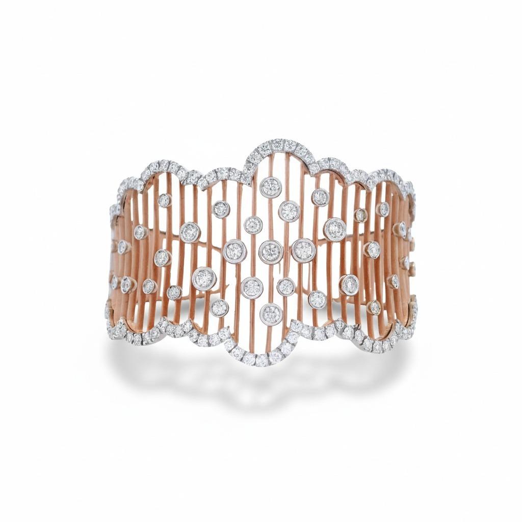 This stunning Italian wavy cuff bracelet showcases exceptional contemporary craftsmanship, expertly crafted in lustrous 18kt rose and white gold and featuring sophisticated open work design accented with 147 graduated round-cut diamonds totaling 7.90 carats in premium F-G color and VS1 clarity. The elegant wavy silhouette creates dynamic movement and visual interest, while the two-tone metal combination adds striking contrast that enhances the diamonds' brilliant sparkle.