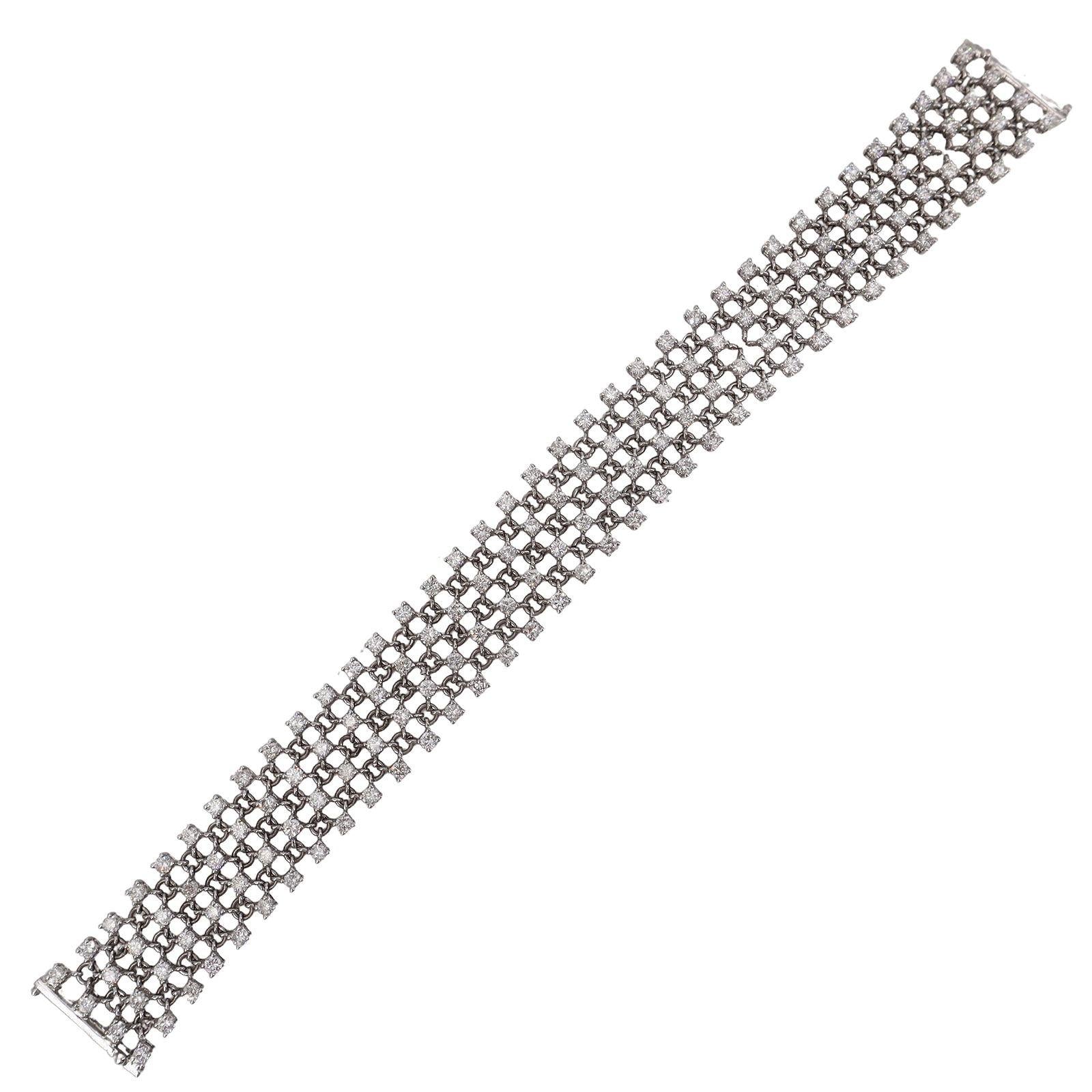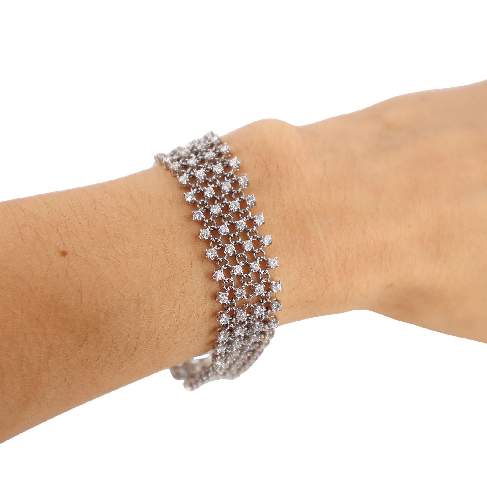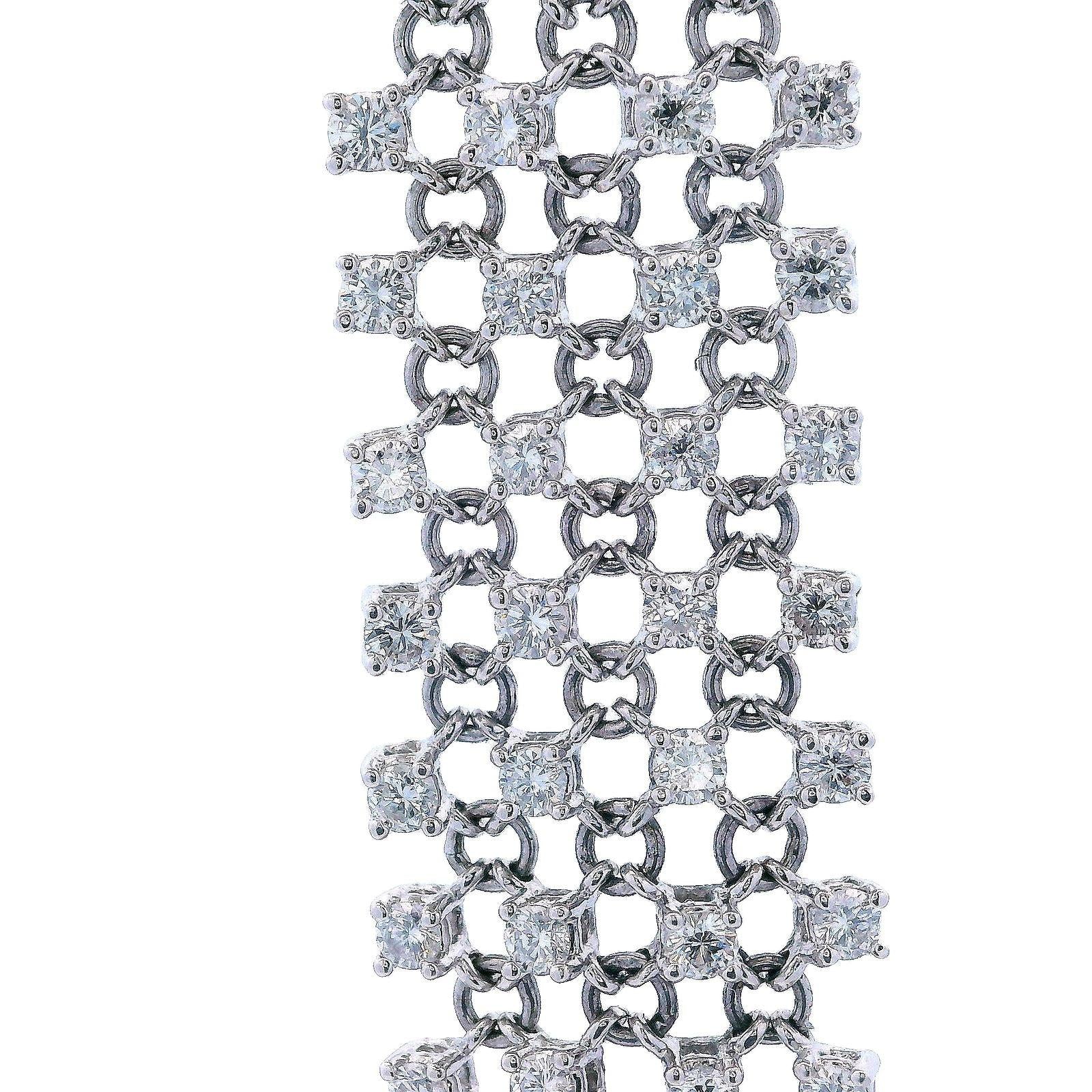 This exceptional bracelet is masterfully hand crafted in platinum, featuring an elegant mesh design that is both flexible and substantial. The bracelet is accented with 144 calibrated natural round-cut diamonds, together weighing approximately 6.40 carats, offering a dazzling display of brilliance and refined luxury.