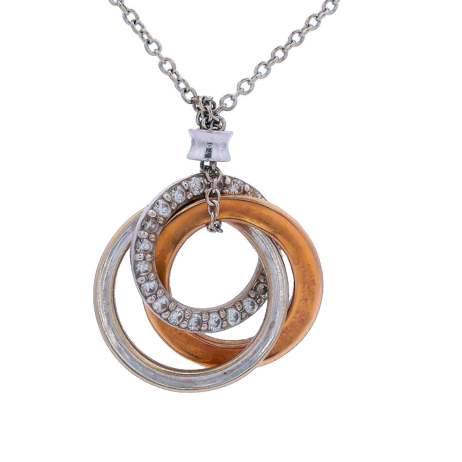 This elegant Tiffany & Co. necklace is expertly crafted in 18kt rose and white gold, featuring three interlocking circles that symbolize unity and enduring connection. One circle is beautifully accented with radiant natural round-cut diamonds, adding a touch of sophistication and luxury to the refined design. The exquisite attention to detail and harmonious blend of precious metals make this necklace a true statement of modern elegance.