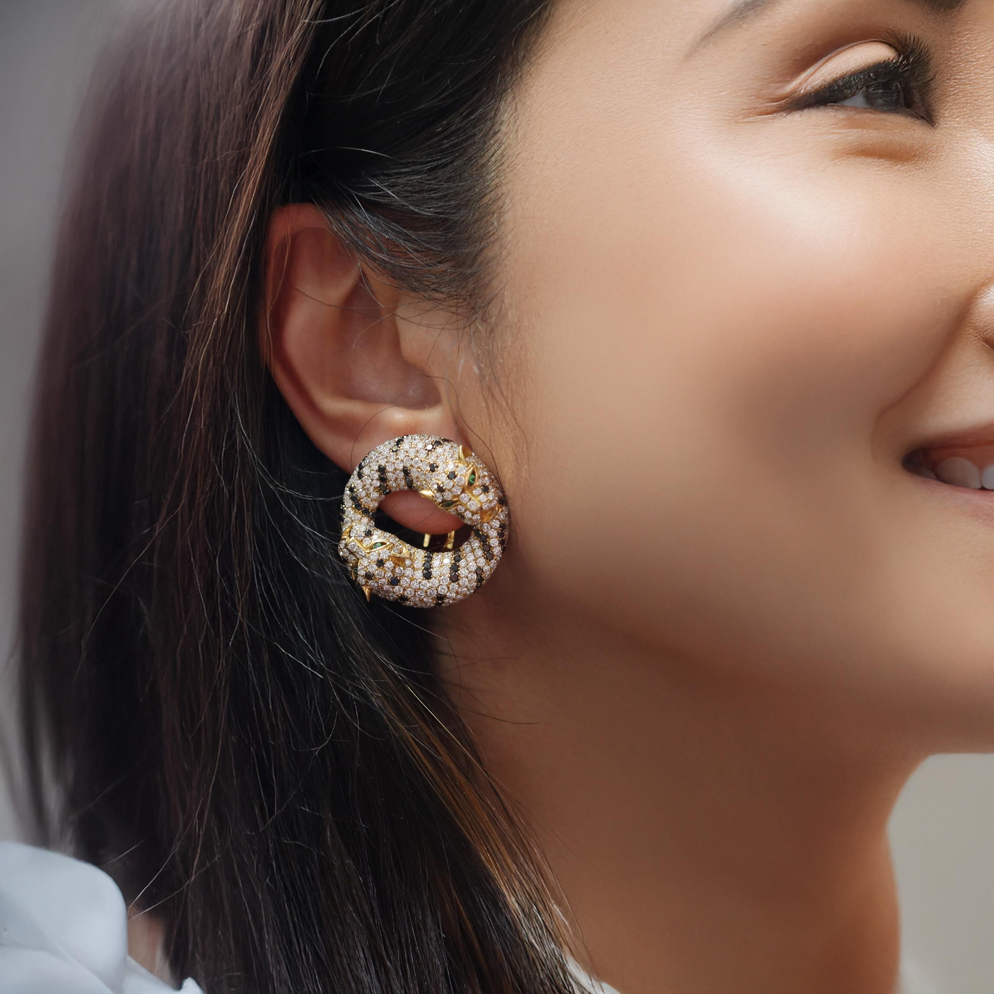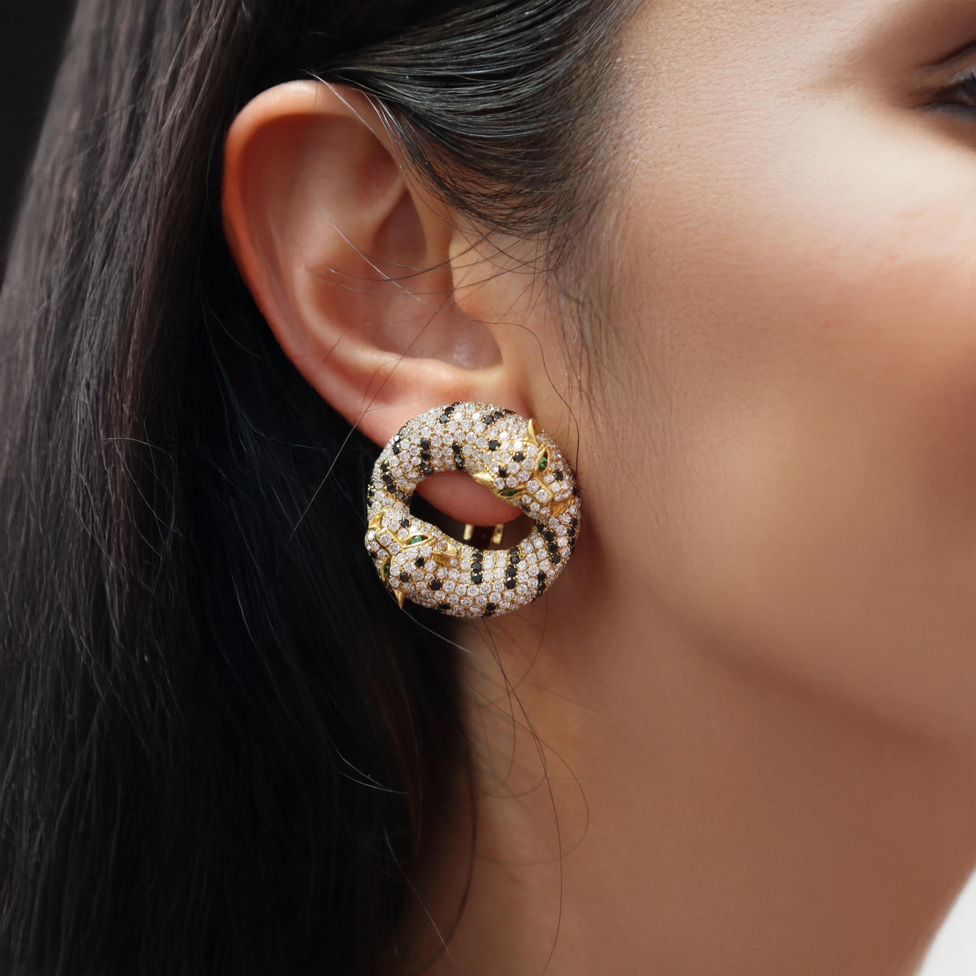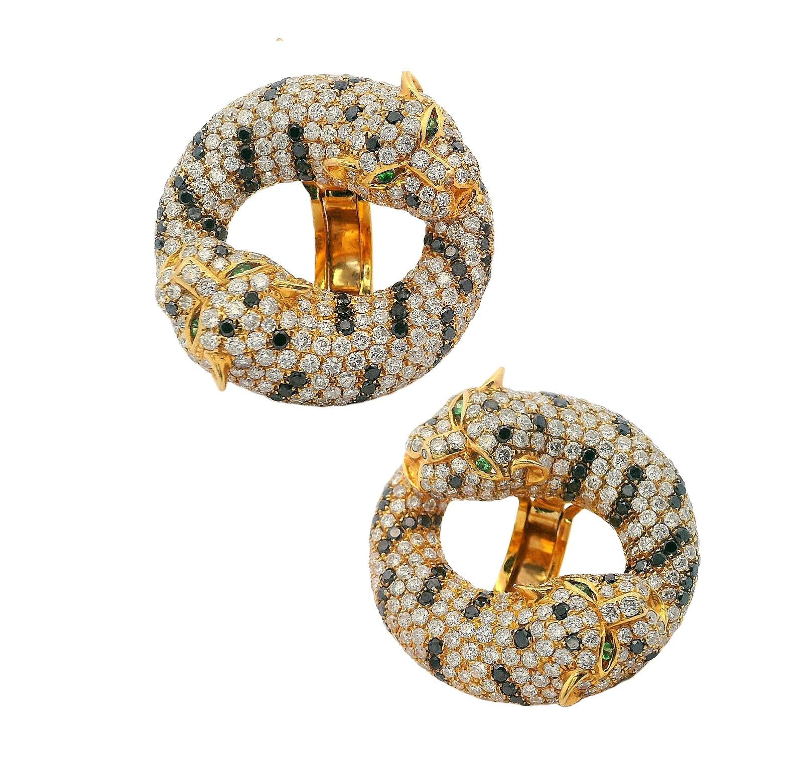 These stunning contemporary panther earrings showcase bold animal-inspired design, crafted in rich 18kt yellow gold and featuring 8.46 carats of white round brilliant cut diamonds in exceptional F-G color and VS2 clarity, dramatically contrasted by 2.40 carats of round brilliant cut black diamonds, with striking tsavorite eyes that bring these majestic creatures to life. The substantial 25.6-gram weight and impressive 1.13-inch diameter create commanding presence, while the omega clip backs ensure comfortable wear with the option to add posts for pierced ears.