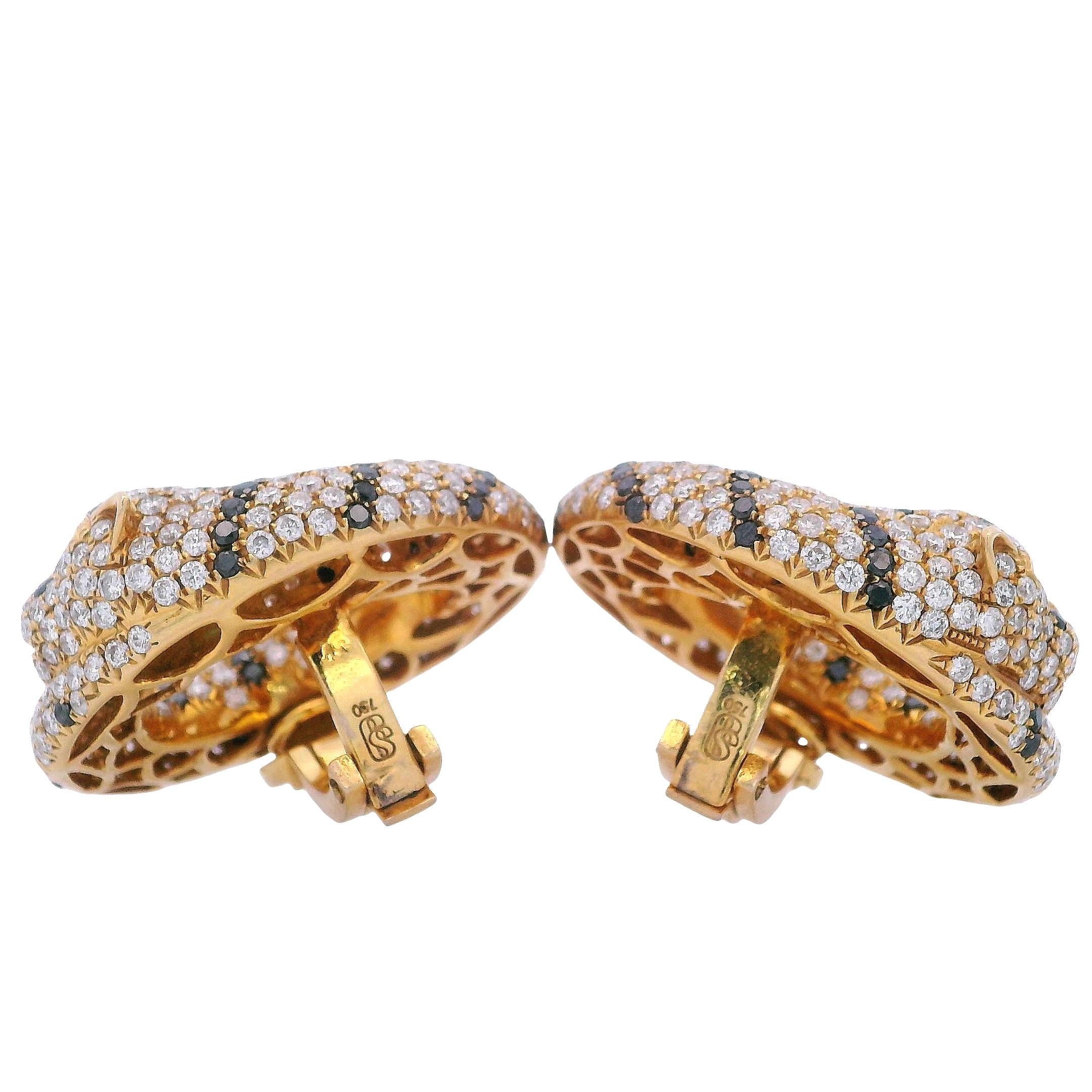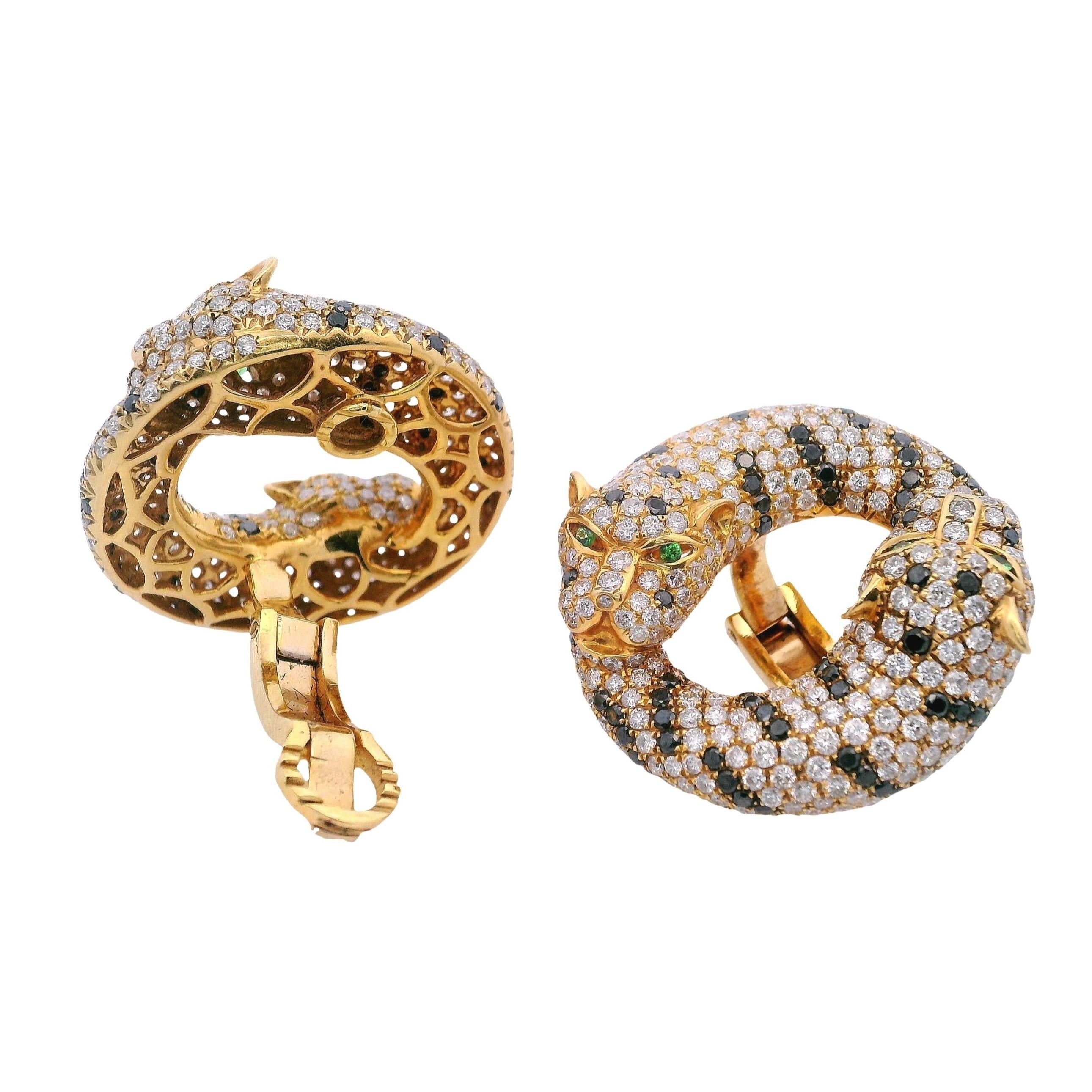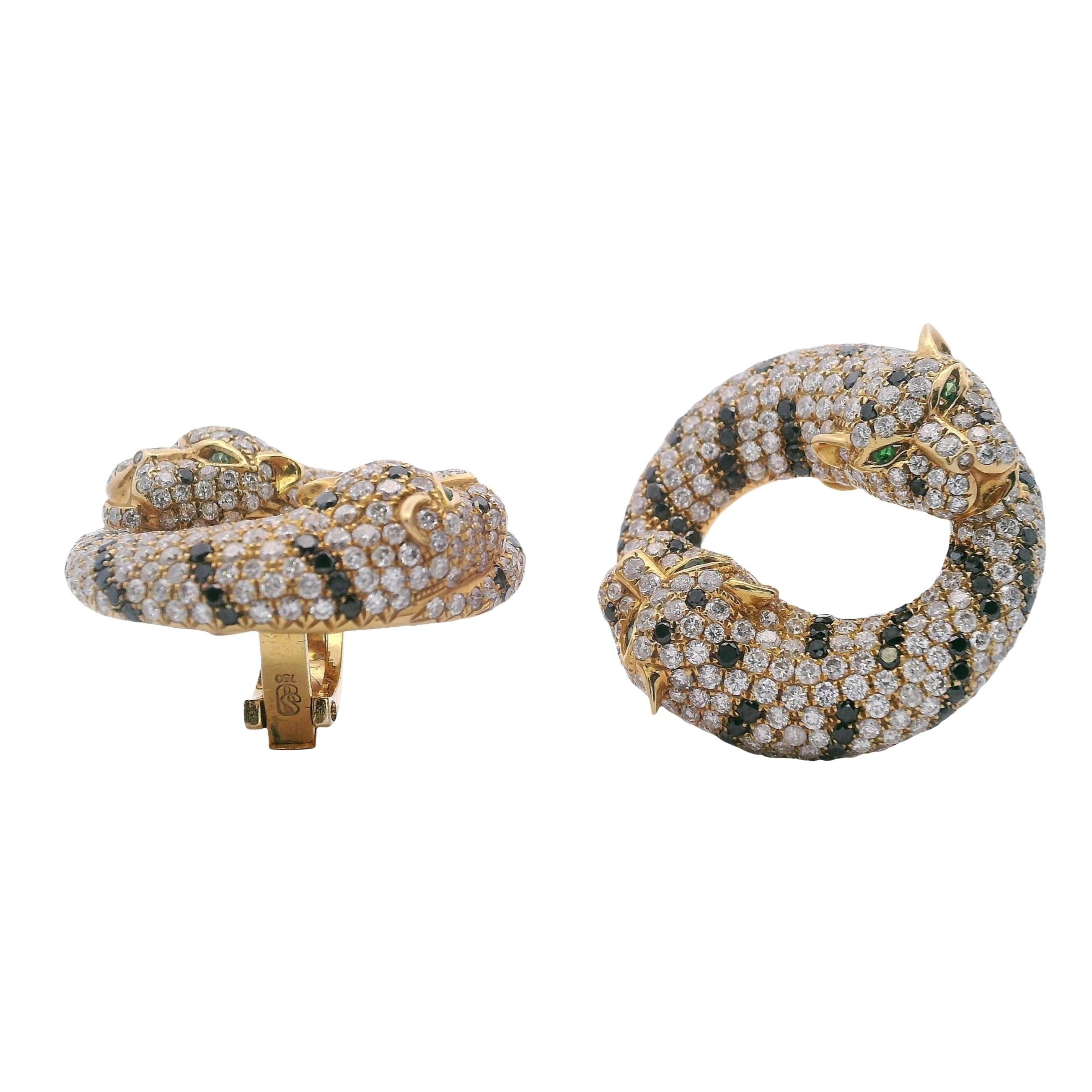 These stunning contemporary panther earrings showcase bold animal-inspired design, crafted in rich 18kt yellow gold and featuring 8.46 carats of white round brilliant cut diamonds in exceptional F-G color and VS2 clarity, dramatically contrasted by 2.40 carats of round brilliant cut black diamonds, with striking tsavorite eyes that bring these majestic creatures to life. The substantial 25.6-gram weight and impressive 1.13-inch diameter create commanding presence, while the omega clip backs ensure comfortable wear with the option to add posts for pierced ears.