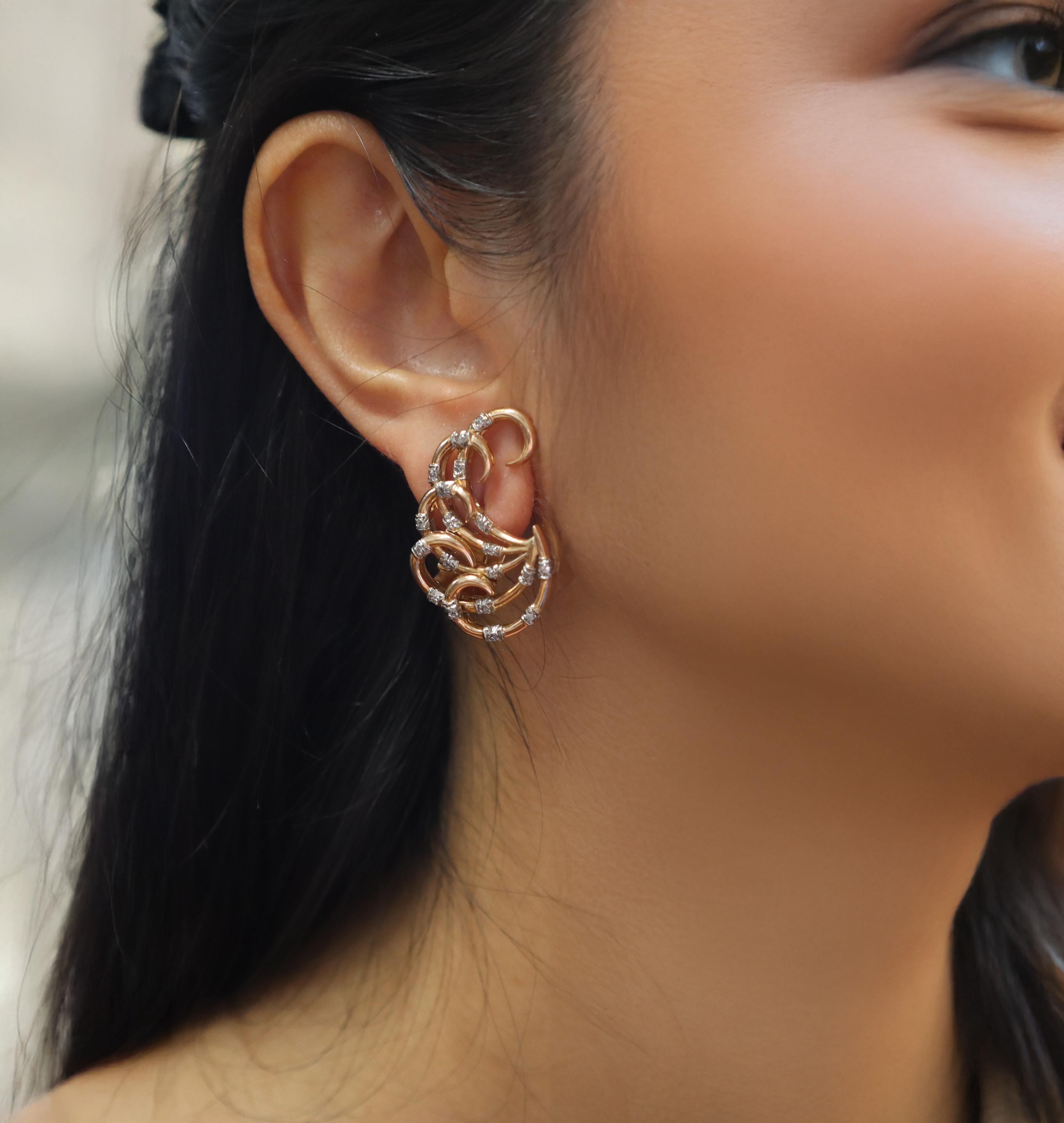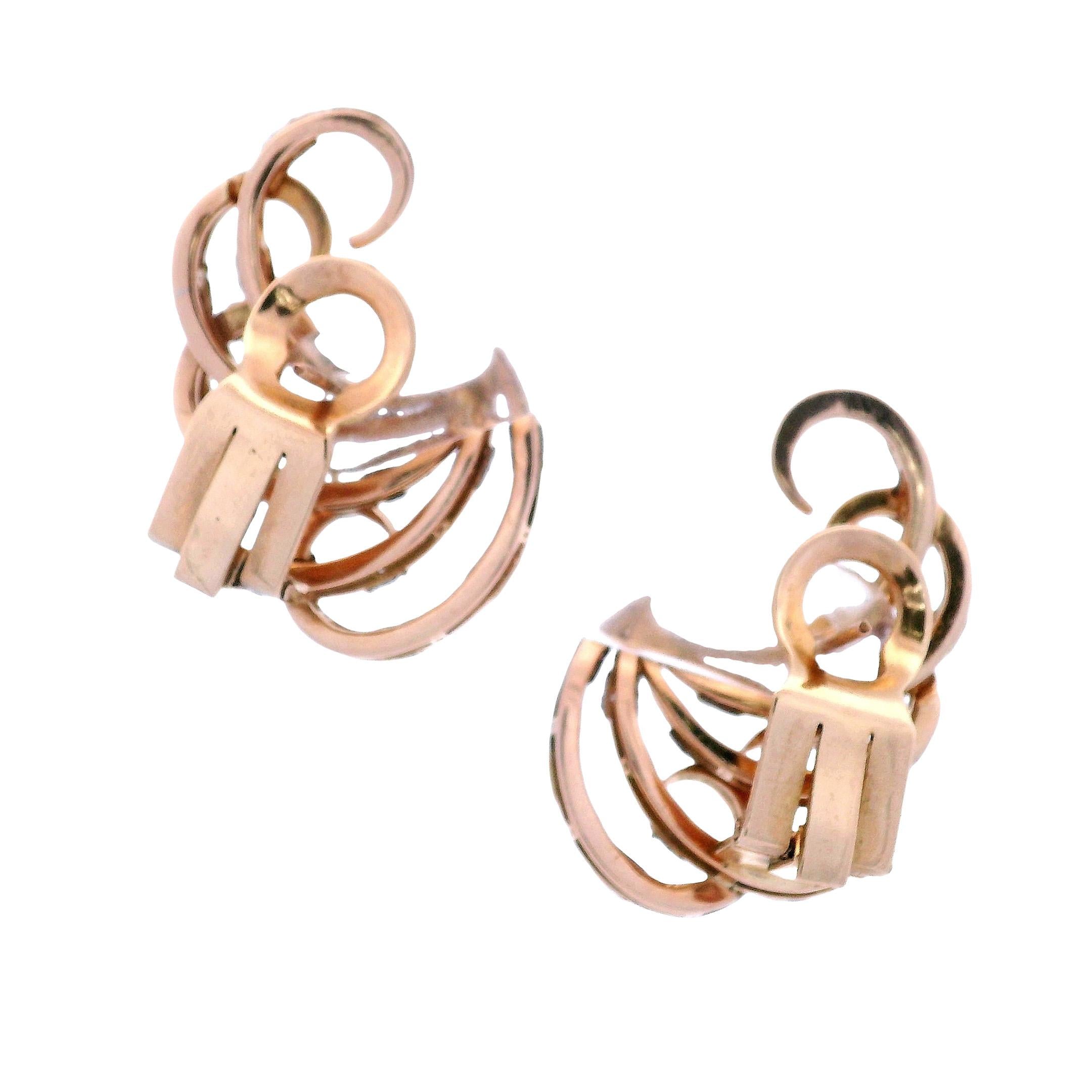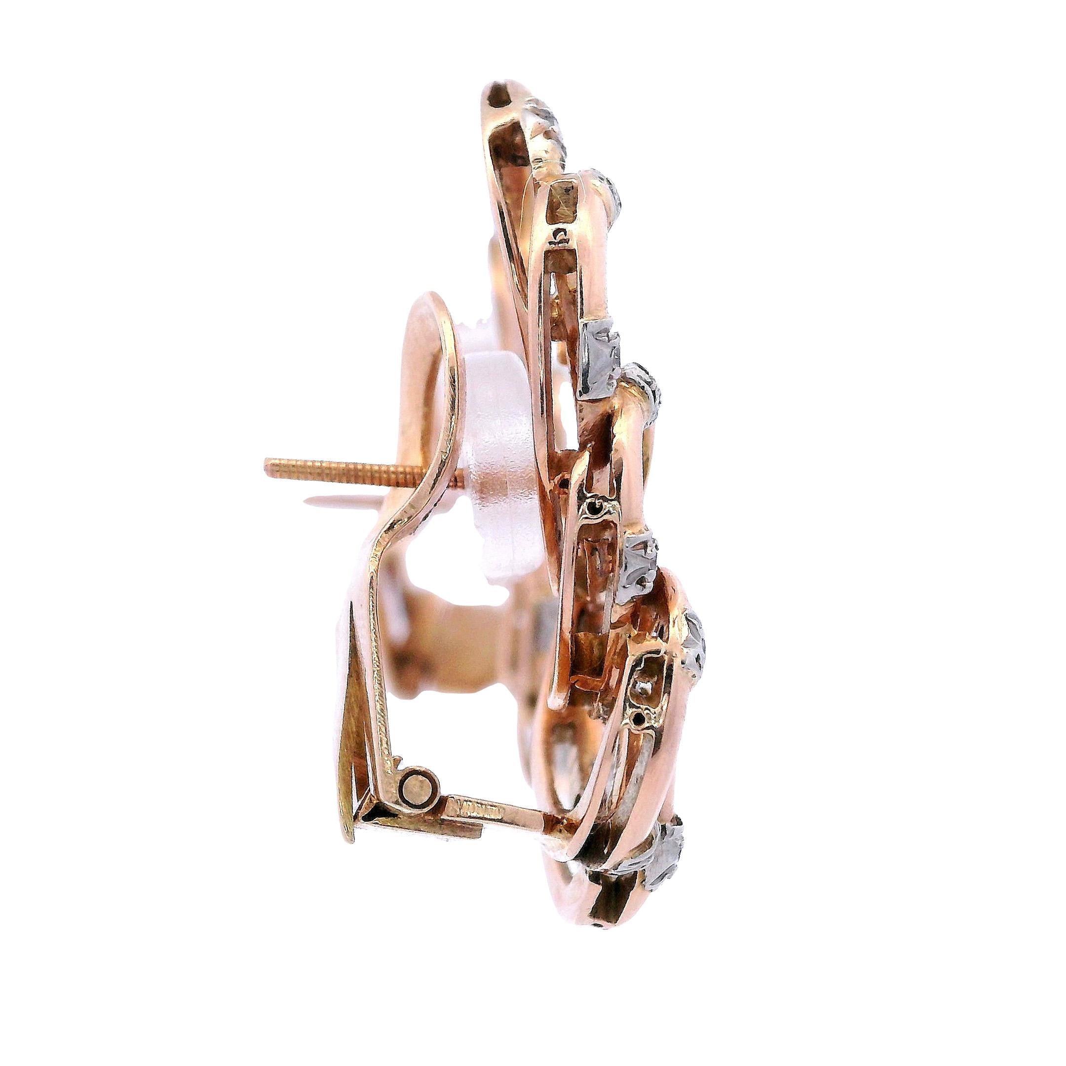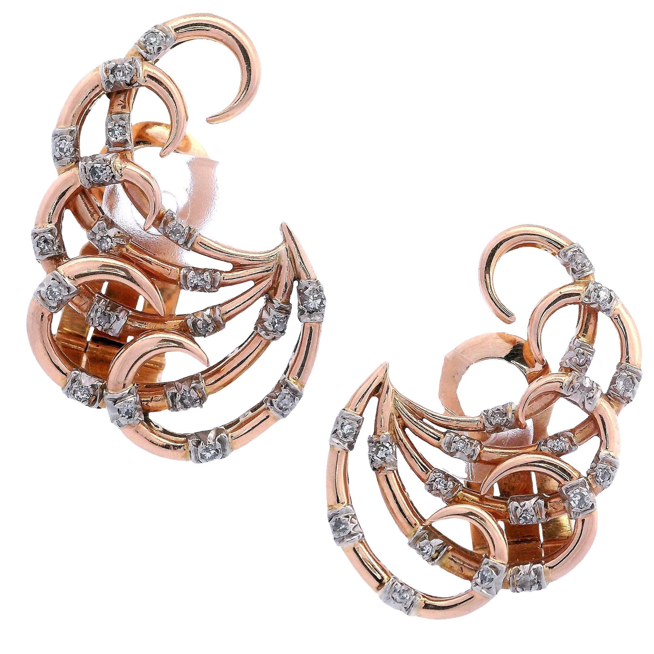 This elegant pair of mid-century earrings showcases the refined craftsmanship of the 1940s-1950s era, expertly crafted in lustrous 18kt rose and white gold and featuring 38 single-cut diamonds totaling 0.38 carats in H-I color (graded colorless). The sophisticated two-tone gold combination creates beautiful contrast and visual interest, while the single-cut diamonds provide subtle sparkle that epitomizes mid-century elegance and understated luxury.