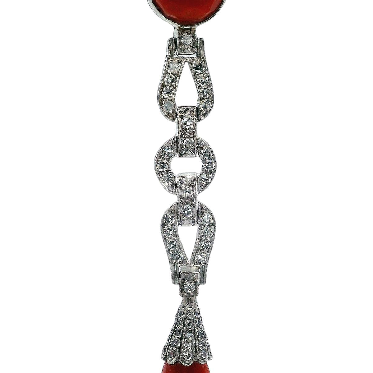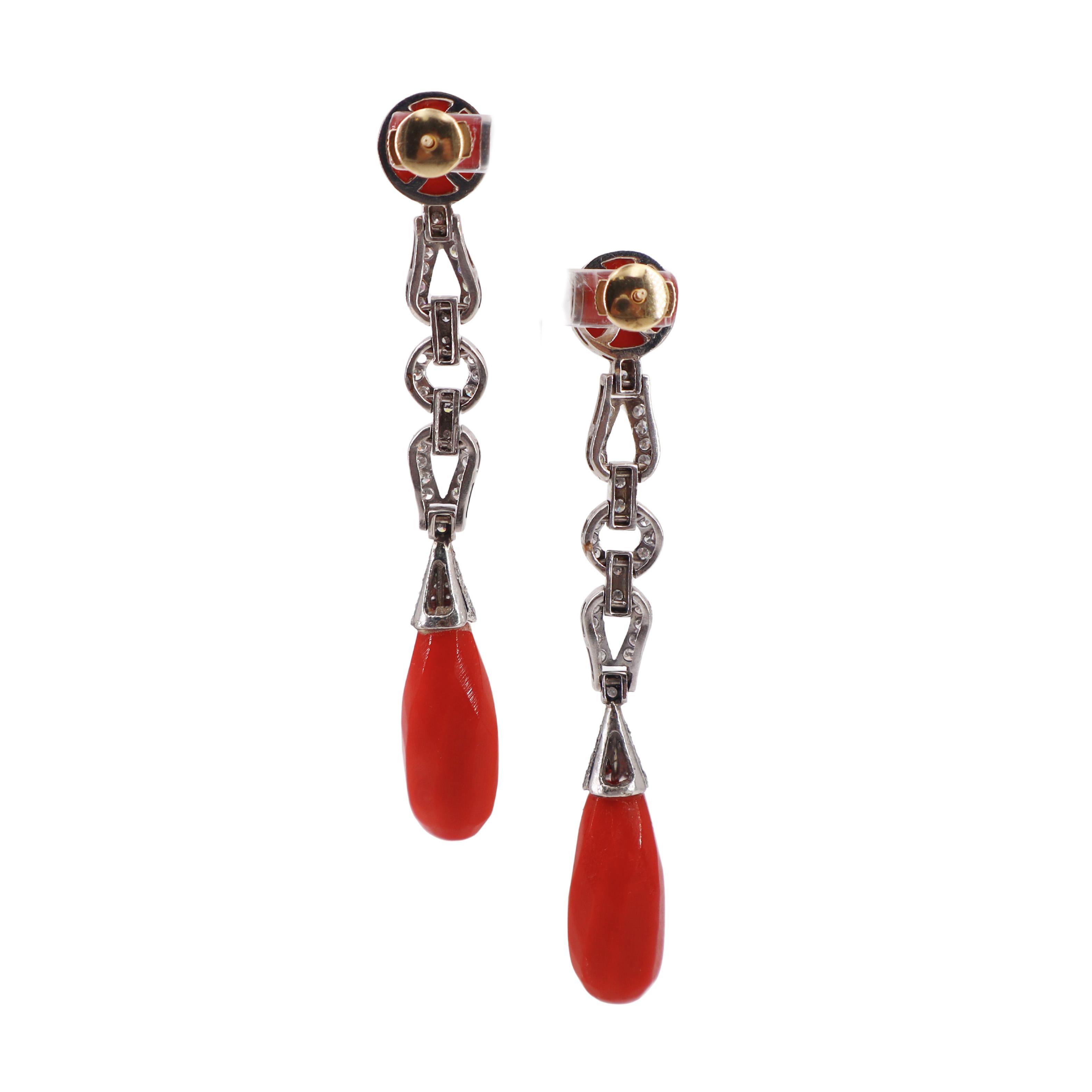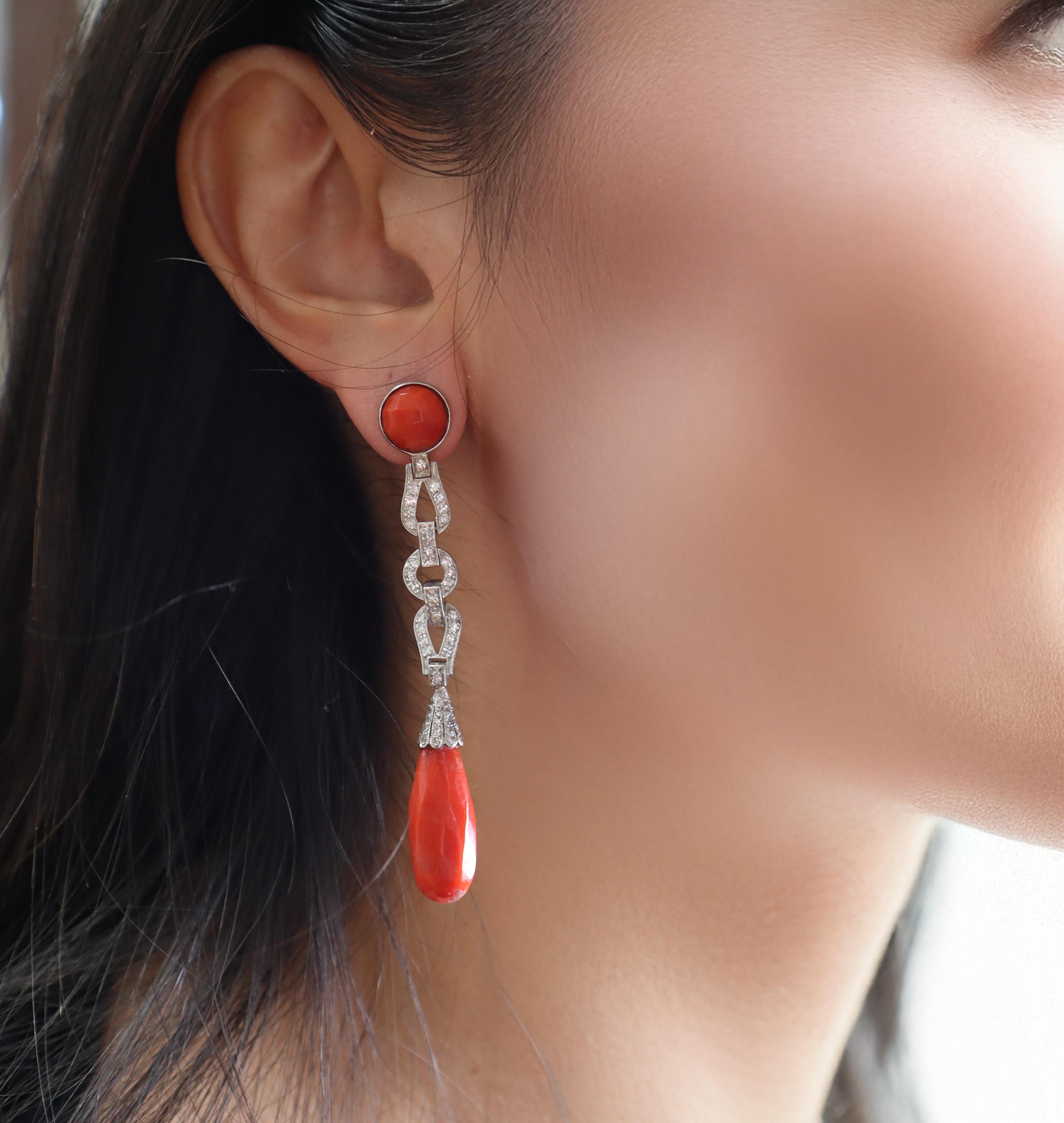 Enhancing their beauty, each earring showcases four pieces of natural red coral, providing a vibrant contrast to the precious metals and diamonds. The combination of luxurious materials and unique gemstones makes these earrings a perfect statement piece for both everyday wear and special occasions.
