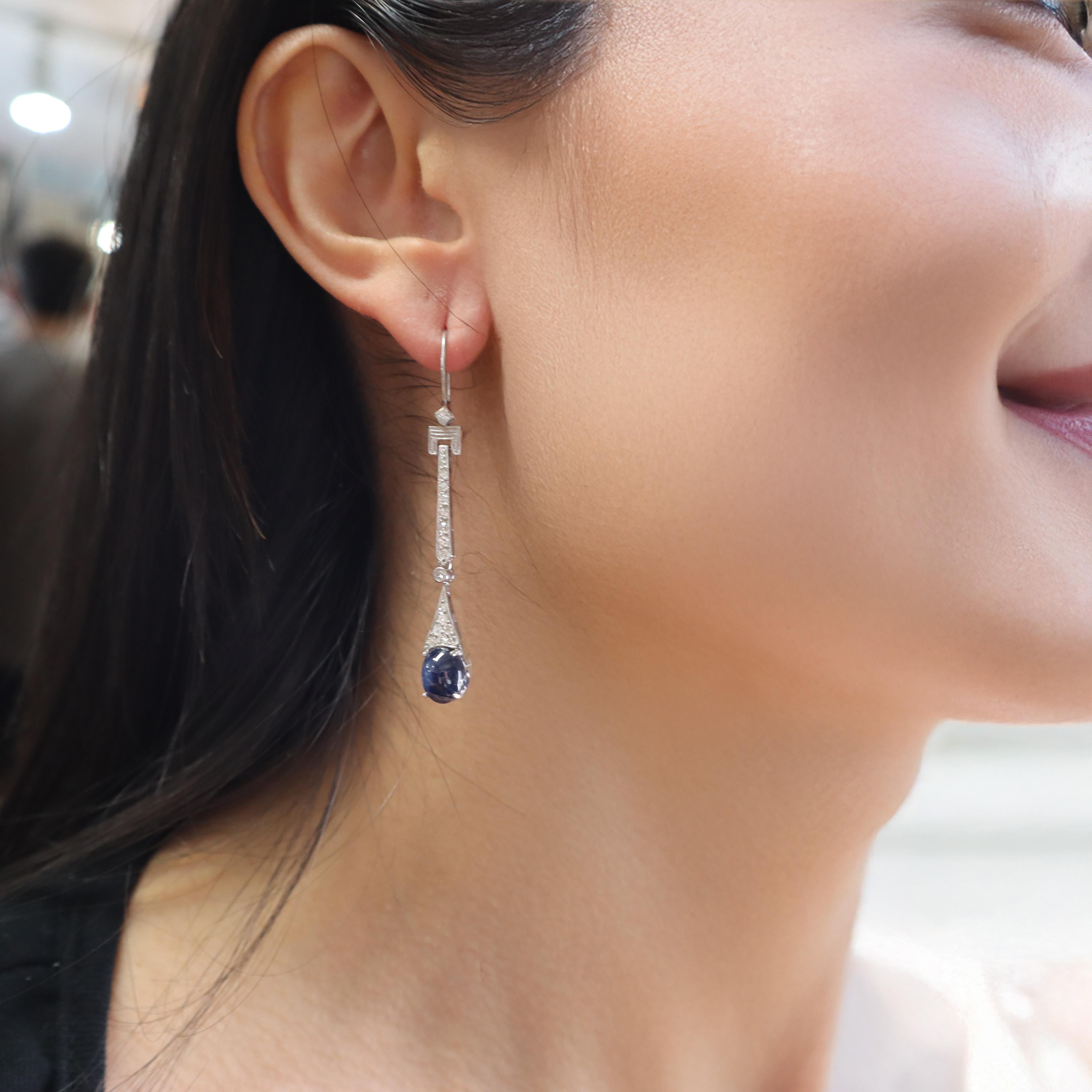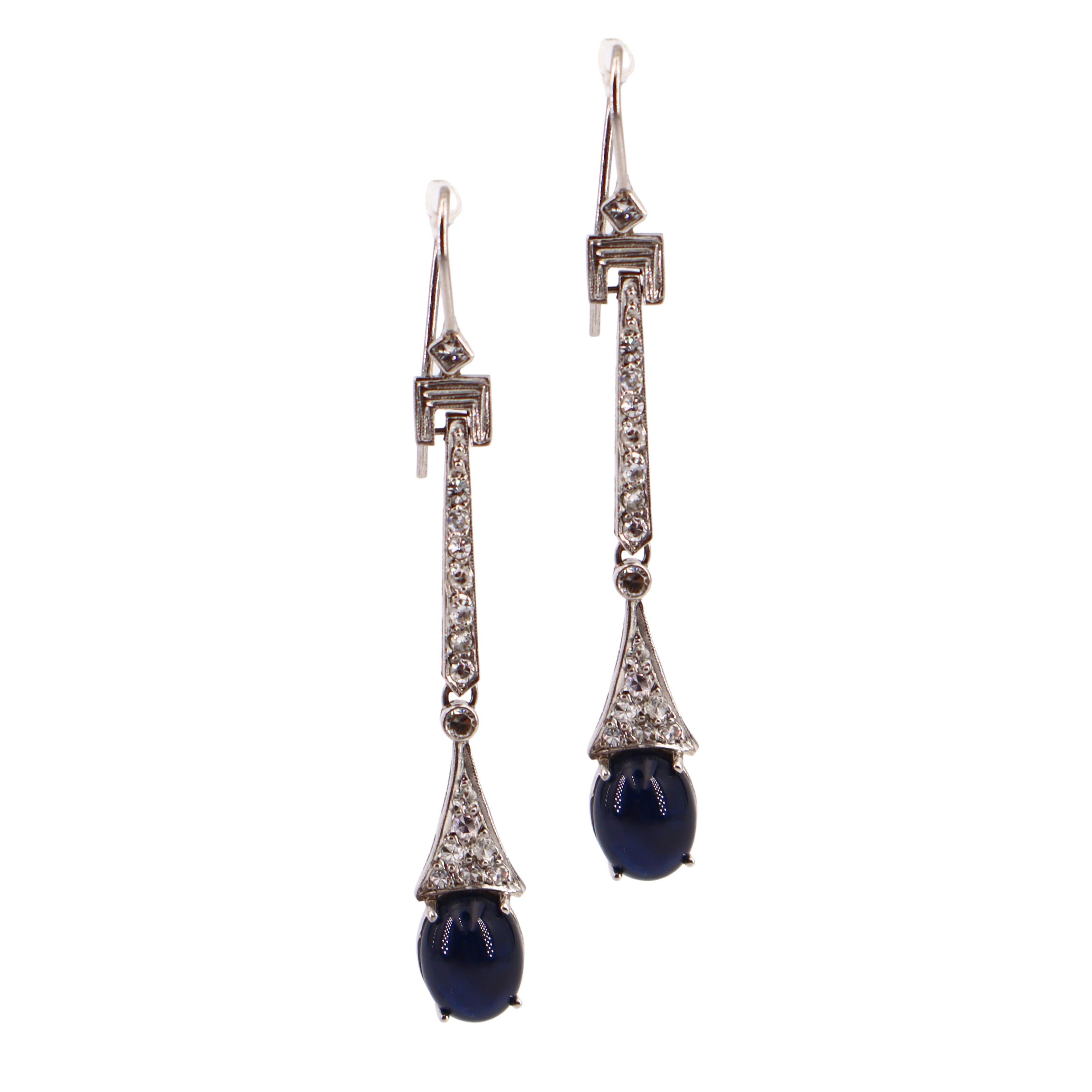 This elegant pair of dangle earrings is crafted in platinum, showcasing a harmonious blend of precious stones. Each earring features a captivating blue cabochon-cut sapphire, with a total carat weight of approximately 5.0 carats. These sapphires serve as the striking focal point of the design.