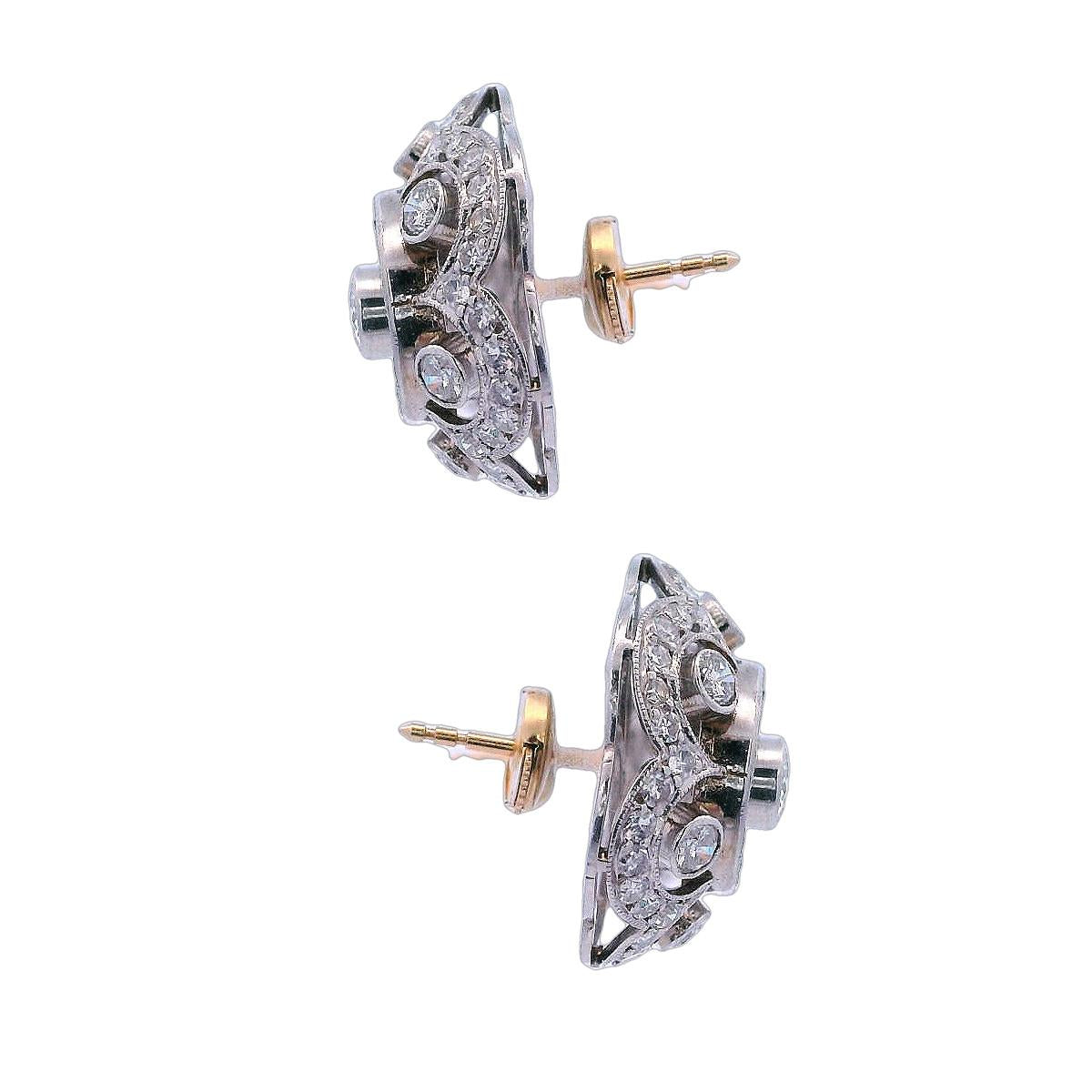 Discover a stunning pair of Art Deco style stud earrings, expertly crafted in platinum with 18kt yellow gold posts and backs for a luxurious touch. At the center of each earring are two exquisite round-cut diamonds that weigh approximately 0.50 carats combined, graded H color with VS clarity, ensuring a brilliant sparkle.