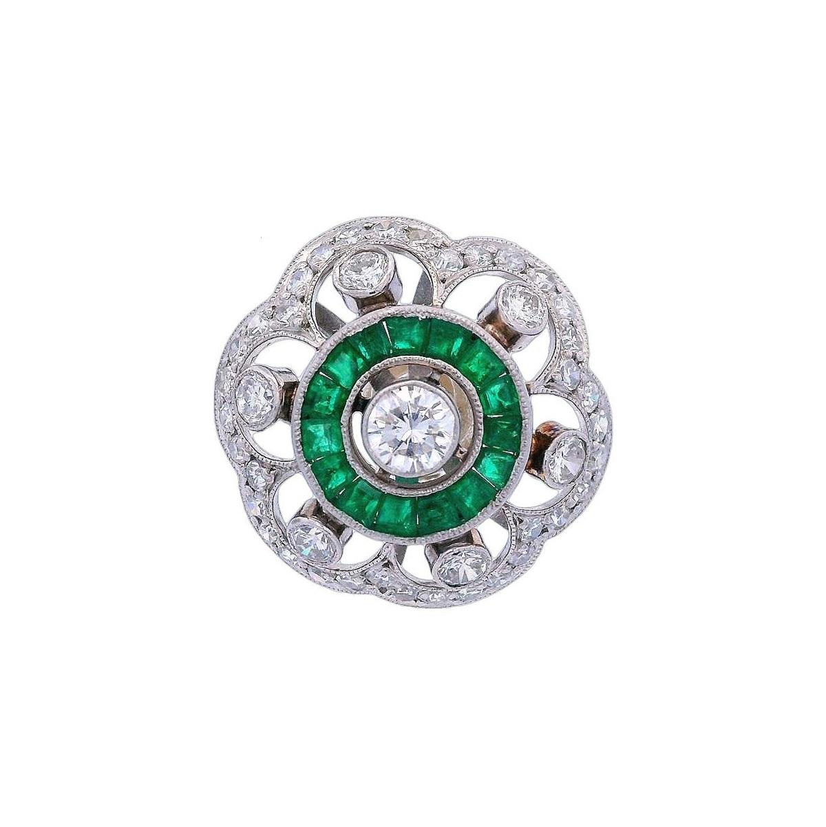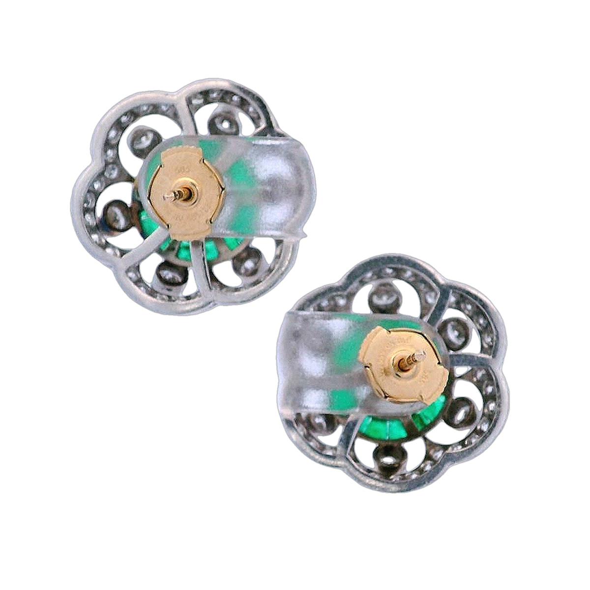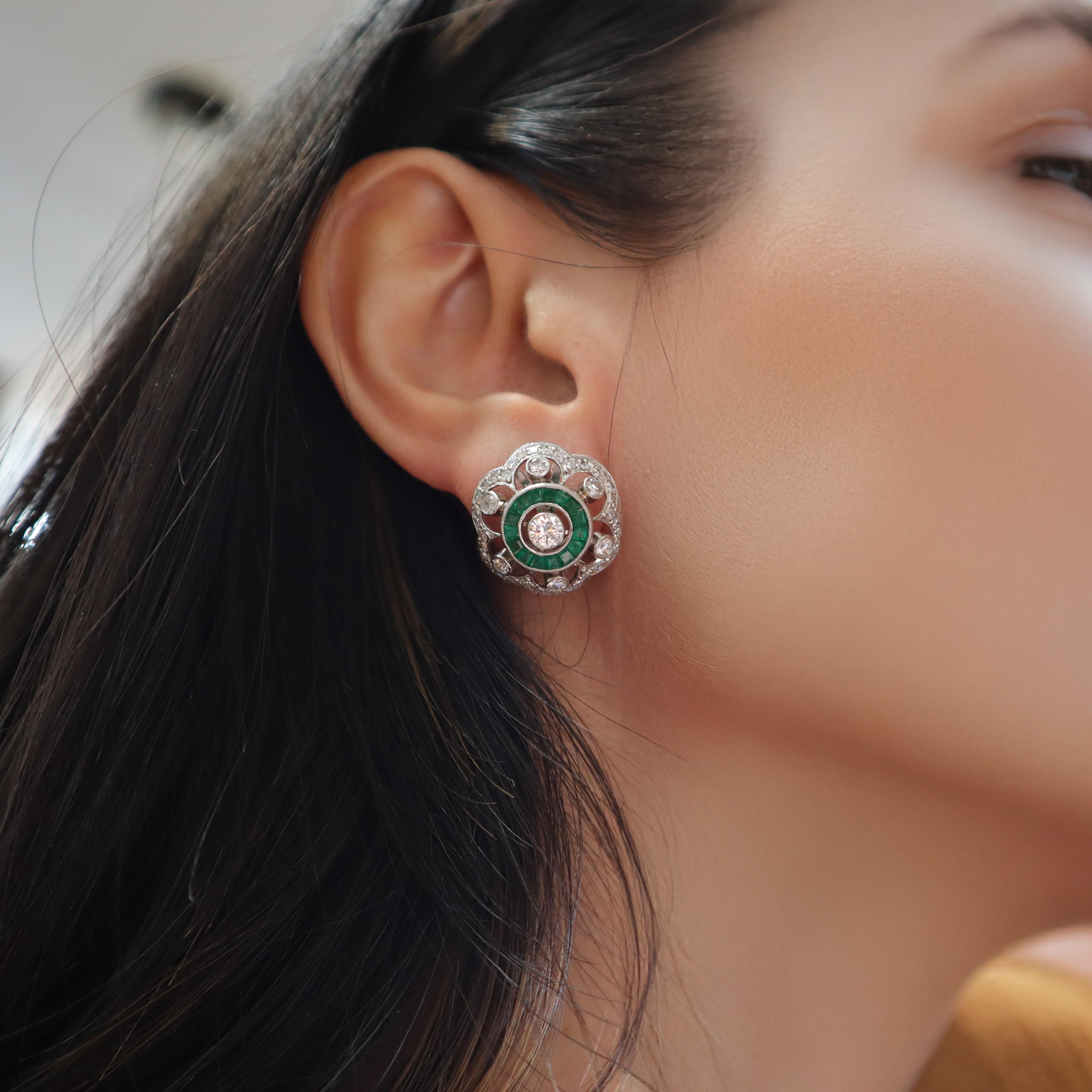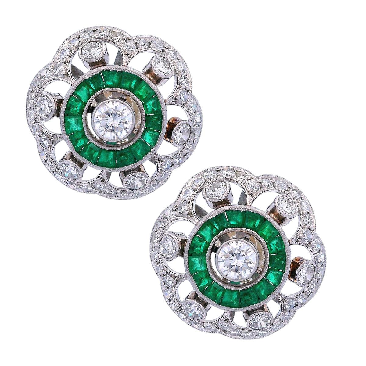 These captivating diamonds are complemented by additional round-cut diamonds totaling around 1.50 carats, graded G-H color, which enhance the earrings' overall elegance and shine. Adding to their allure, the earrings are beautifully embellished with 30 Colombian emeralds that weigh together approximately 1.10 carats, providing a vibrant splash of color and a nod to the sophistication of the Art Deco era.