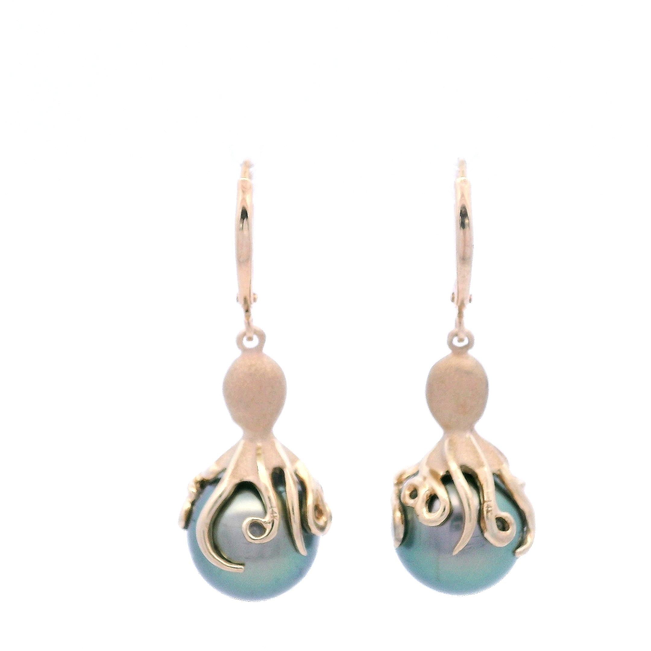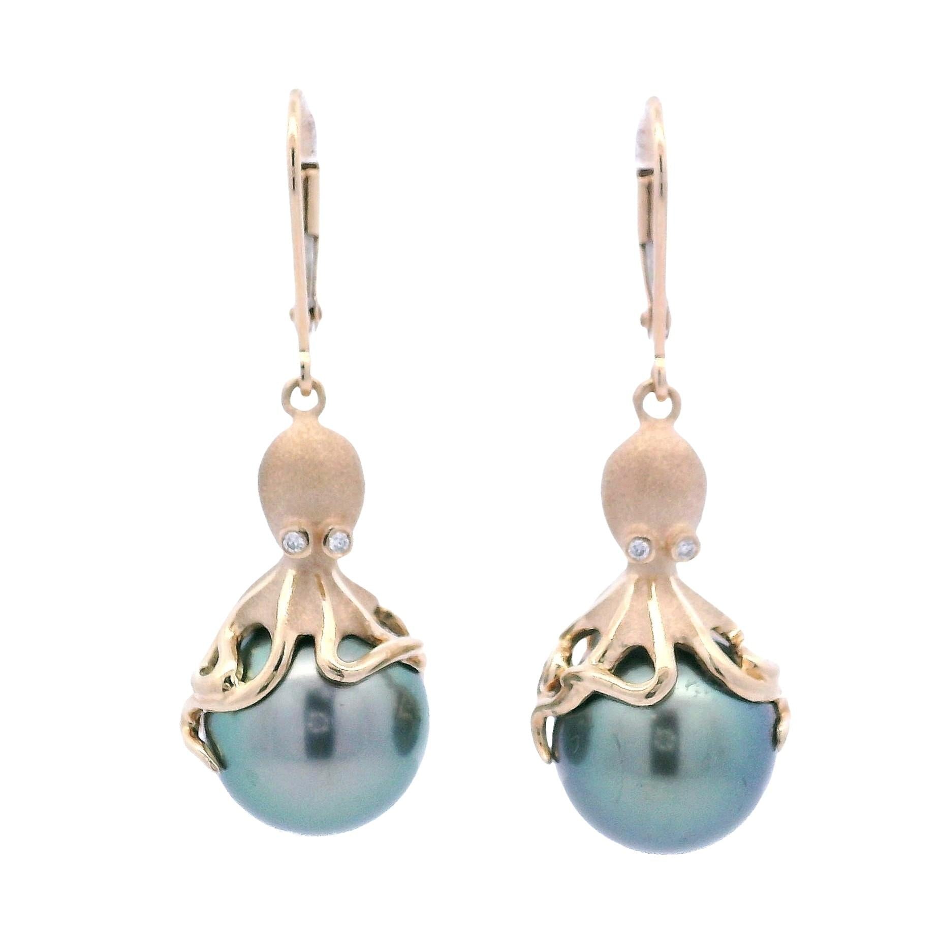 This enchanting pair of octopus earrings showcases the whimsical artistry of renowned designer Denny Wong, expertly crafted in lustrous 14kt yellow gold and featuring the designer's beloved sea creature motif. Each earring showcases an 11mm Tahitian pearl displaying the coveted dark luster and iridescent overtones that make these South Pacific gems so prized, beautifully accented with four diamonds totaling 0.02 carats that add subtle sparkle to the playful octopus design.
