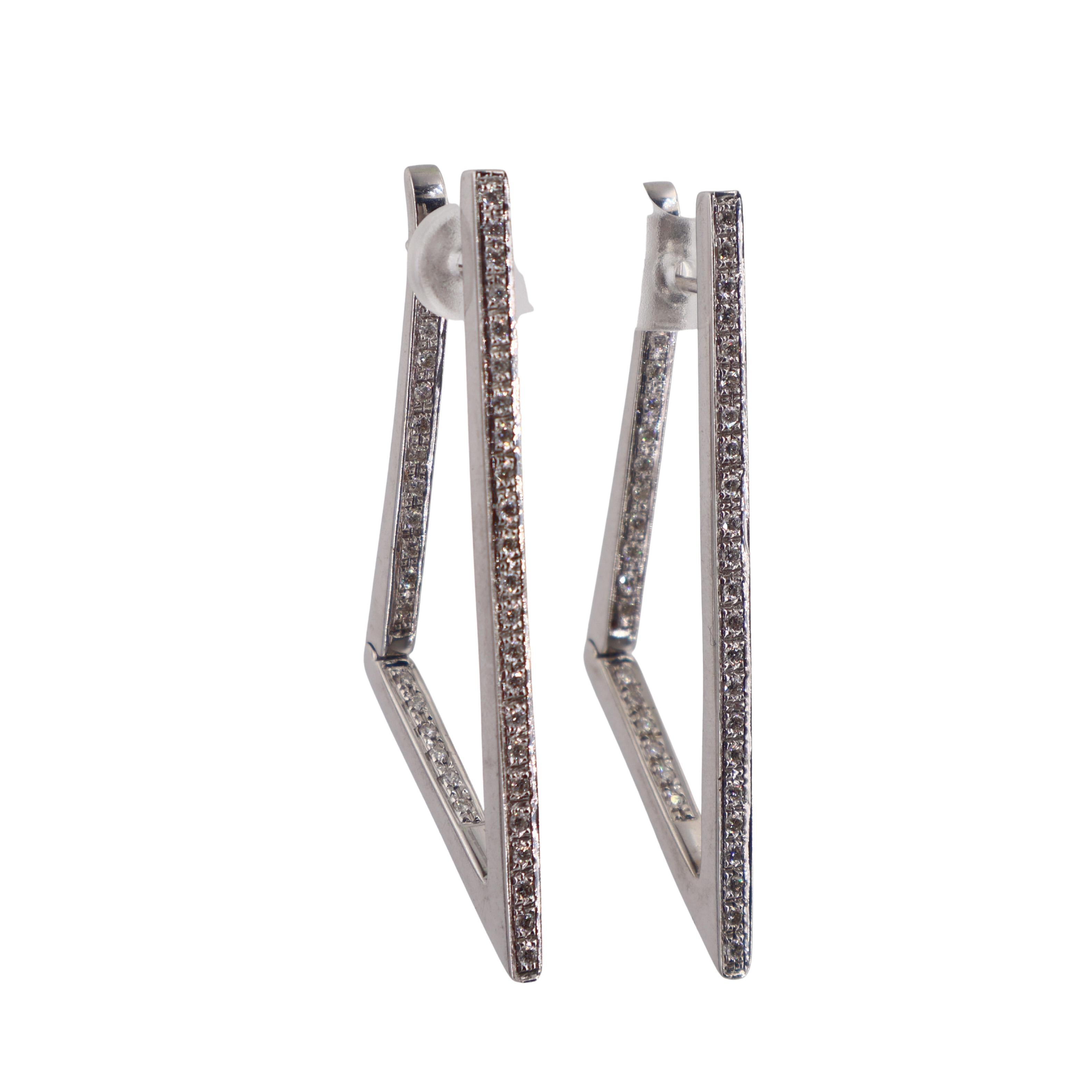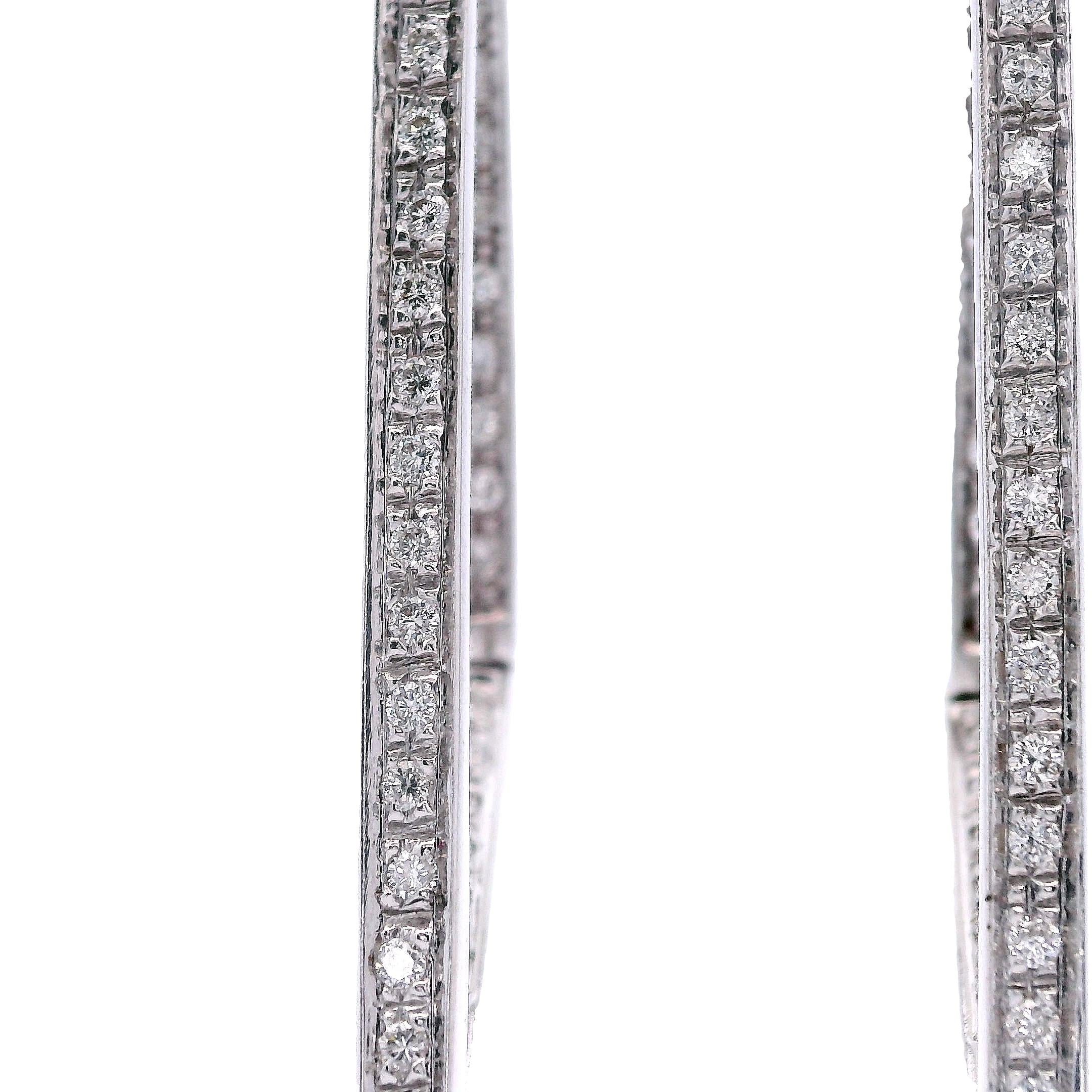 This striking pair of geometric inside-out hoop earrings is expertly crafted in 18kt gold and set with 78 natural round diamonds, together weighing approximately 1.60 carats. The diamonds, graded G-H color and VS1 clarity, are meticulously set along both the inner and outer edges, ensuring brilliant sparkle from every angle and a bold, modern silhouette.