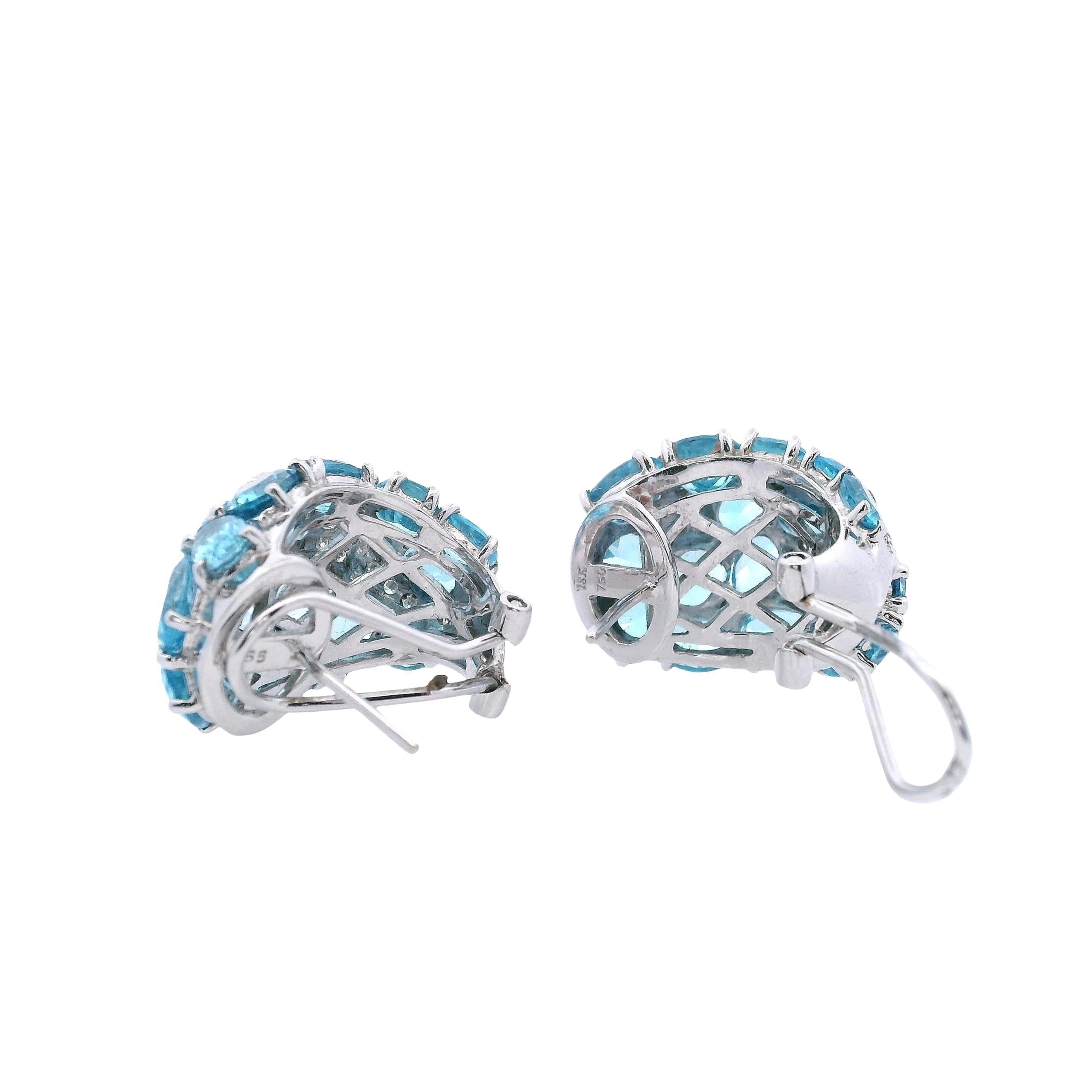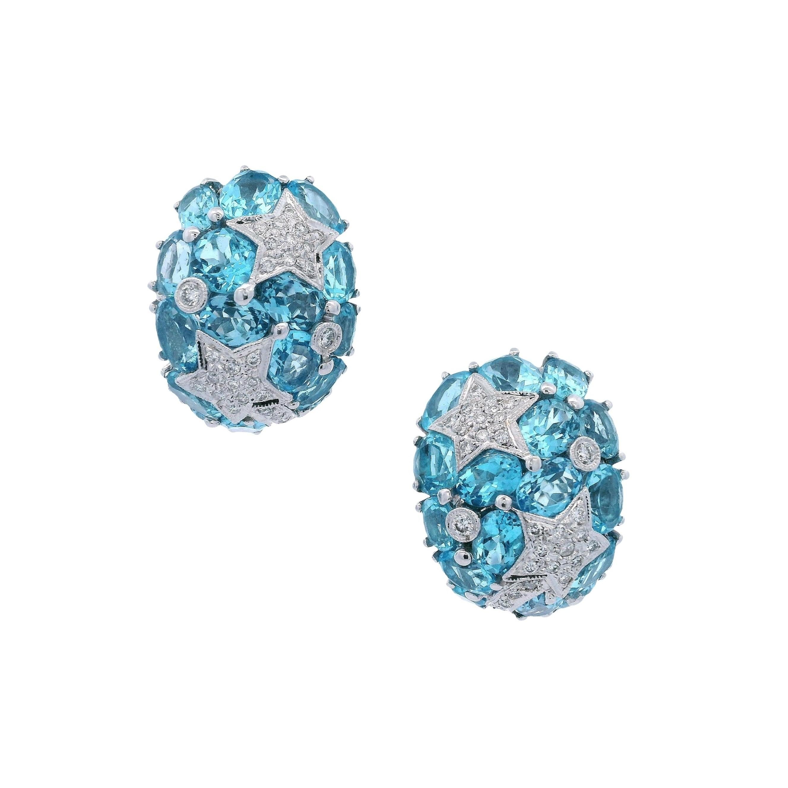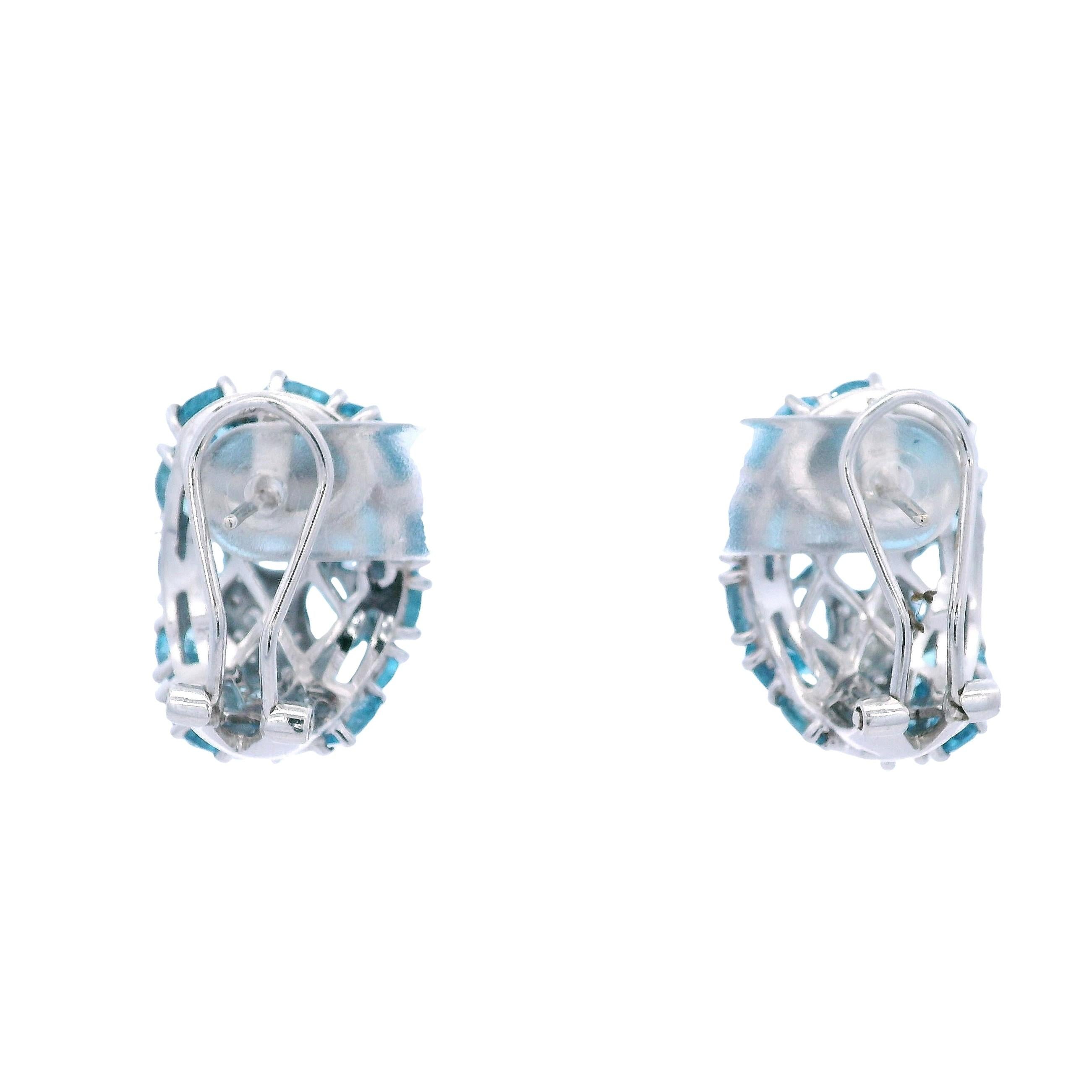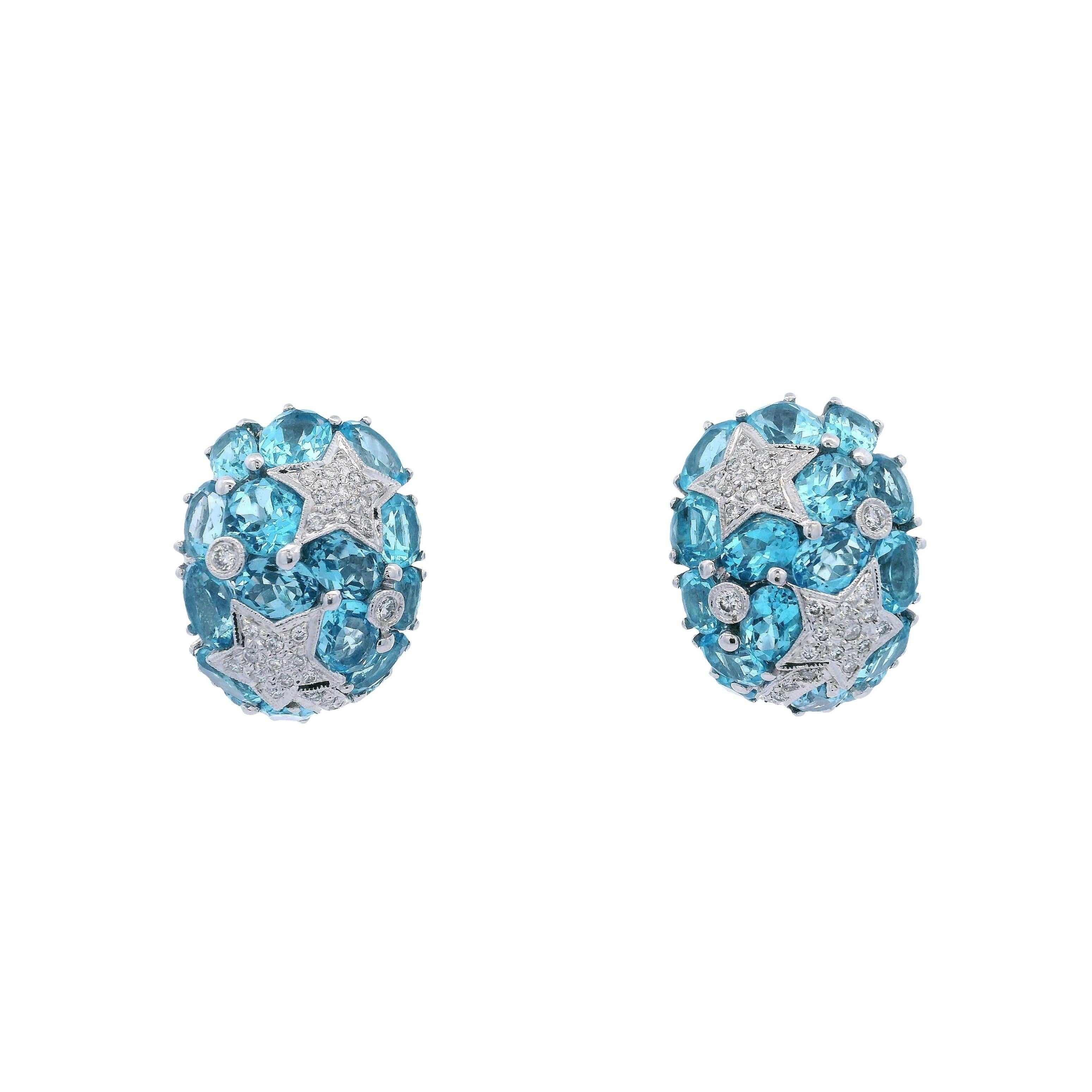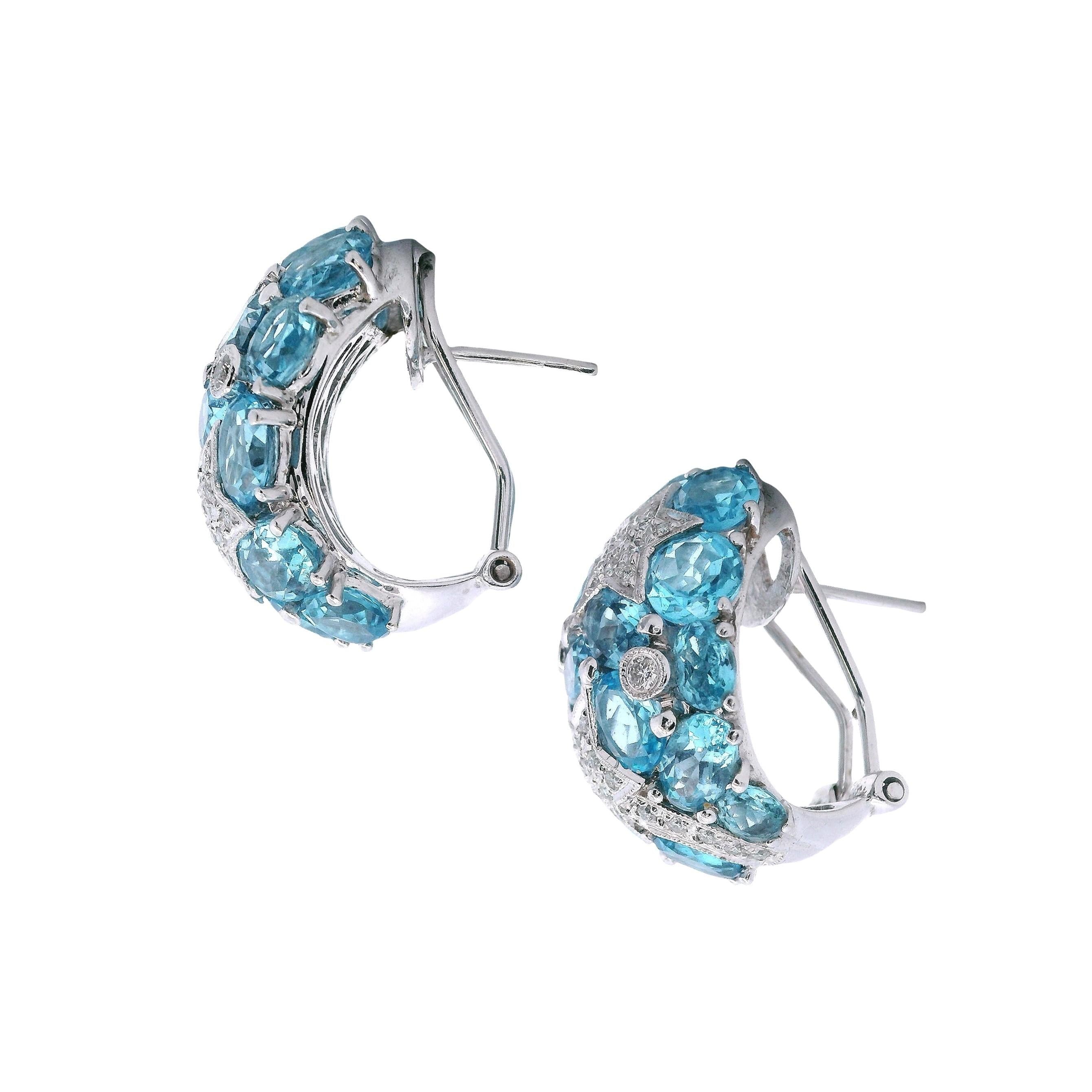 This stunning pair of hoop earrings showcases vibrant contemporary design, expertly crafted in lustrous 18kt white gold and accented with 32 oval-shaped blue topaz totaling 12.60 carats that display the coveted Swiss blue color, beautifully complemented by round-cut diamonds weighing 0.55 carats in exceptional G color and VS2 clarity. The sophisticated arrangement of oval topaz creates dynamic color and movement, while the precision-set diamonds add brilliant sparkle that enhances the topaz's natural beauty.