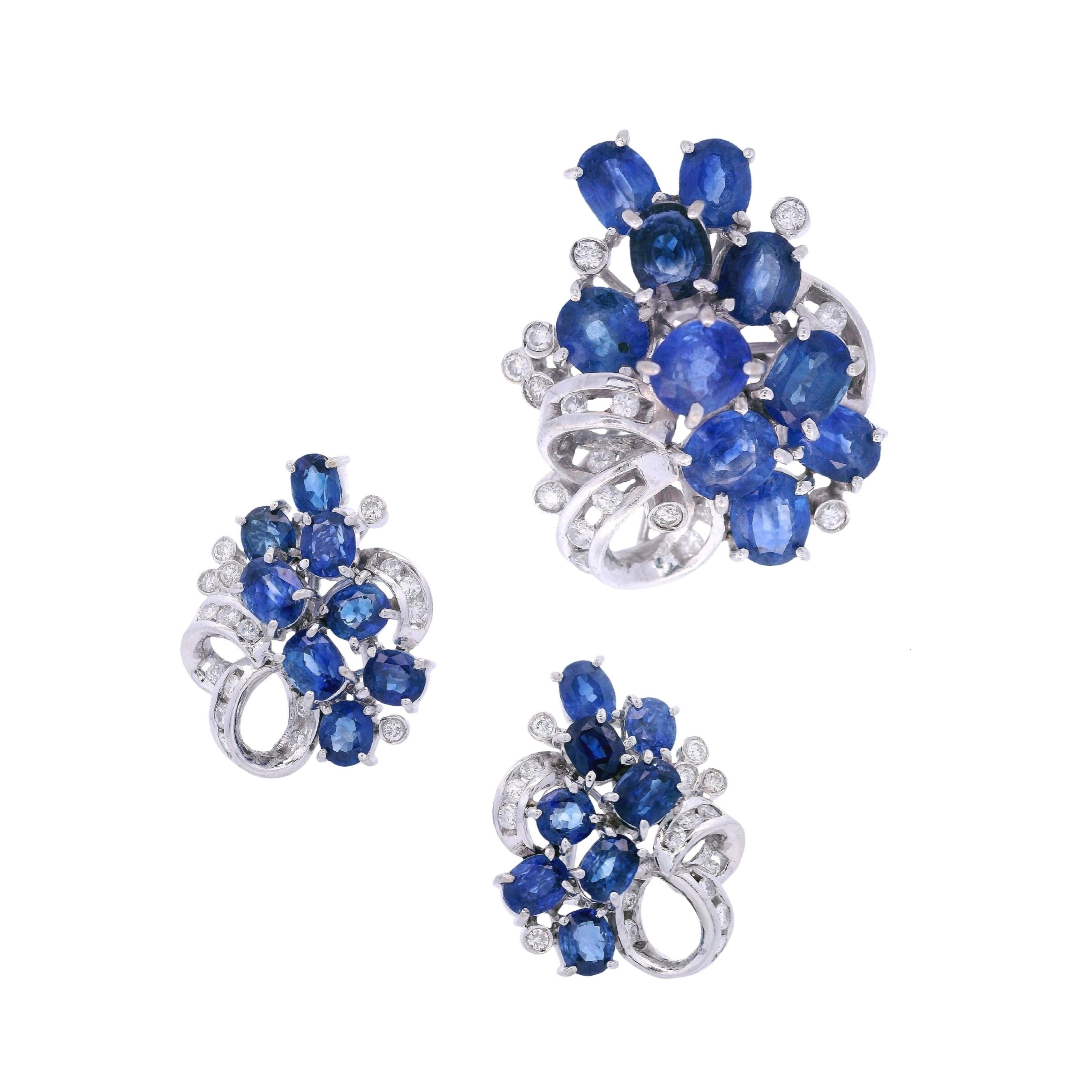 The overall condition of this suite is excellent. There is no damage to the white gold settings. All sapphires and diamonds are securely set, displaying beautiful color, clarity, and craftsmanship throughout.