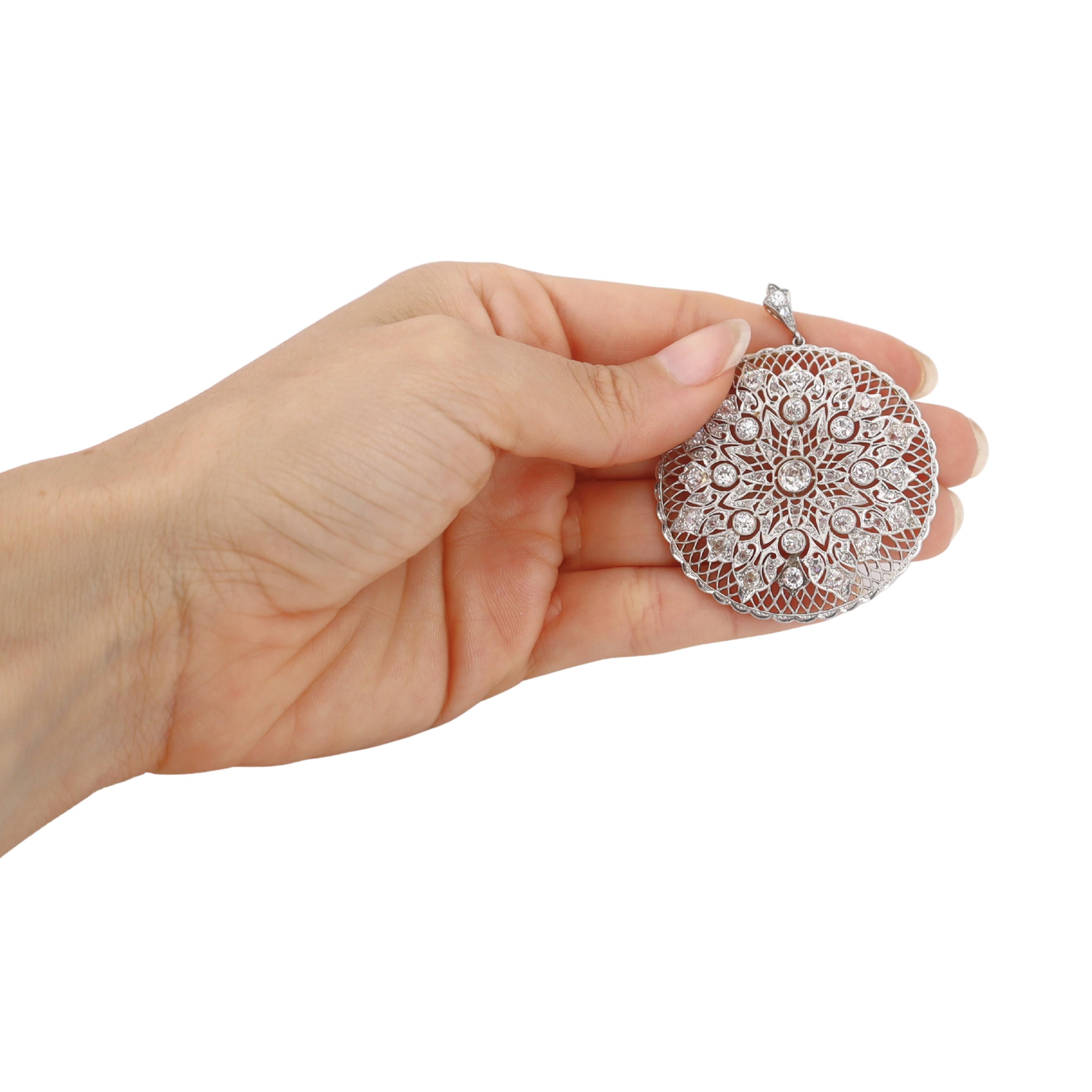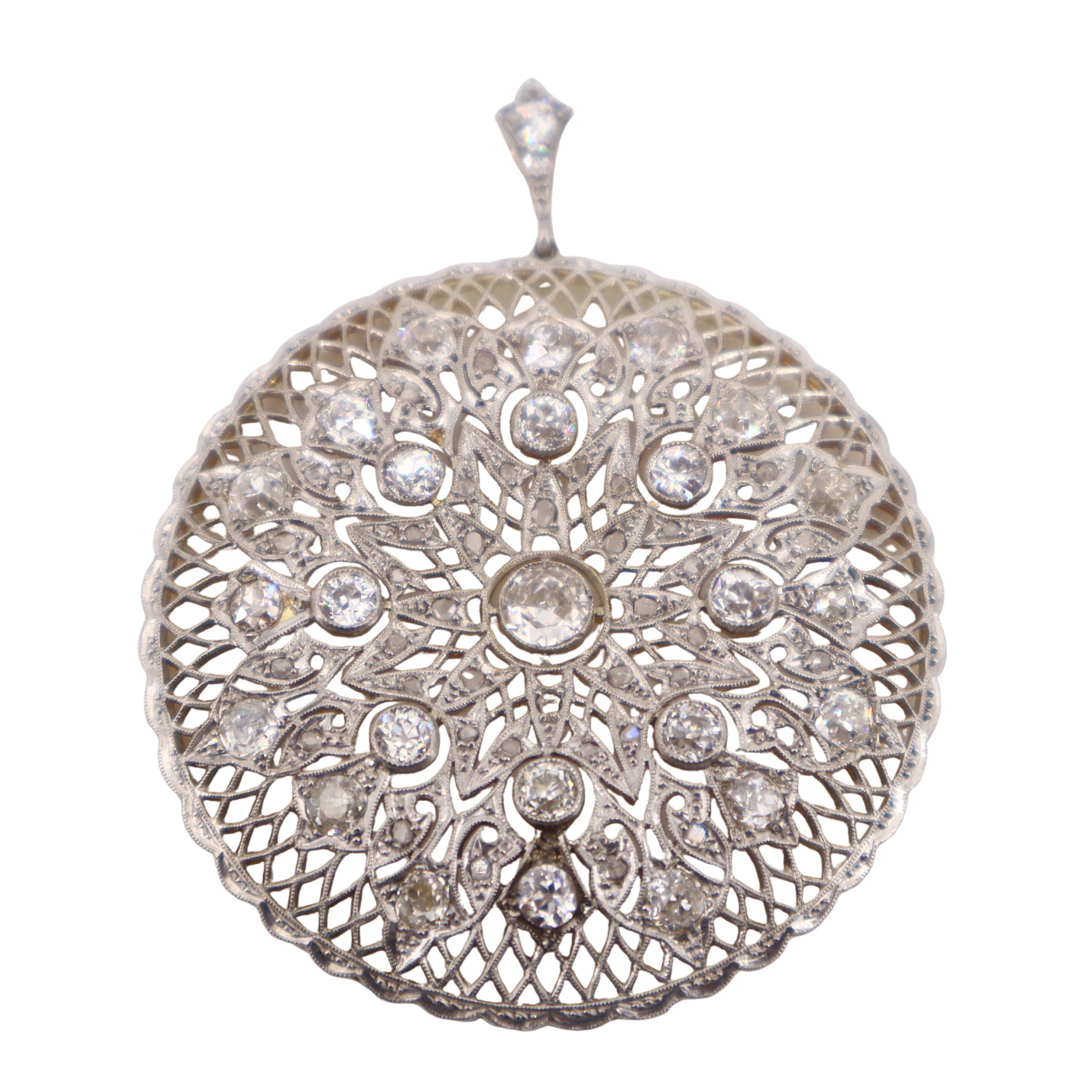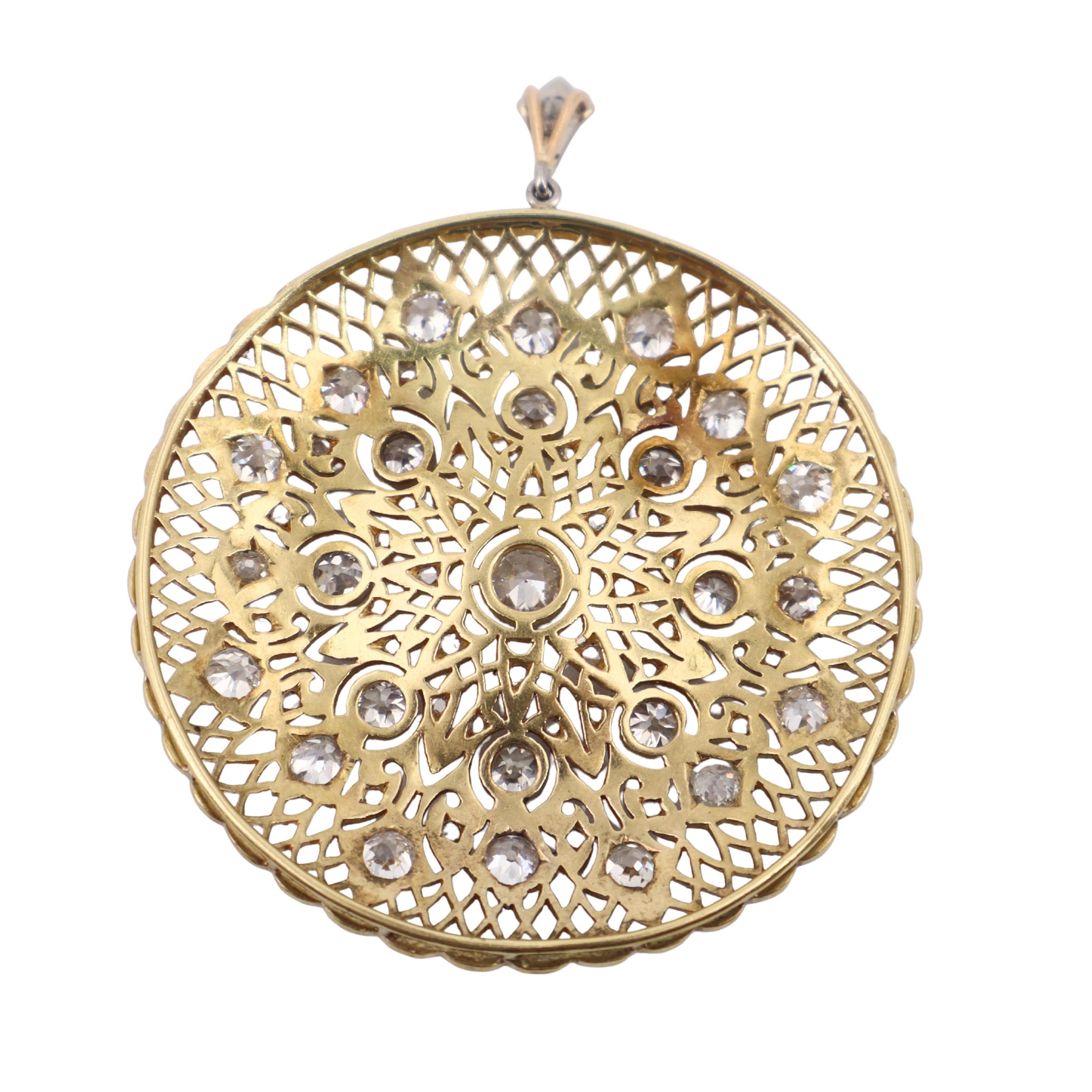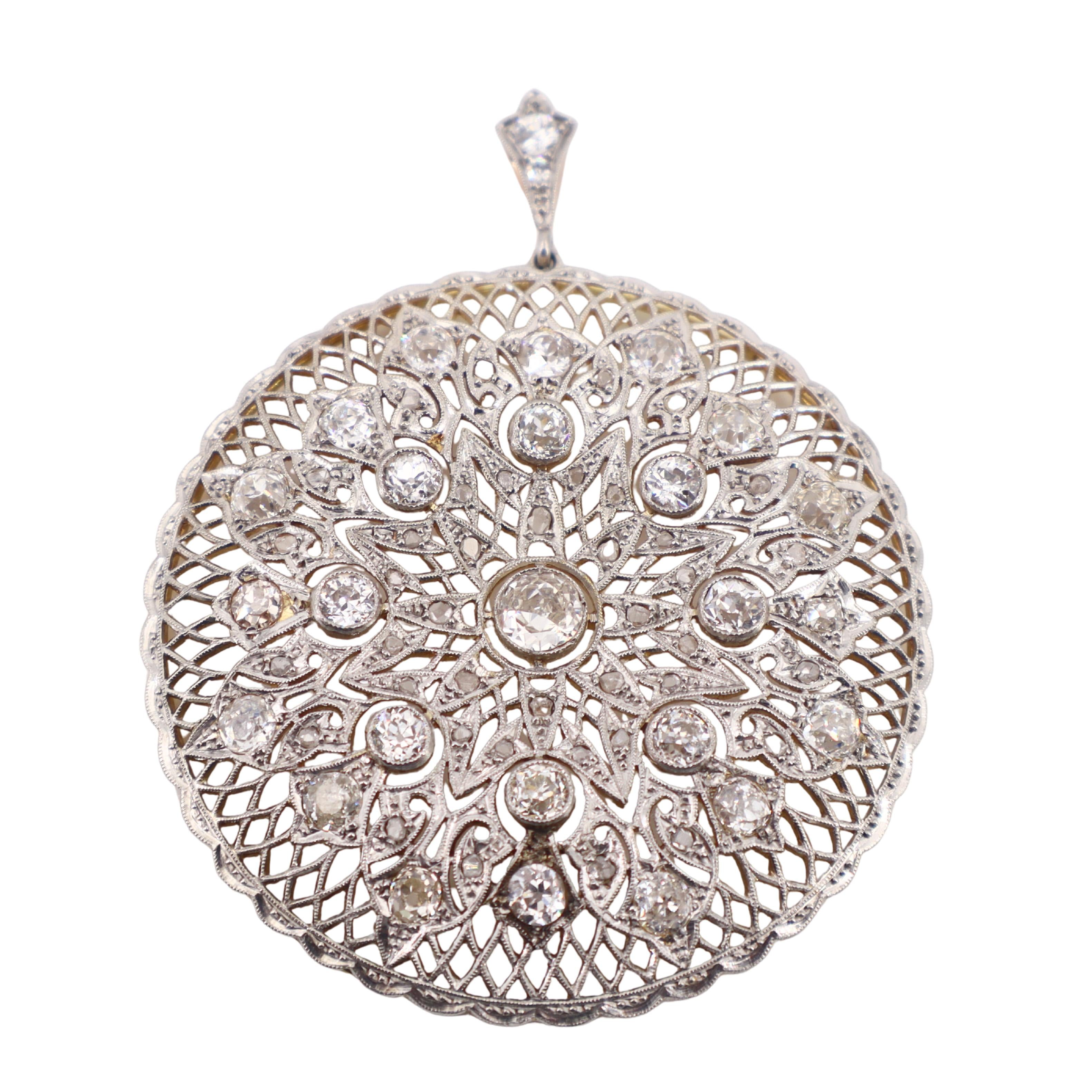 This extraordinary circa 1900s Belle Epoque filigree pendant represents the pinnacle of Edwardian craftsmanship, expertly crafted in lustrous 18kt yellow gold with platinum detailing and featuring a beautiful 0.50-carat old mine diamond in J color and SI1 clarity as its captivating centerpiece, magnificently surrounded by 25 old mine and rose-cut diamonds totaling 4.20 carats in J-K color and VS-SI clarity. The intricate filigree work creates delicate lace-like patterns that showcase the romantic artistry of the Belle Epoque era, while the impressive 1.80-inch diameter creates dramatic presence.