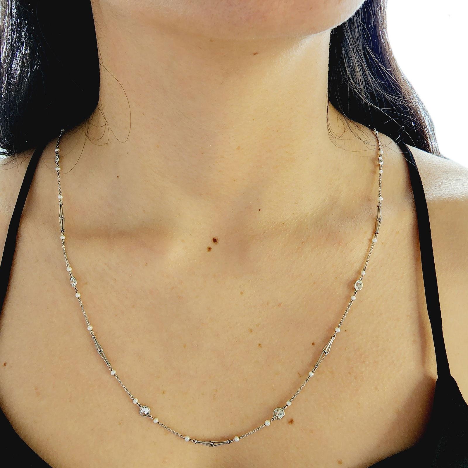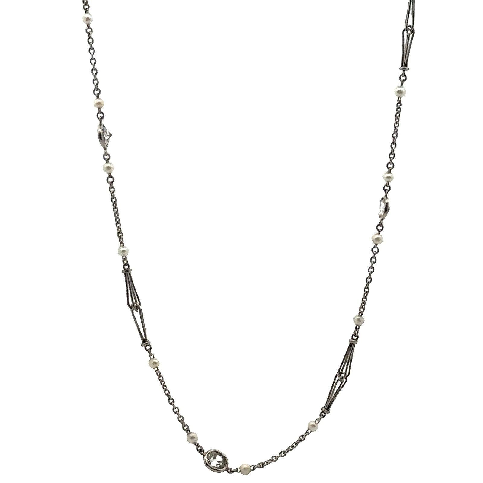 Measuring 25.0 inches (63.5 cm) in length and weighing 8.5 grams, the chain has been tested for platinum and remains in excellent condition. The combination of luminous pearls and sparkling period-cut diamonds exemplifies the grace and sophistication of the era.