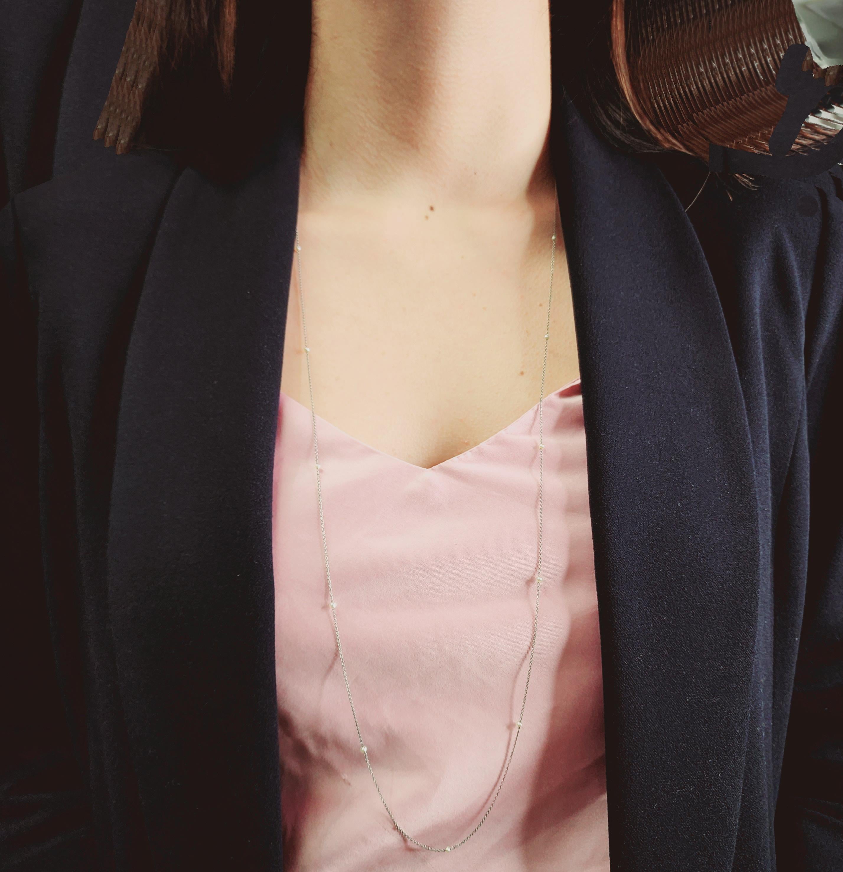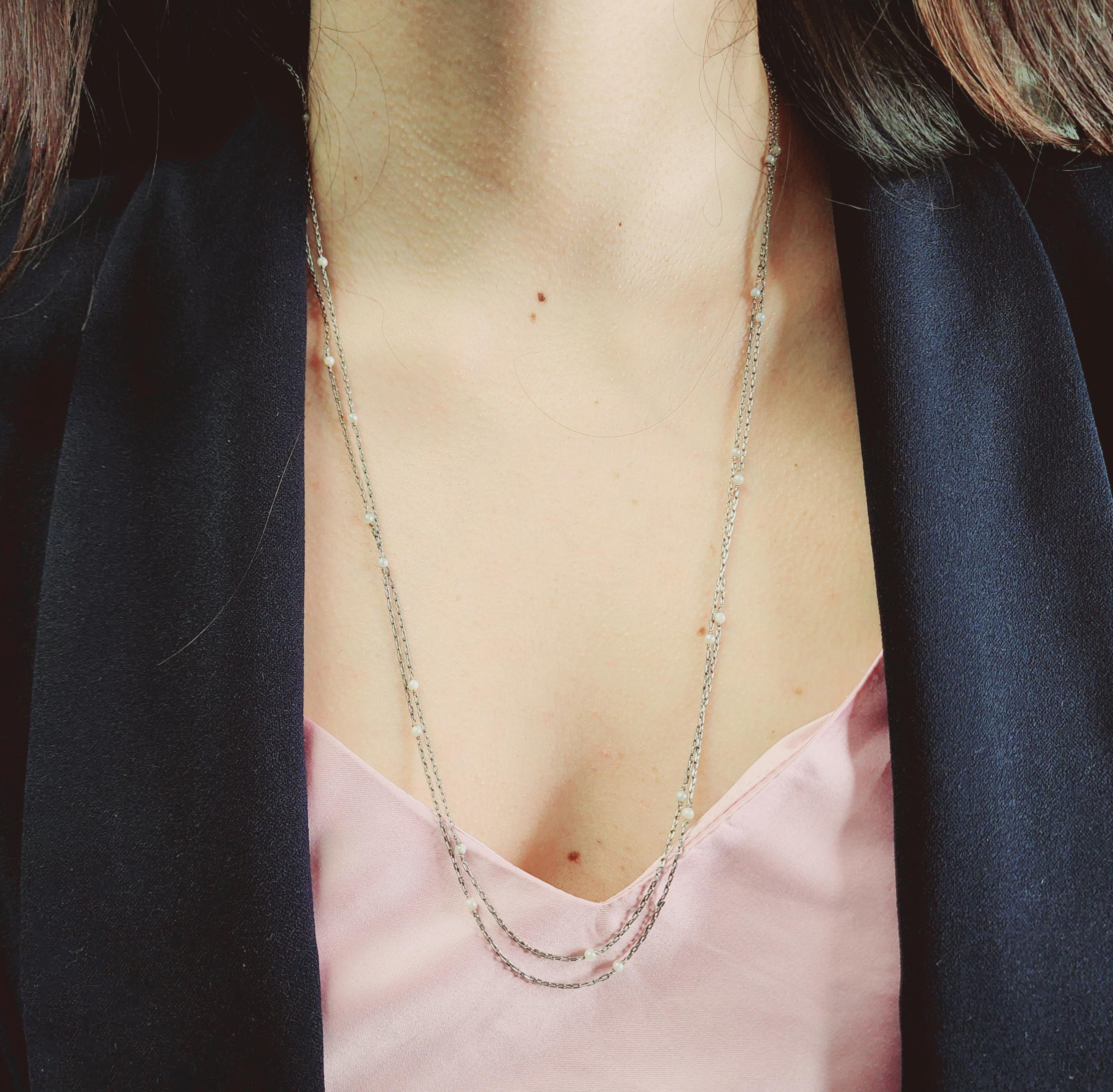 Introducing this truly captivating piece of history, the antique long platinum chain featuring micro pearls that exudes an air of elegance and sophistication, transporting you to a bygone era of opulence and grace. Crafted with utmost precision and artistry, this platinum chain showcases the impeccable workmanship of skilled artisans, with the lustrous platinum metal known for its timeless allure gracefully draping with its impressive 76-inch length that enhances every movement with a touch of brilliance.