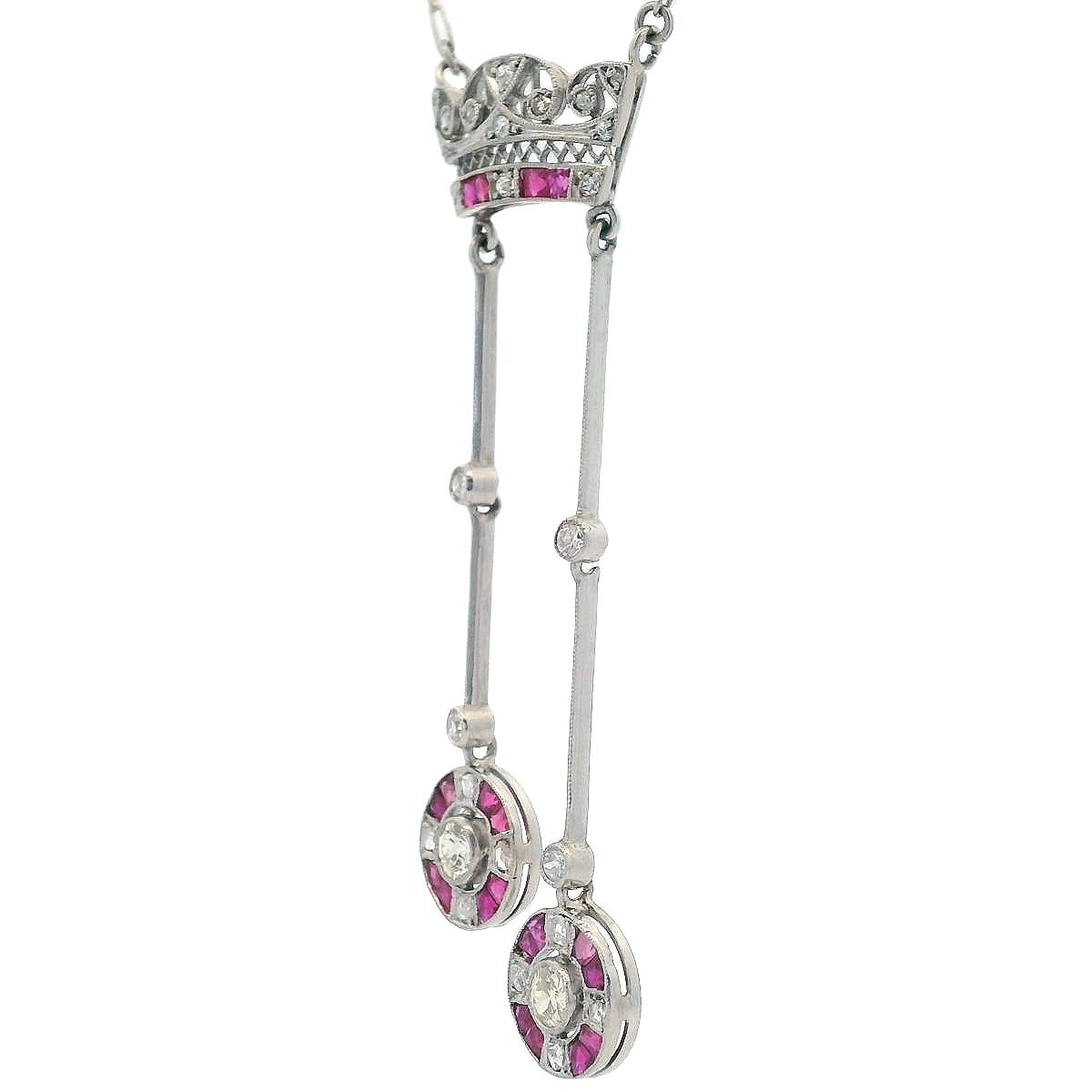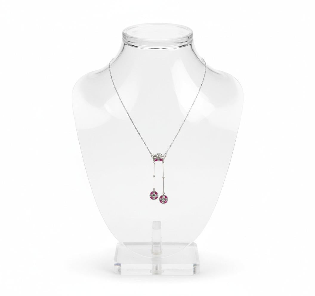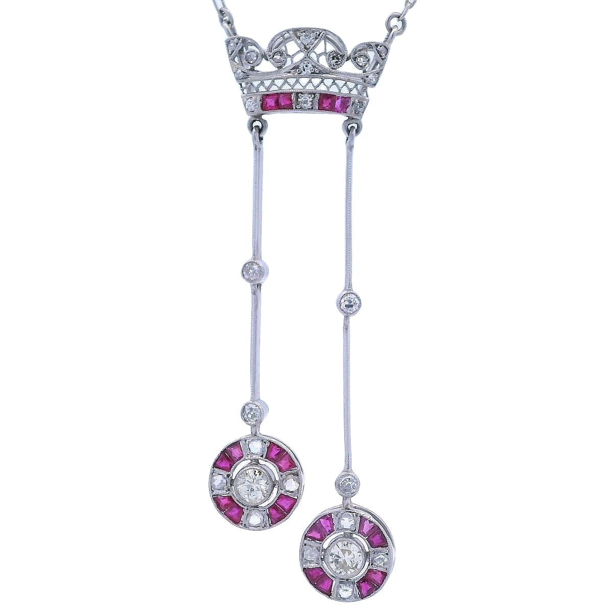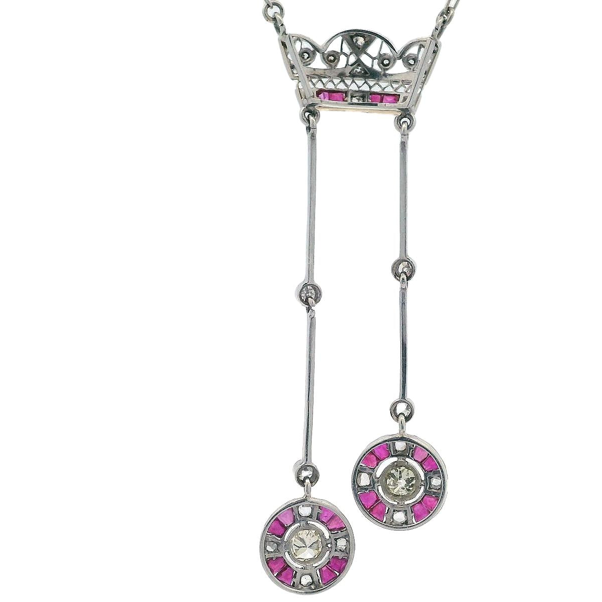 CONDITION & AUTHENTICITY: The overall condition of this piece is very good. There is no damage to the platinum setting or chain. All diamonds and French-cut rubies are securely set in their original mountings, displaying exceptional Art Deco period craftsmanship.