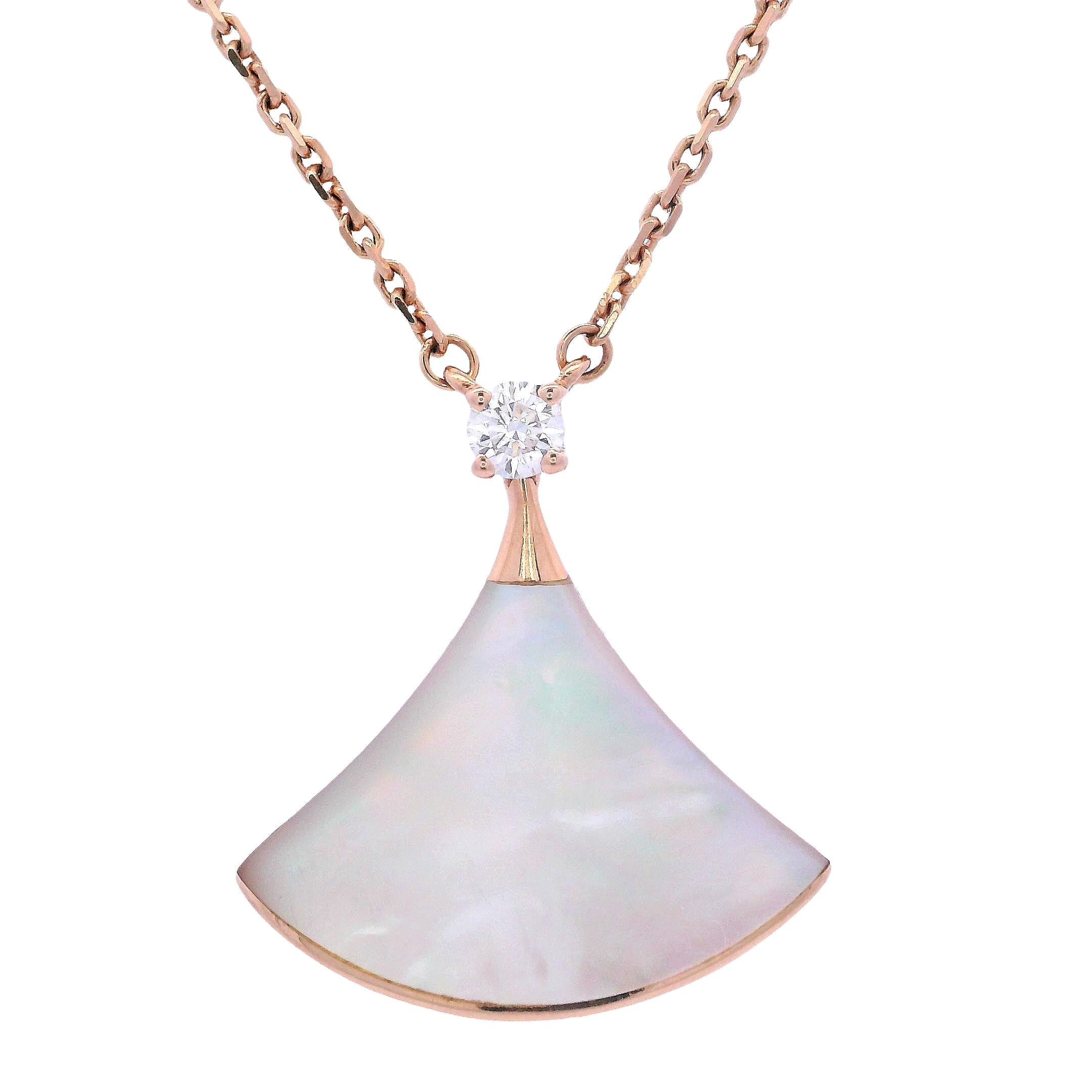 A refined symbol of contemporary luxury, this BVLGARI Divas’ Dream necklace is expertly crafted in 18kt yellow gold and features the collection’s signature fan motif, inspired by ancient Roman mosaics and the sensual curves of Caracalla’s Baths. At the heart of the pendant, a luminous mother-of-pearl inlay is set with a single round brilliant-cut diamond weighing 0.10 carats, graded F color and VS clarity, adding a delicate yet radiant sparkle.