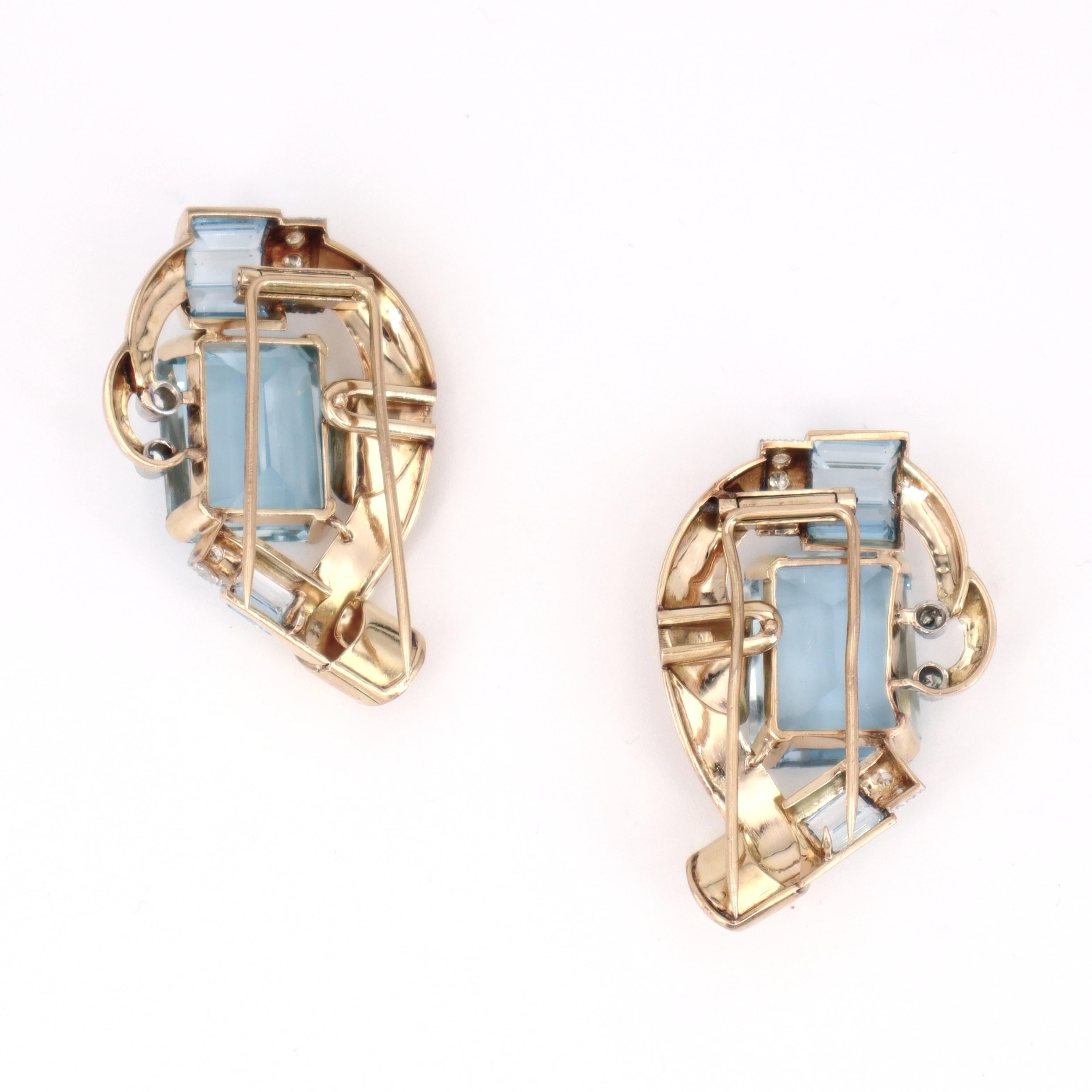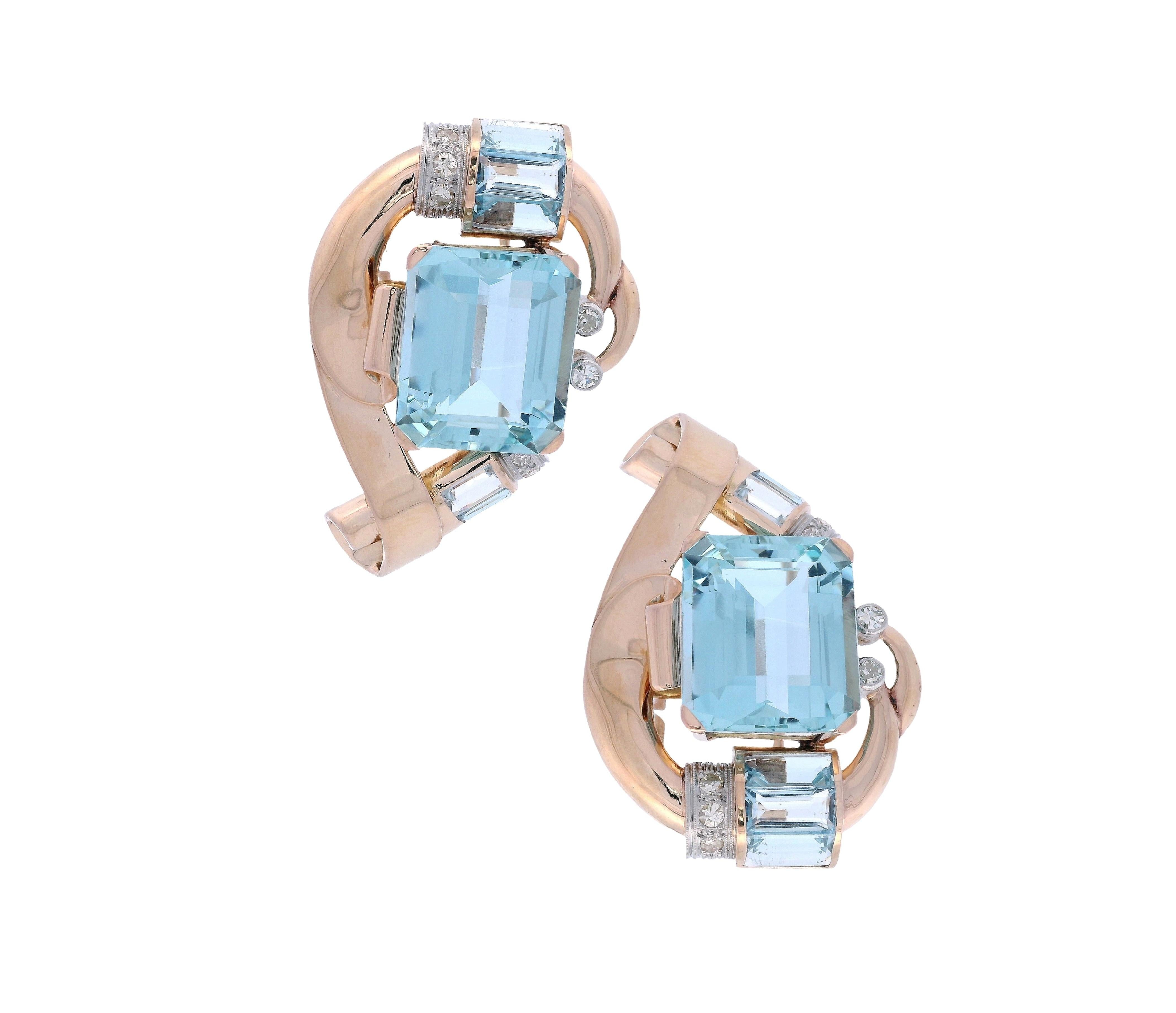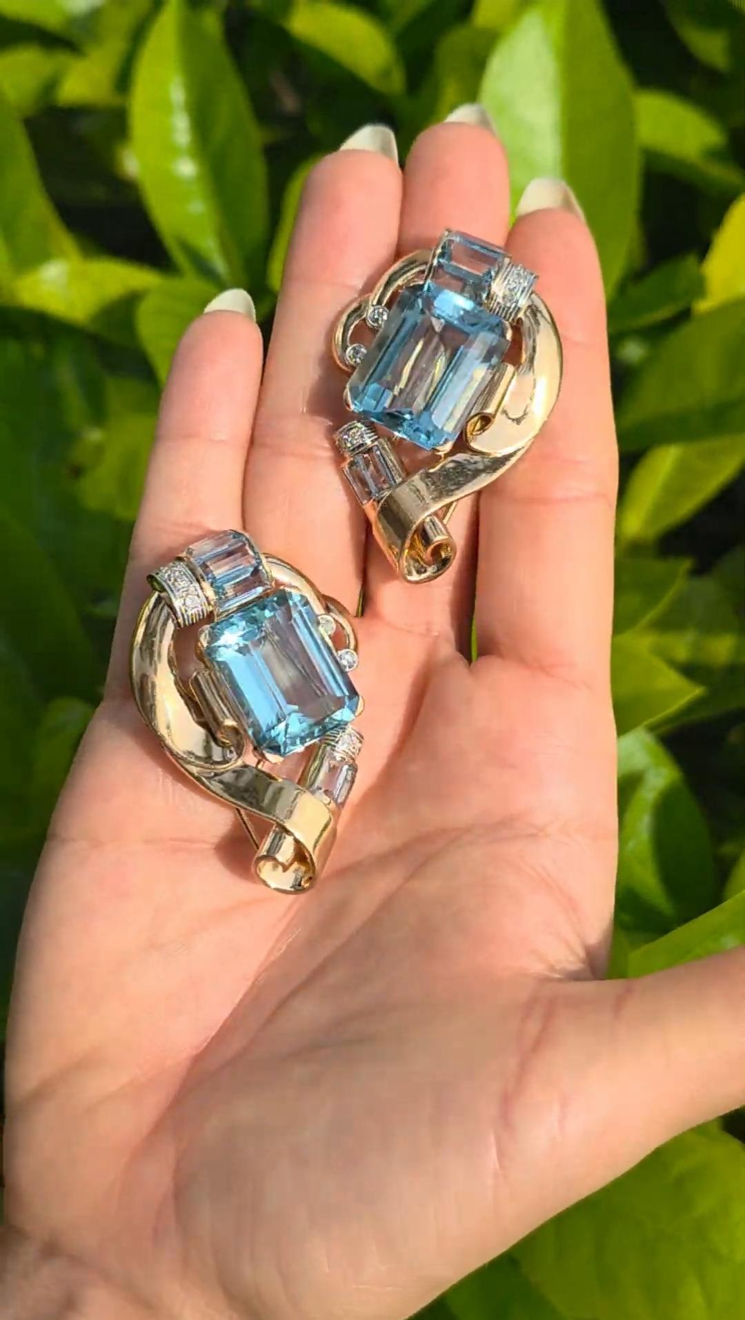 This extraordinary pair of 1940s Retro double clip earrings exudes opulence and grandeur, meticulously crafted in lustrous 18kt yellow and white gold and featuring 2 magnificent natural aquamarines totaling 44.80 carats (each measuring 20x16x10 mm) as their awe-inspiring centerpieces, beautifully accented by 10 natural rectangular-shaped aquamarines weighing 8.0 carats and embellished with single-cut diamonds totaling 0.36 carats. These breathtaking aquamarines showcase a captivating blue hue reminiscent of crystal-clear tropical paradise waters, commanding attention with their mesmerizing presence and undeniable beauty.