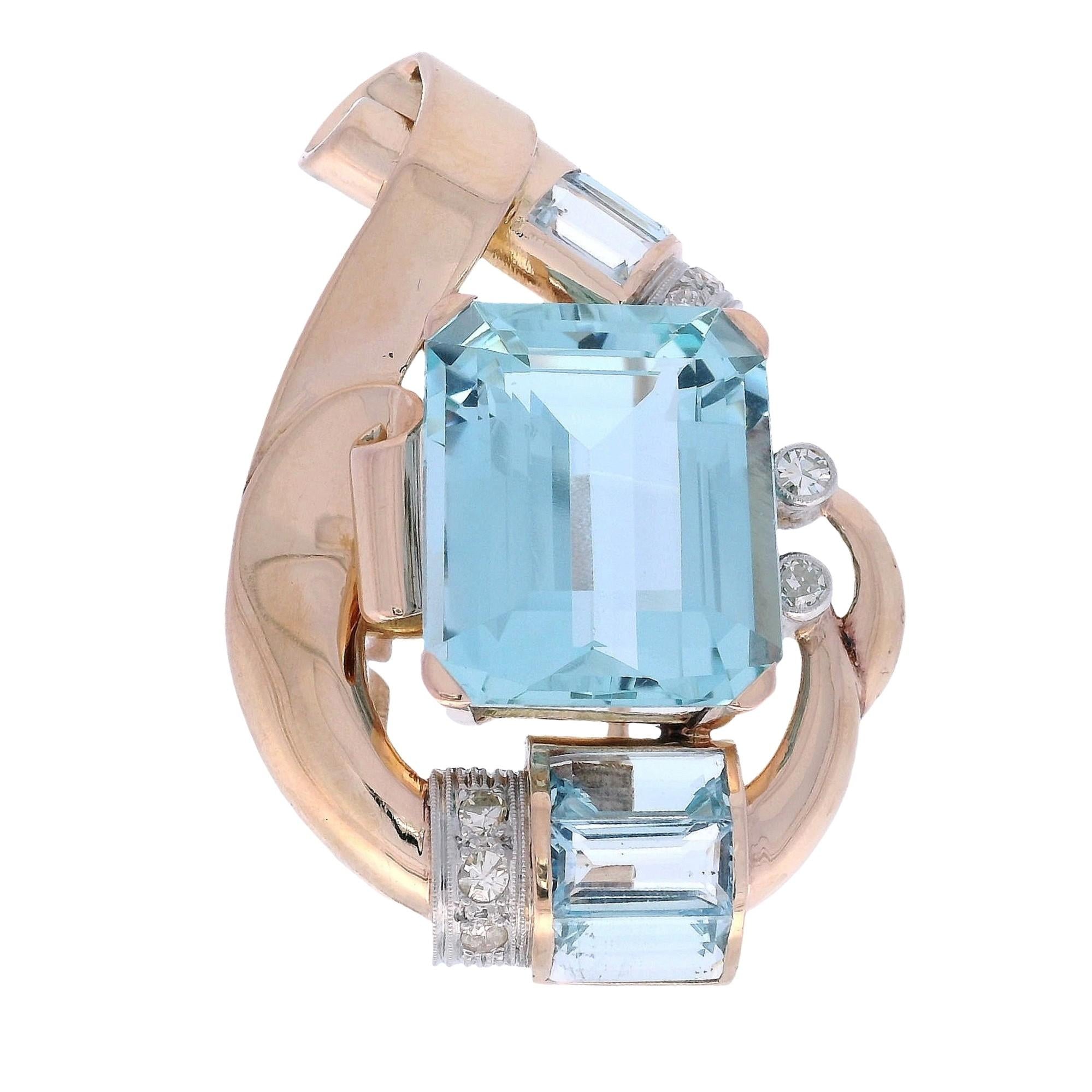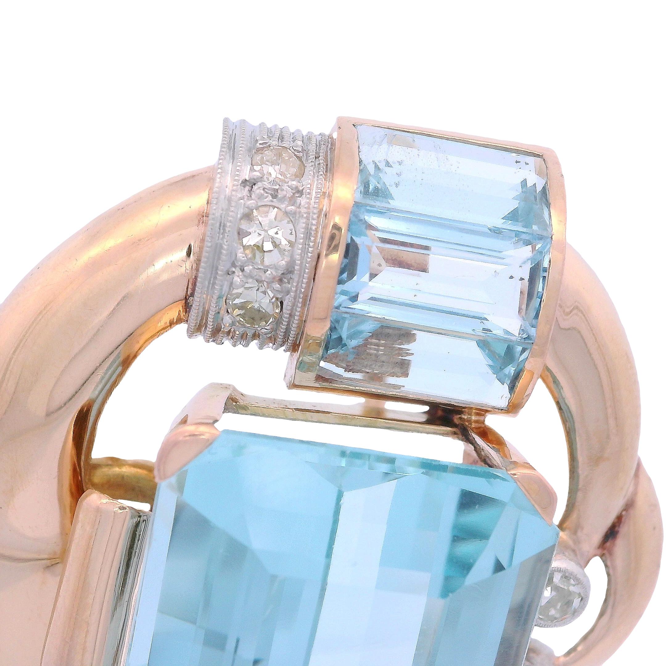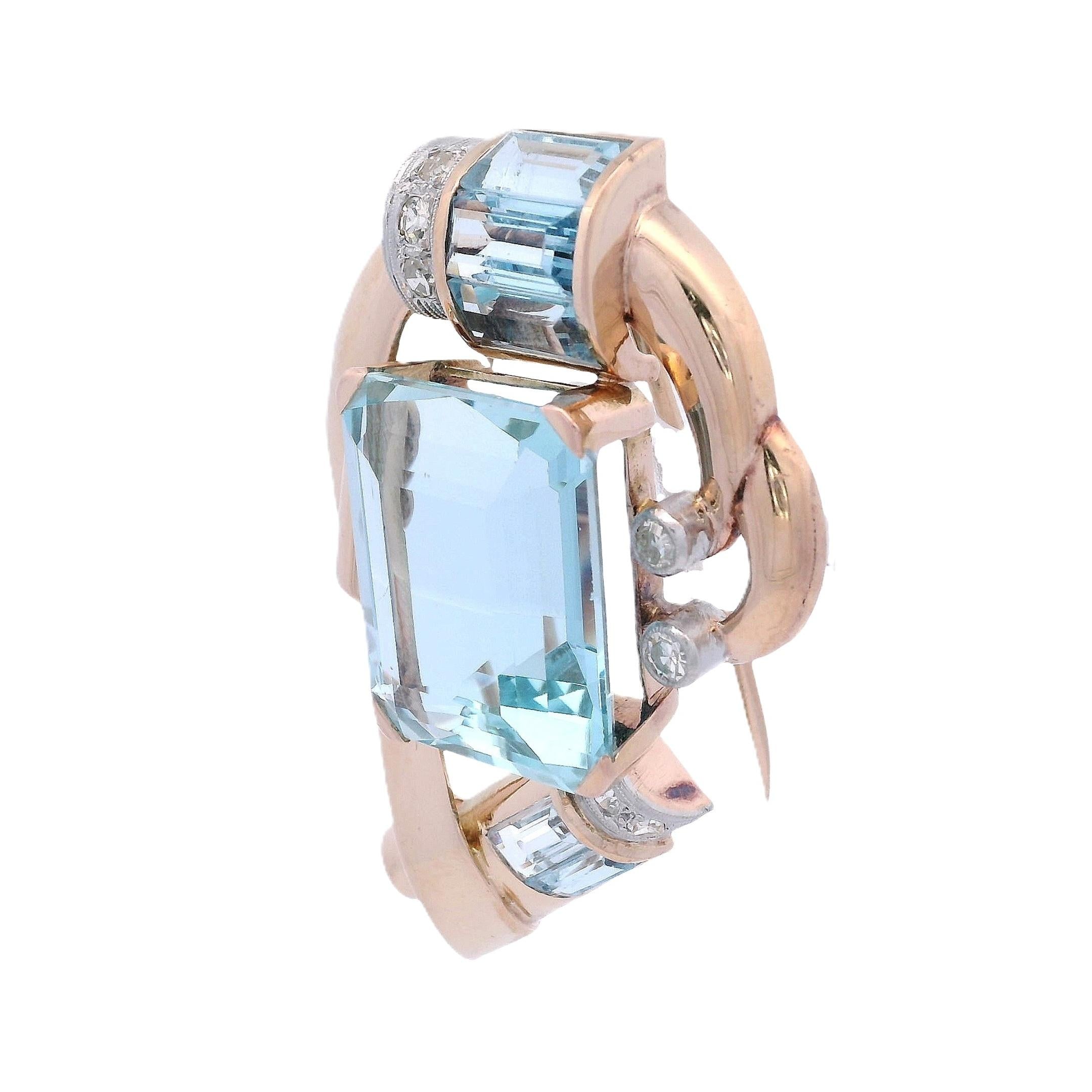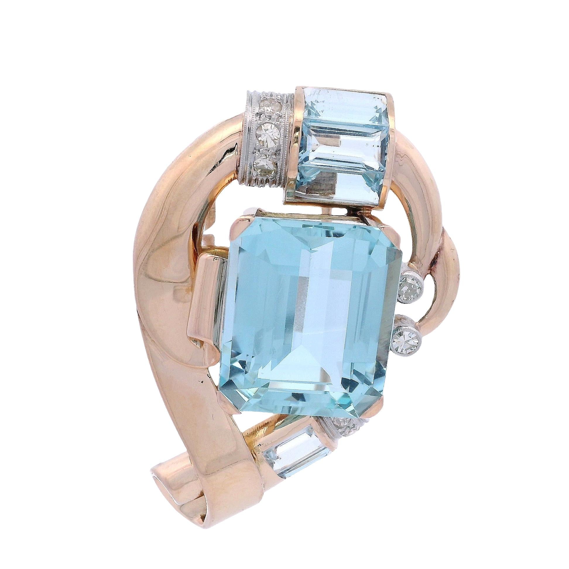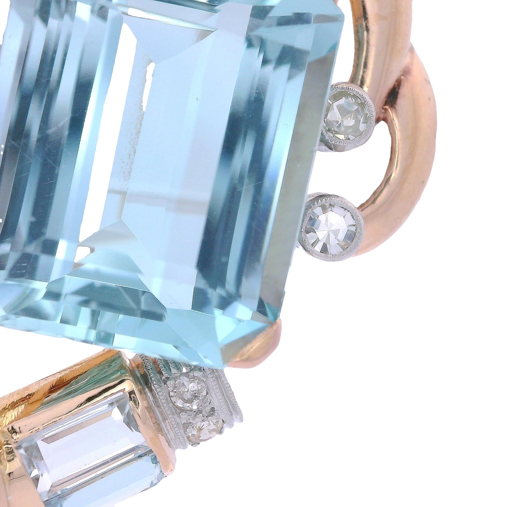 The exceptional 44.80-carat center aquamarines represent museum-quality size and rarity, while the sophisticated two-tone gold combination and bold geometric design perfectly capture the dramatic elegance of the 1940s Retro period.