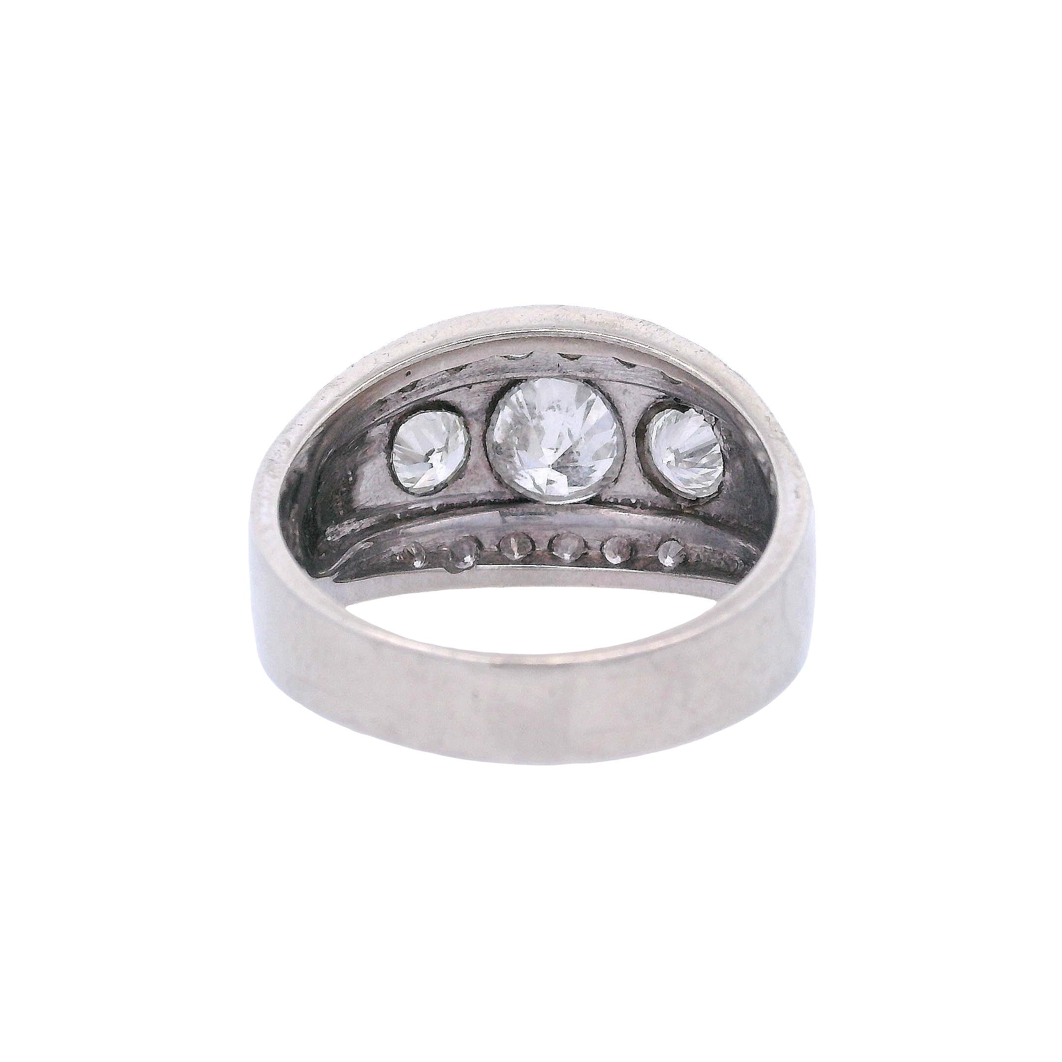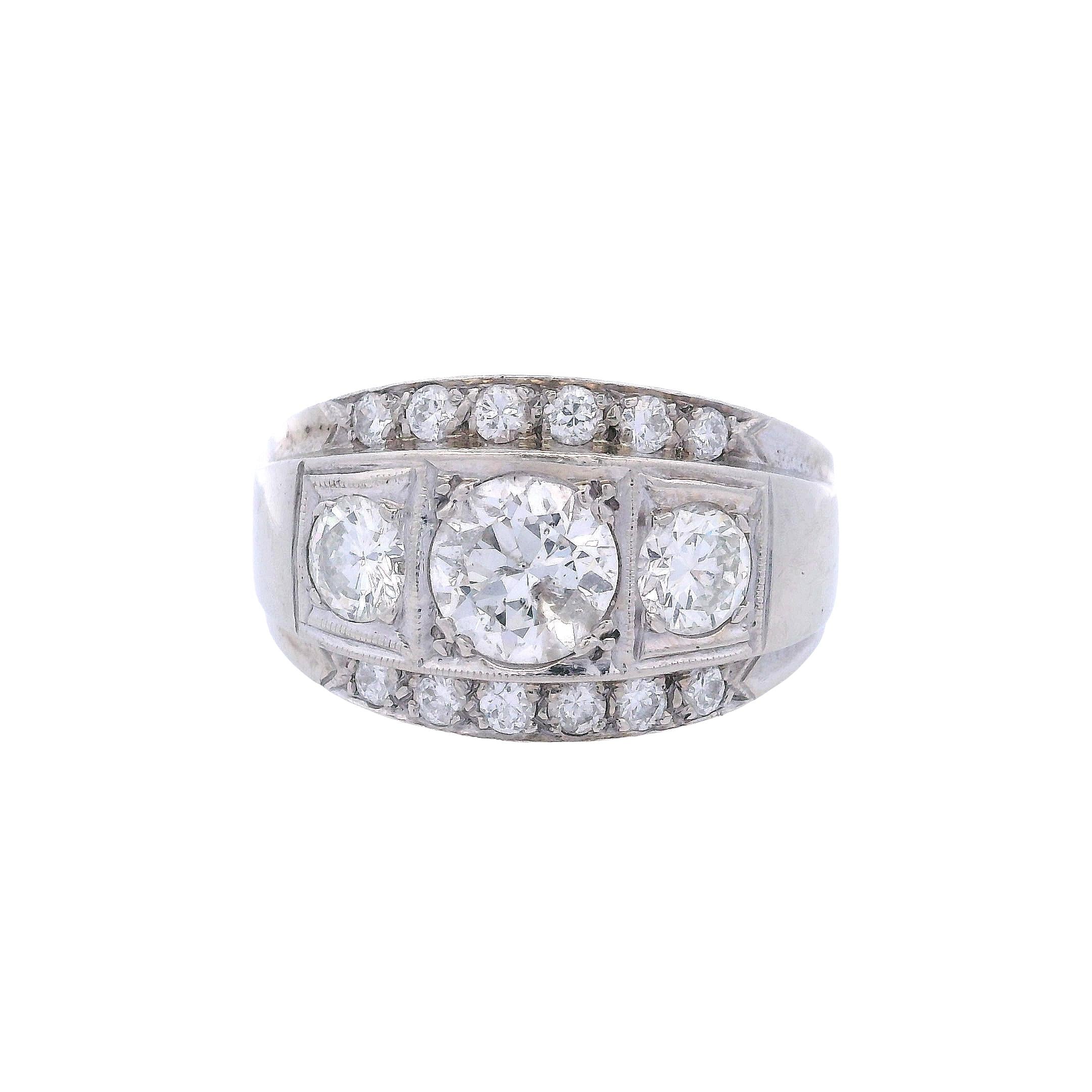 This stunning 1950's engagement ring showcases the romantic charm of European-cut diamonds in a classic three-stone design with accent diamonds. Crafted in elegant 14kt white gold, this timeless piece features 15 European-cut diamonds that display the distinctive faceting and fire characteristic of vintage cutting techniques.