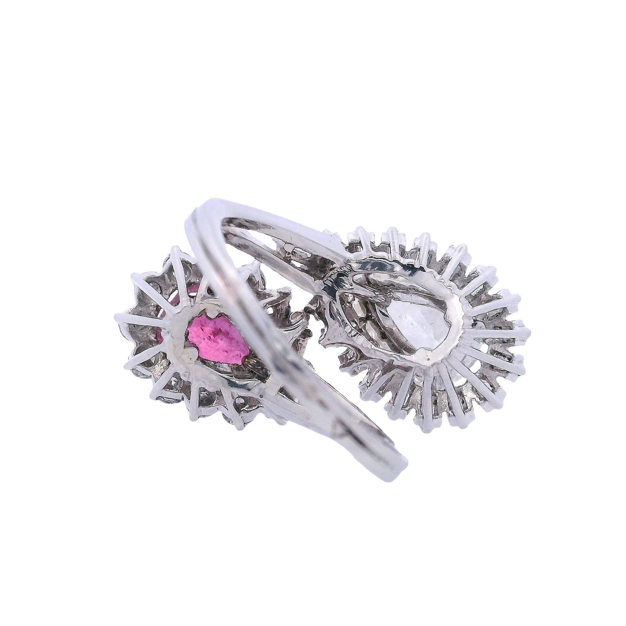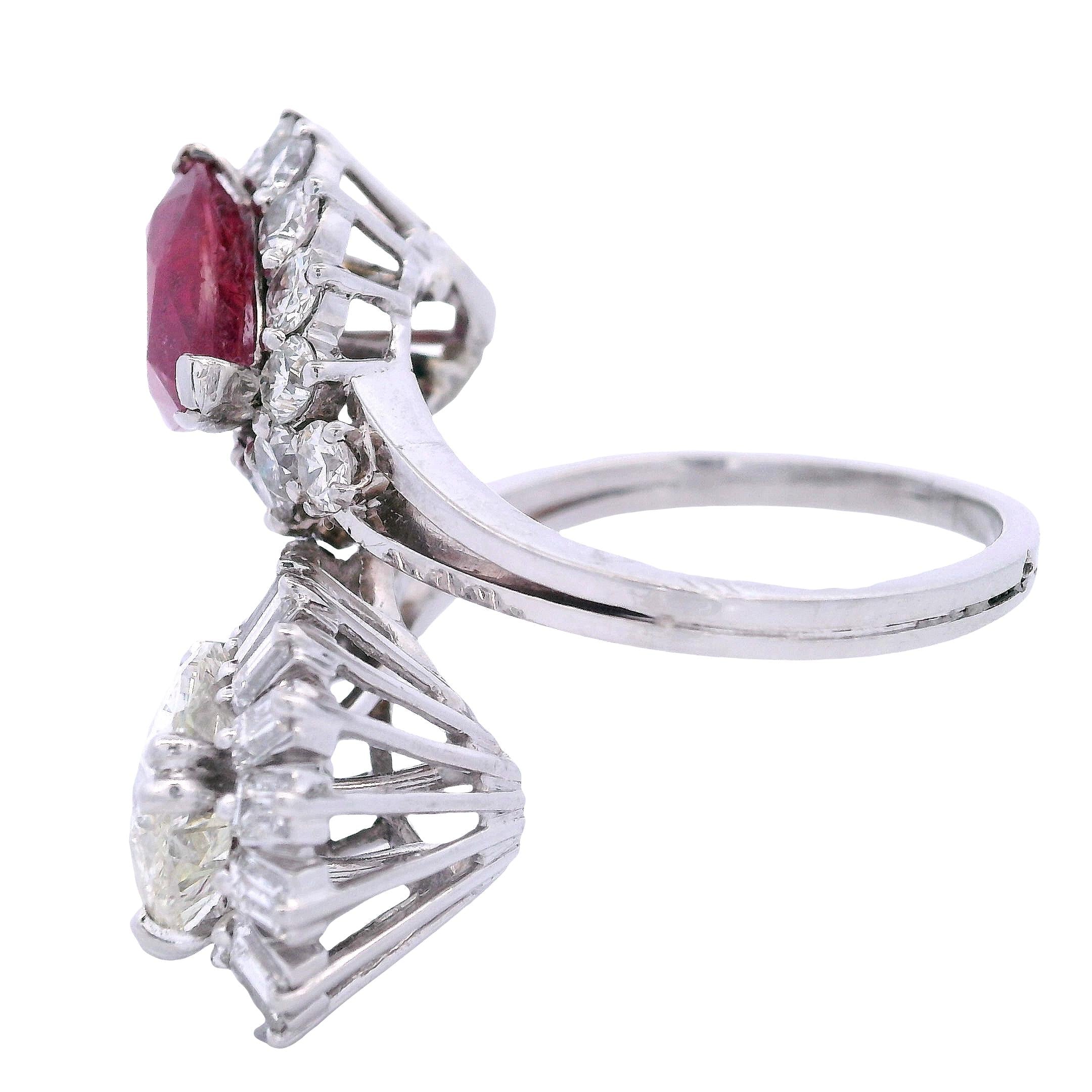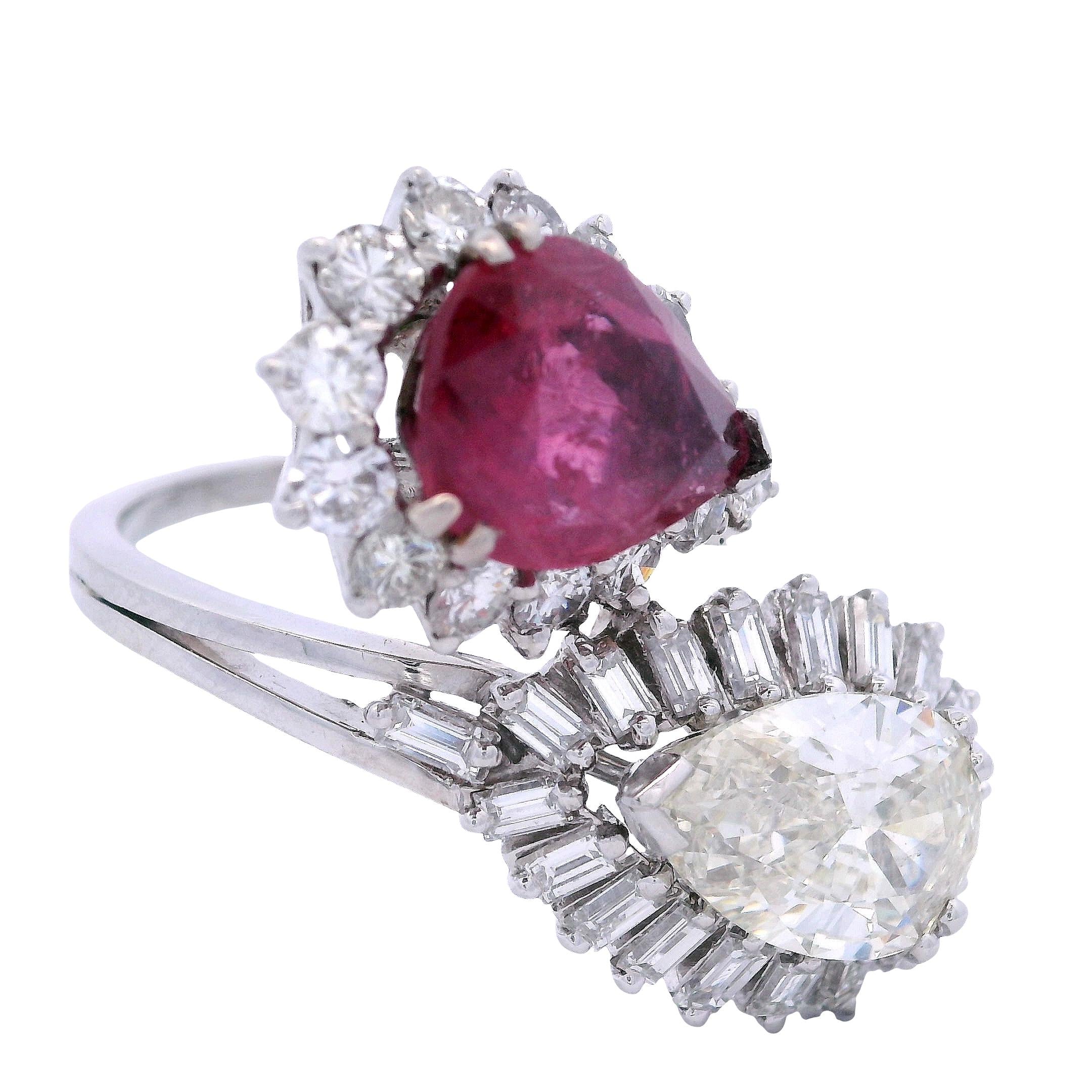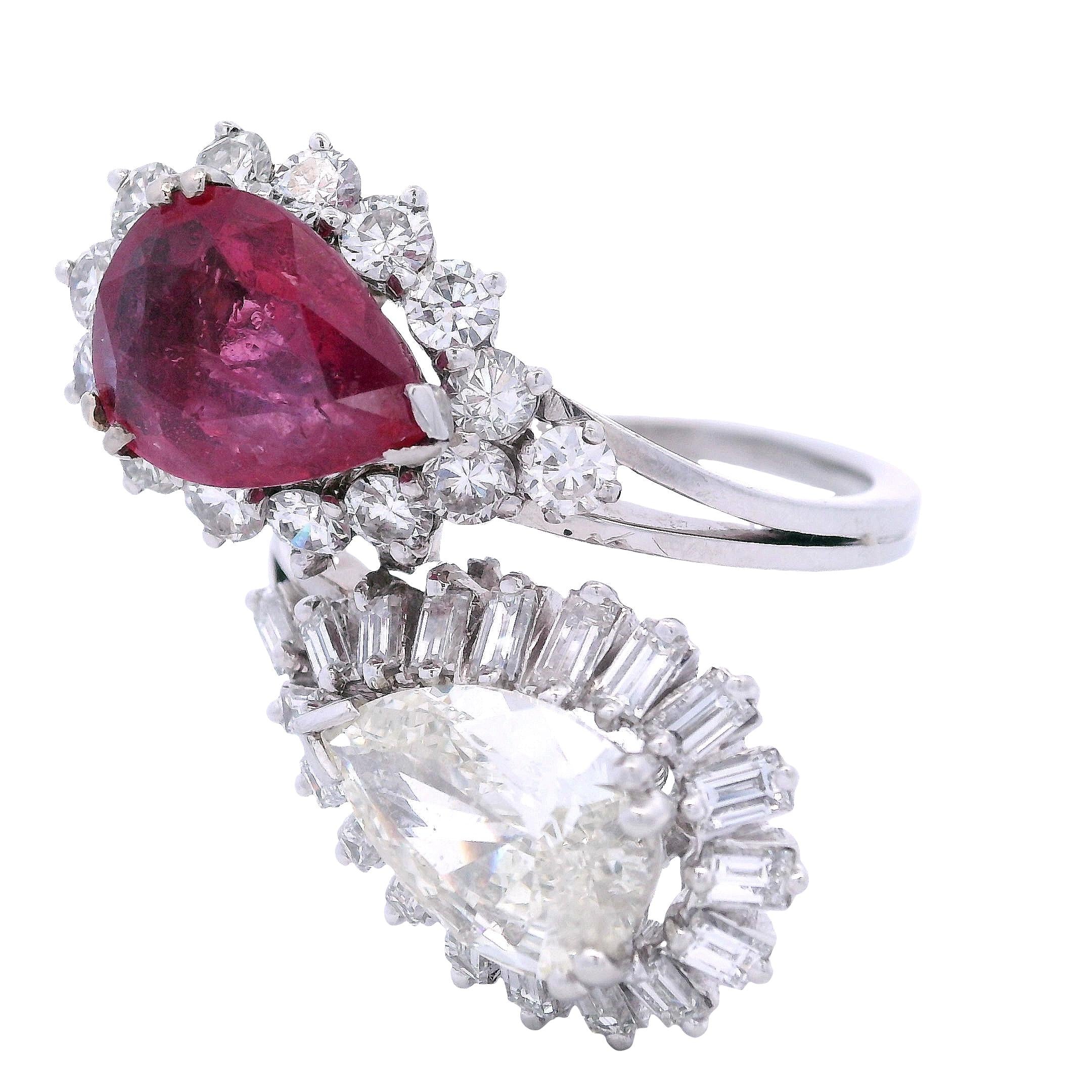 This extraordinary 1960's cocktail ring showcases the bold glamour of mid-century design with a stunning pear-shaped diamond and vibrant ruby centerpiece. Crafted in lustrous platinum, this statement piece features over 30 additional diamonds creating layers of brilliant sparkle around the dramatic gemstone duo. The sophisticated color combination of fiery ruby red against icy diamond brilliance epitomizes the confident luxury of the swinging sixties era.