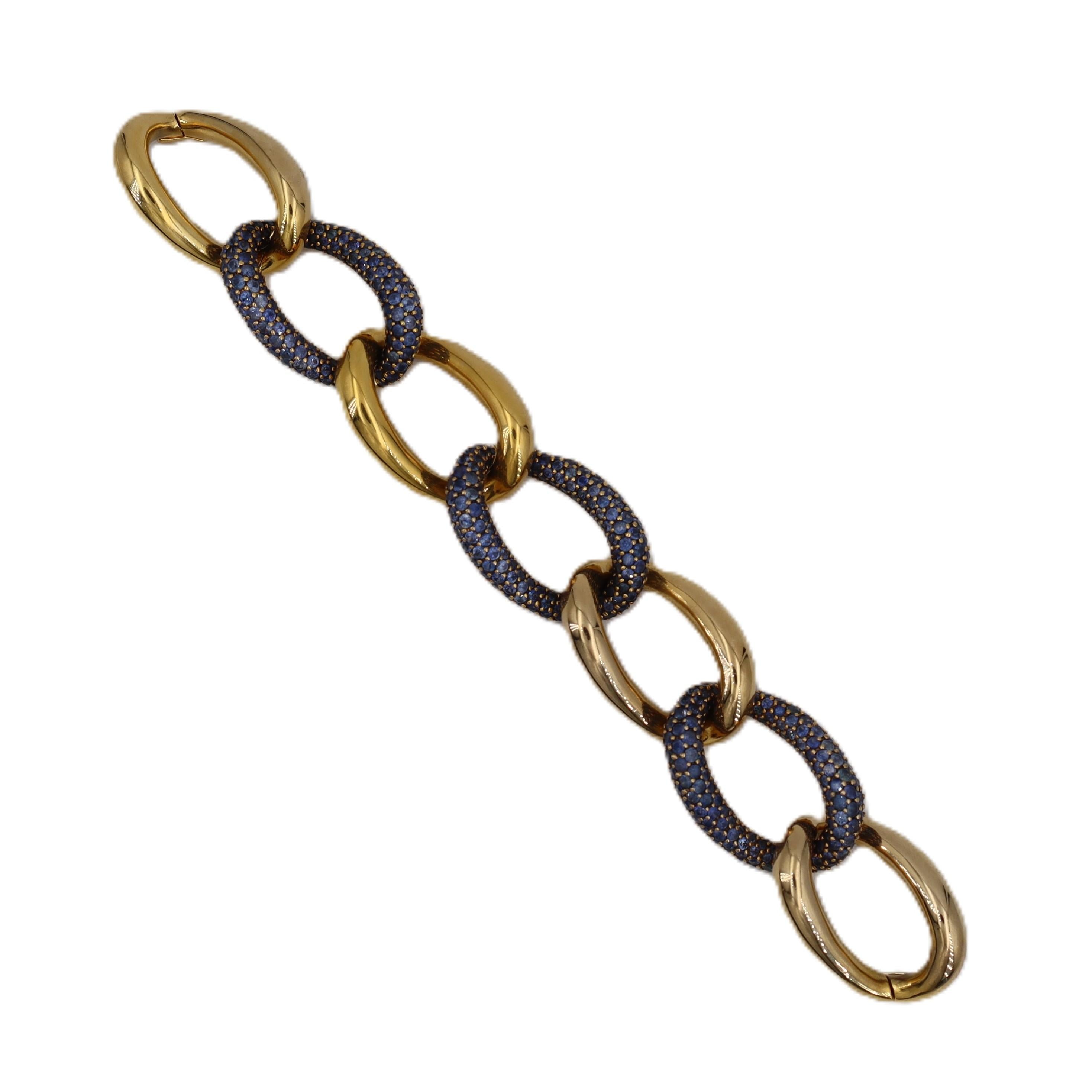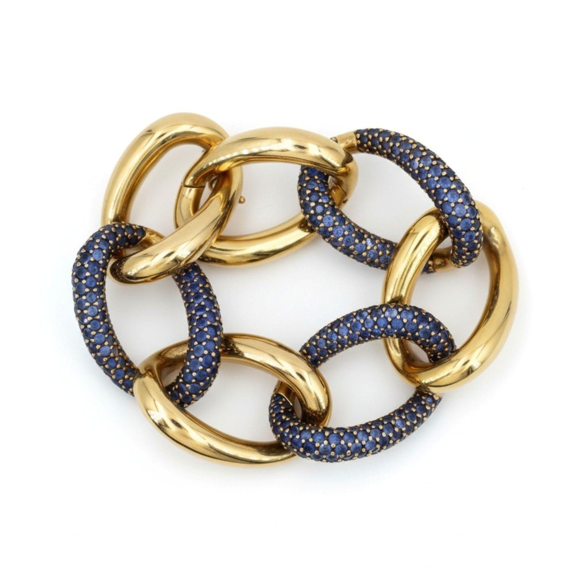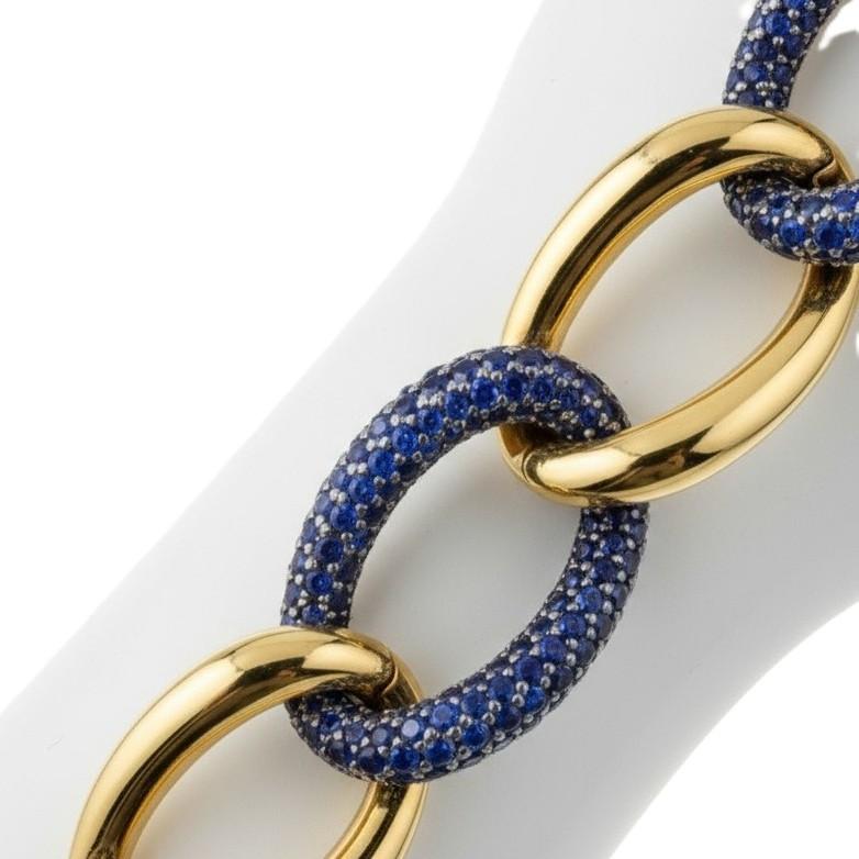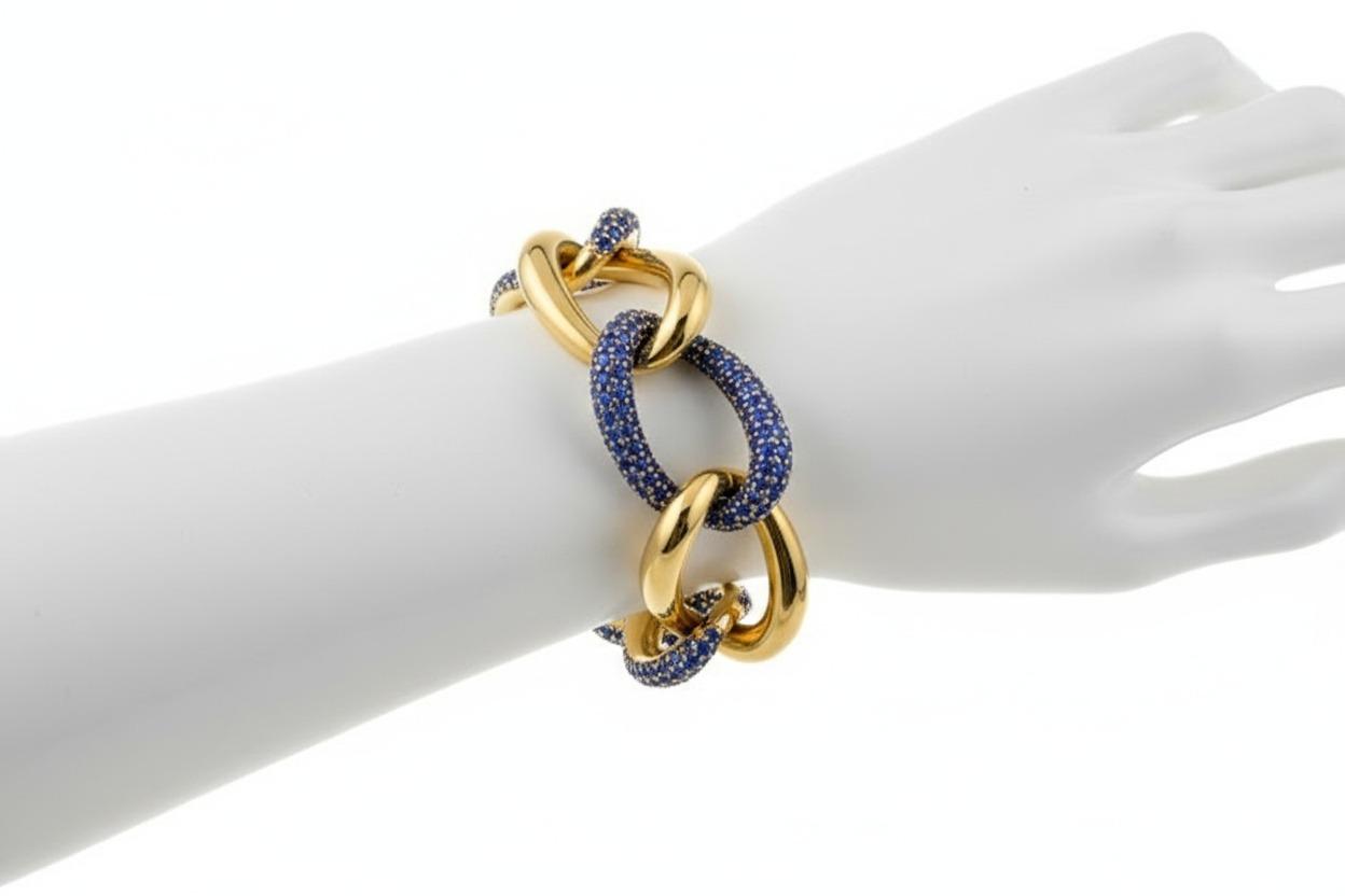 This gorgeous mid-century bracelet showcases exceptional craftsmanship and innovative design, featuring a sophisticated twisted shape expertly crafted in lustrous 18kt yellow gold and accented with a stunning pavé of 279 graduated and calibrated blue sapphires totaling approximately 14.55 carats. The bracelet features an ingenious design with two hinges on each side allowing removal of two links to adjust the length from 7.0 to 8.5 inches, offering versatile fit and wearability.