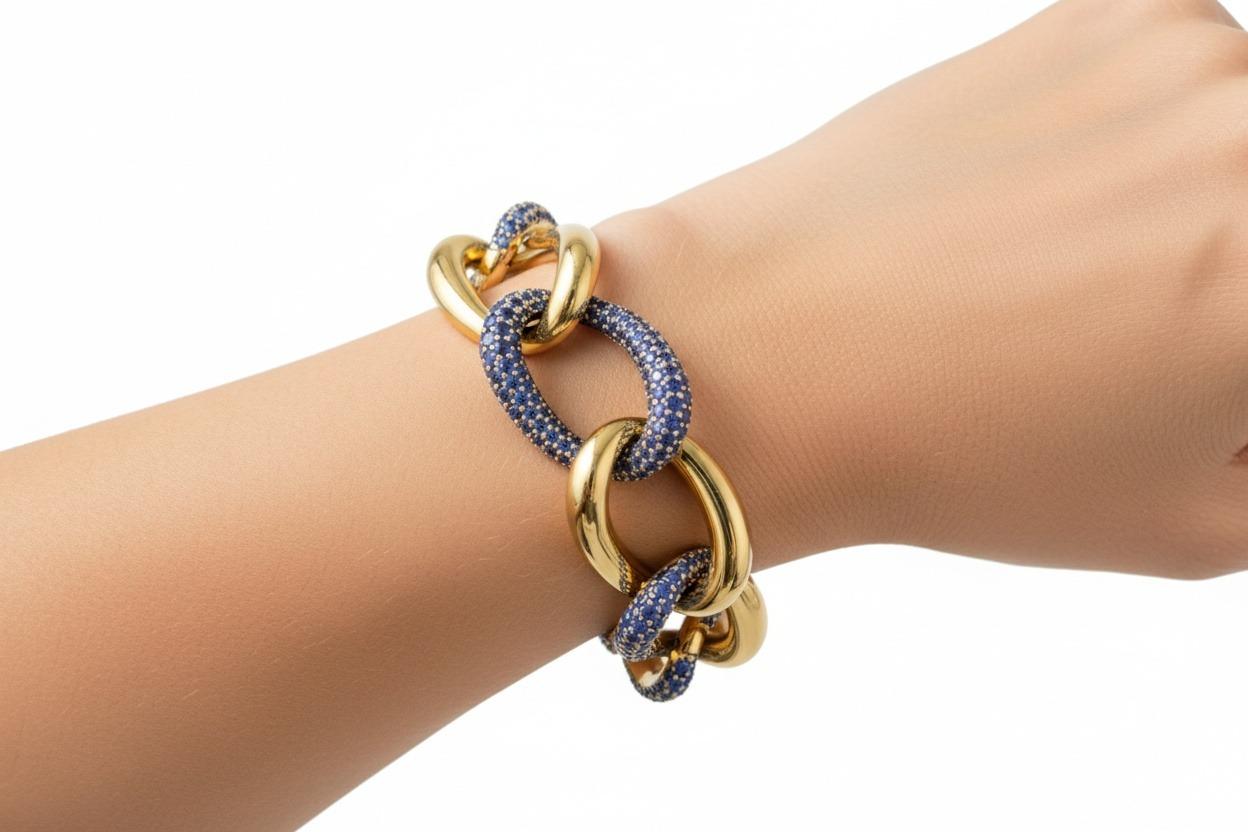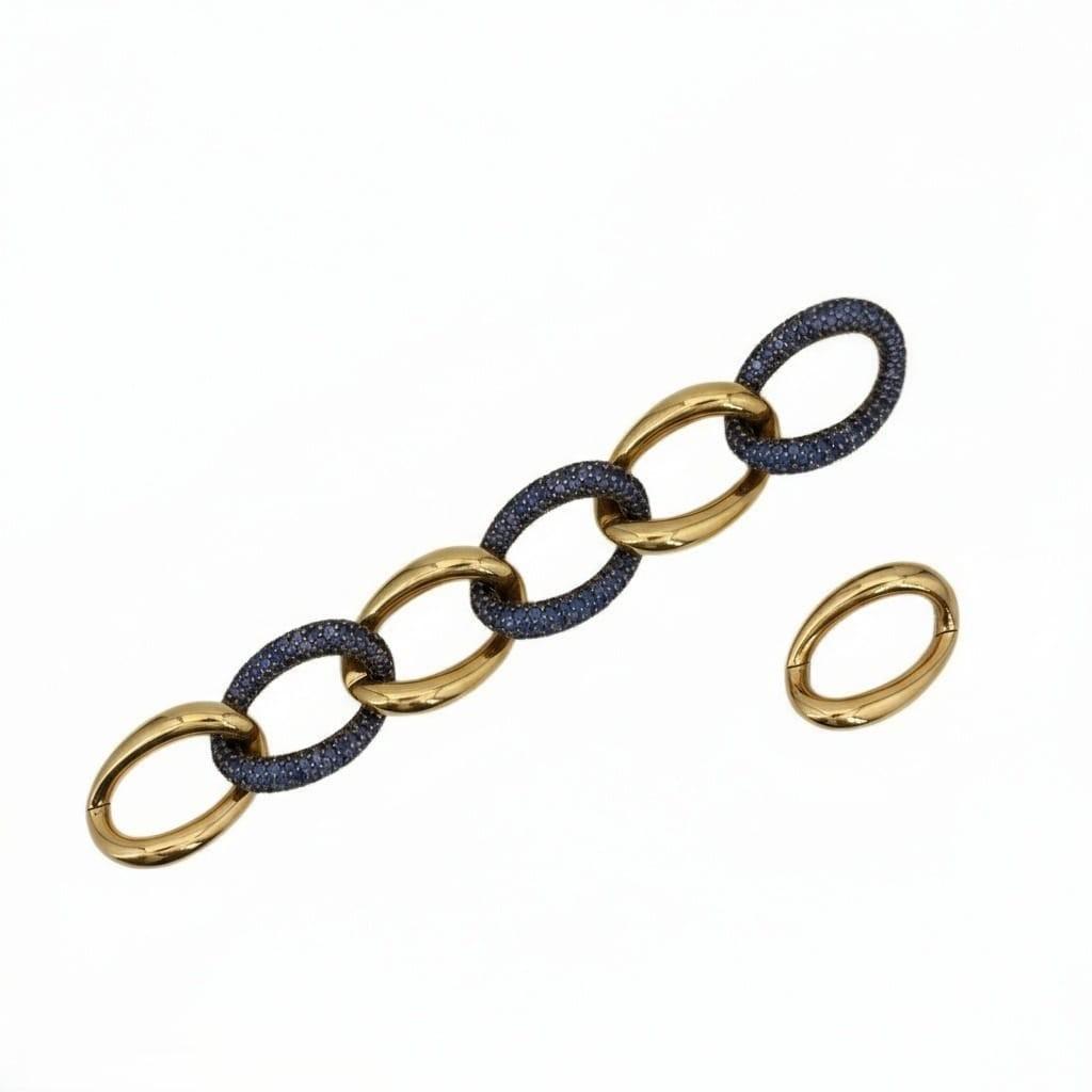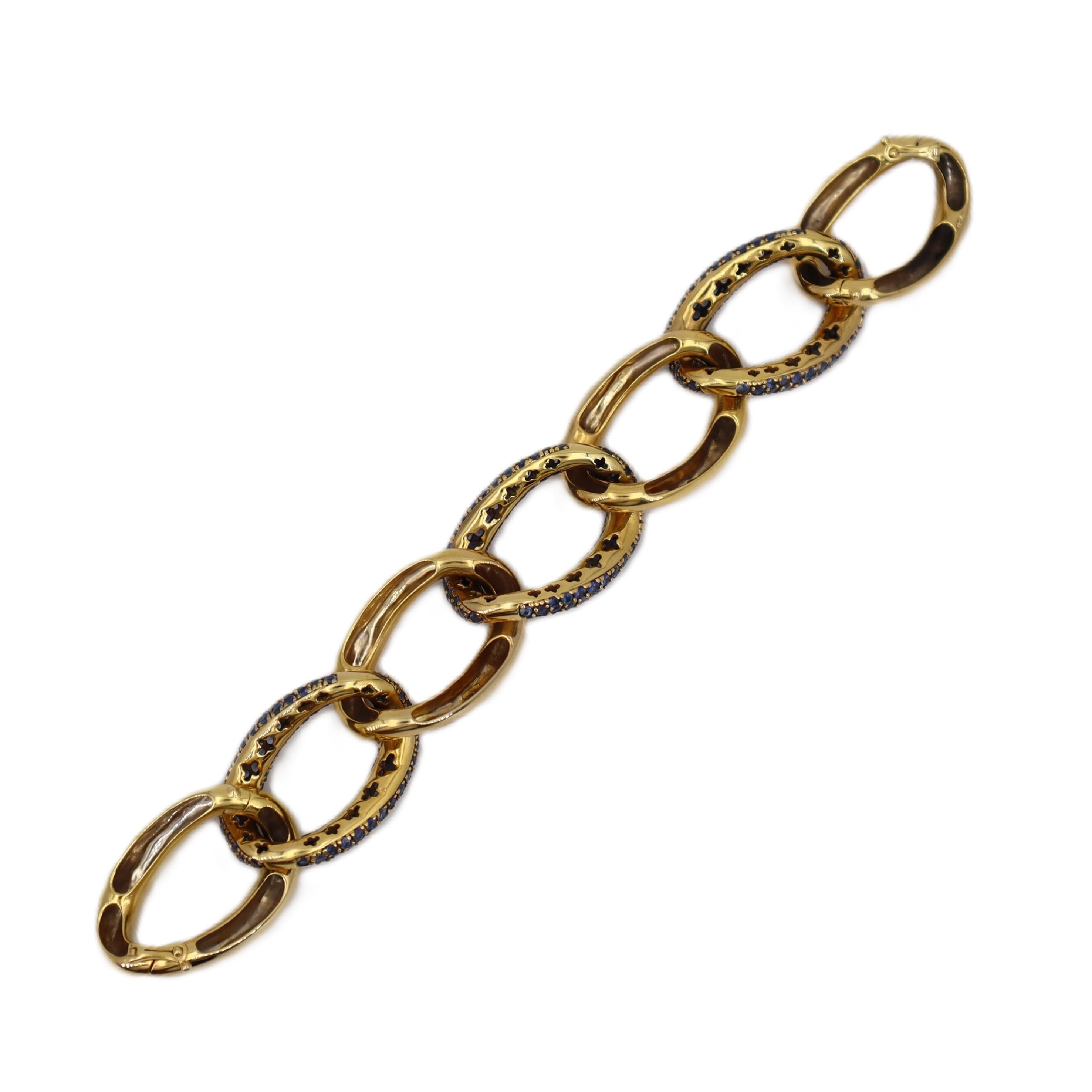 This gorgeous mid-century bracelet showcases exceptional craftsmanship and innovative design, featuring a sophisticated twisted shape expertly crafted in lustrous 18kt yellow gold and accented with a stunning pavé of 279 graduated and calibrated blue sapphires totaling approximately 14.55 carats. The bracelet features an ingenious design with two hinges on each side allowing removal of two links to adjust the length from 7.0 to 8.5 inches, offering versatile fit and wearability.