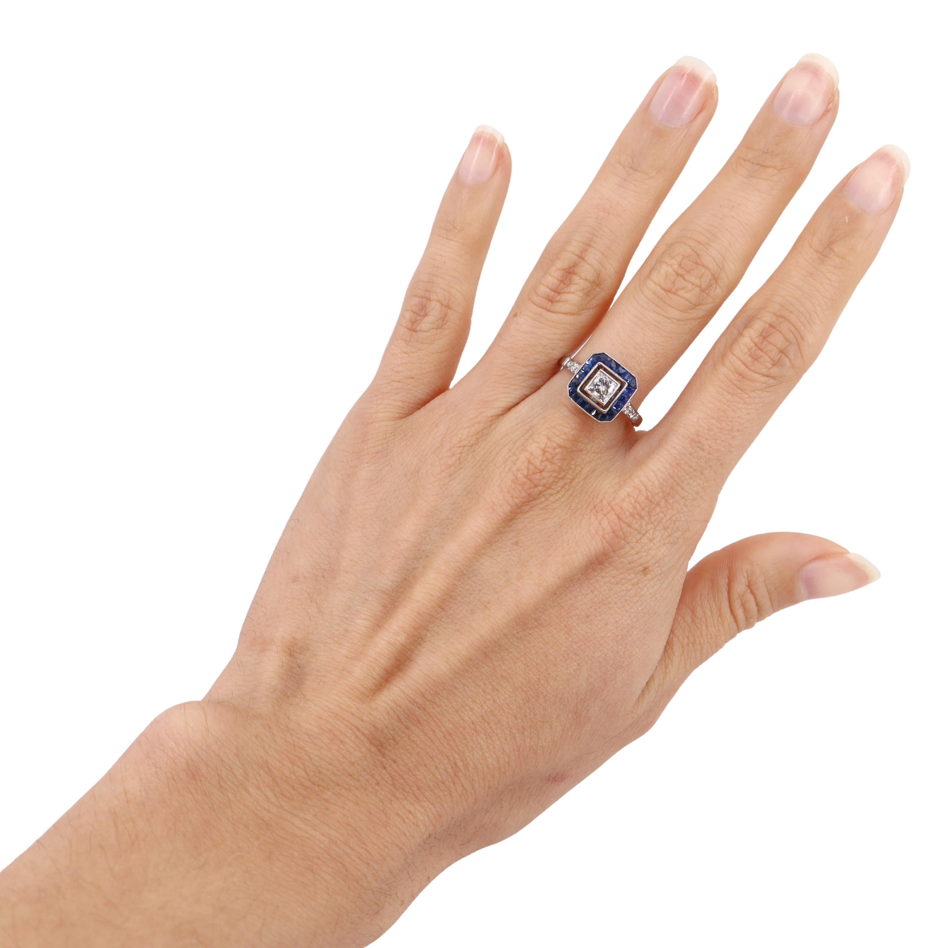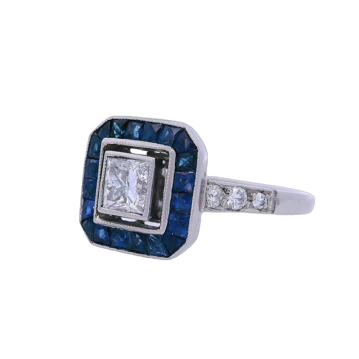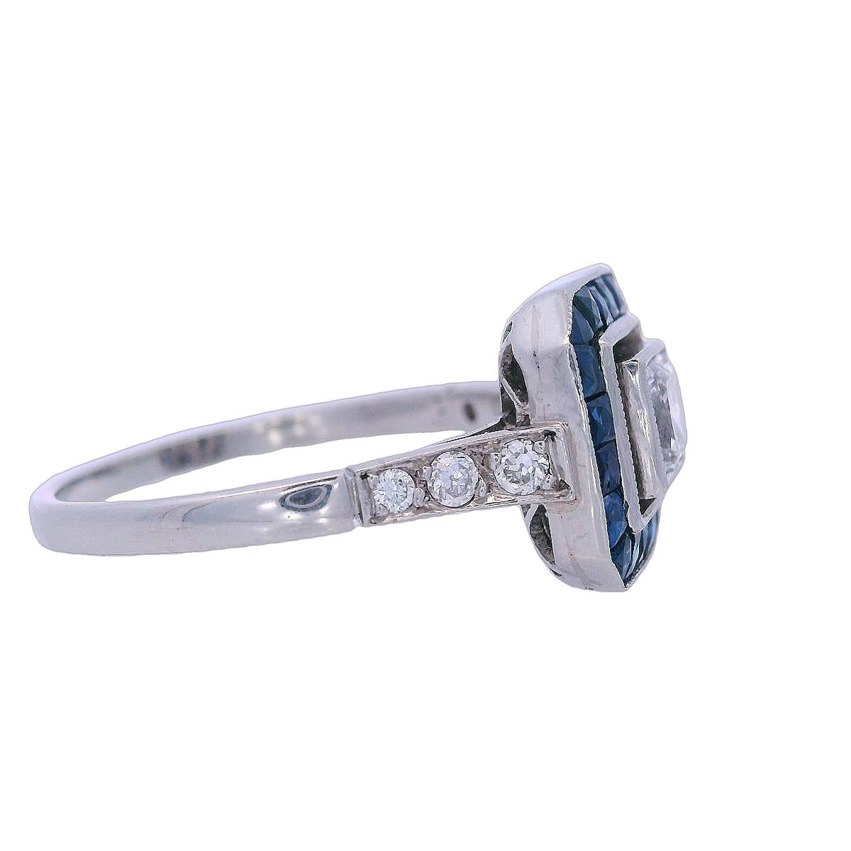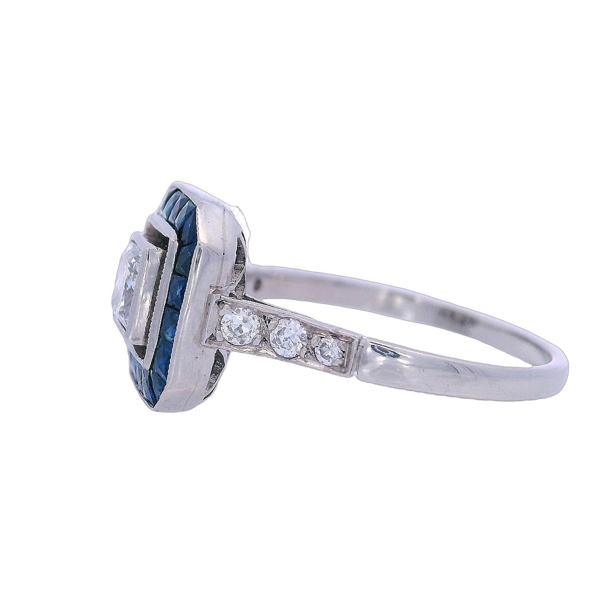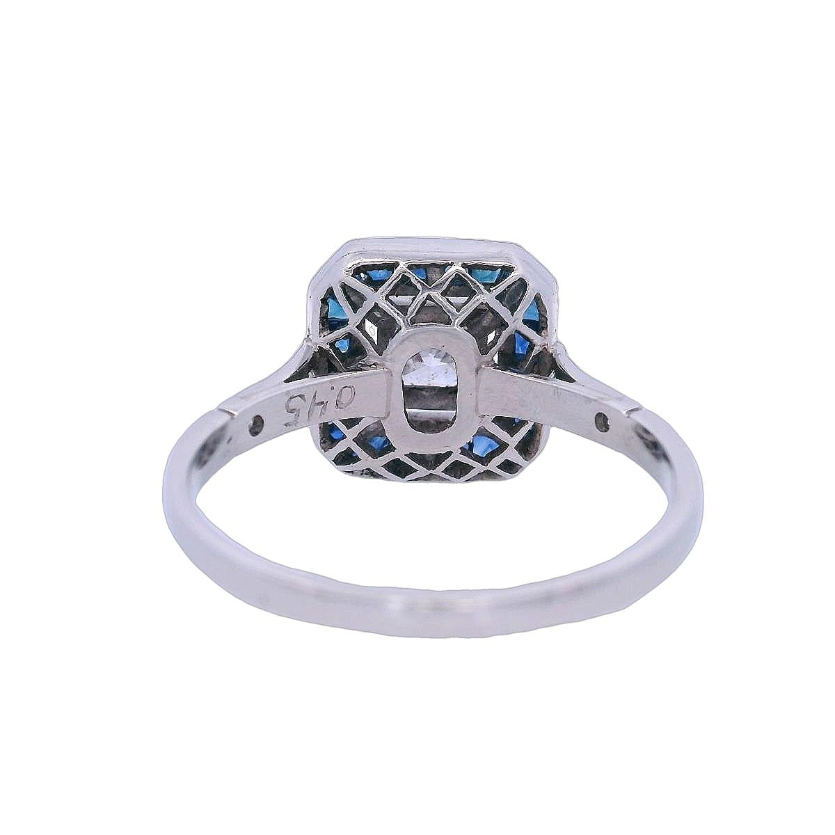 Art Deco 1930 Platinum halo Ring with Diamonds and Blue Sapphires