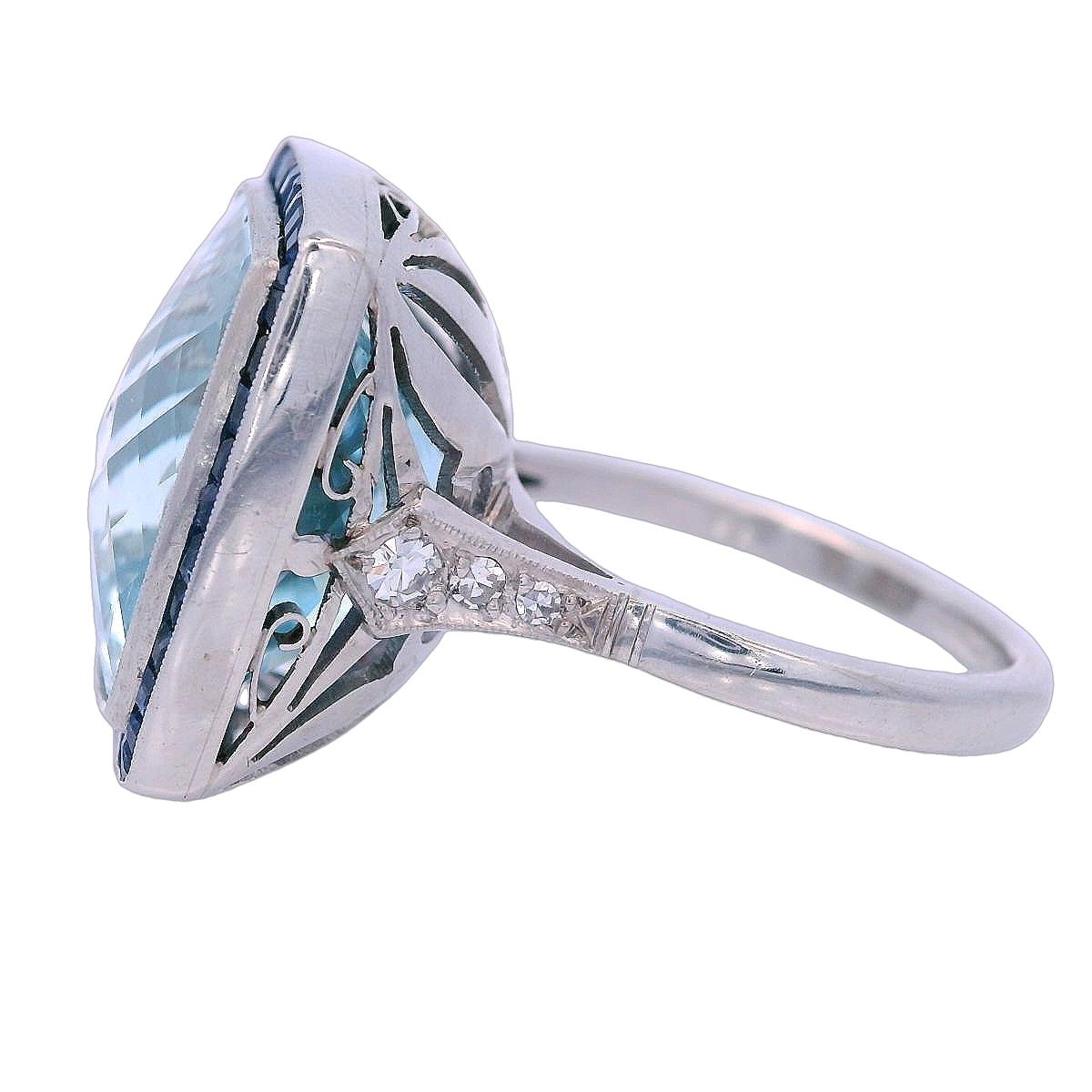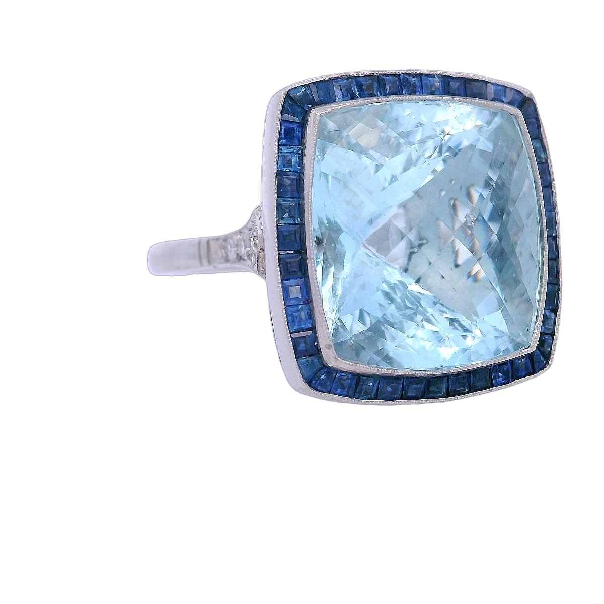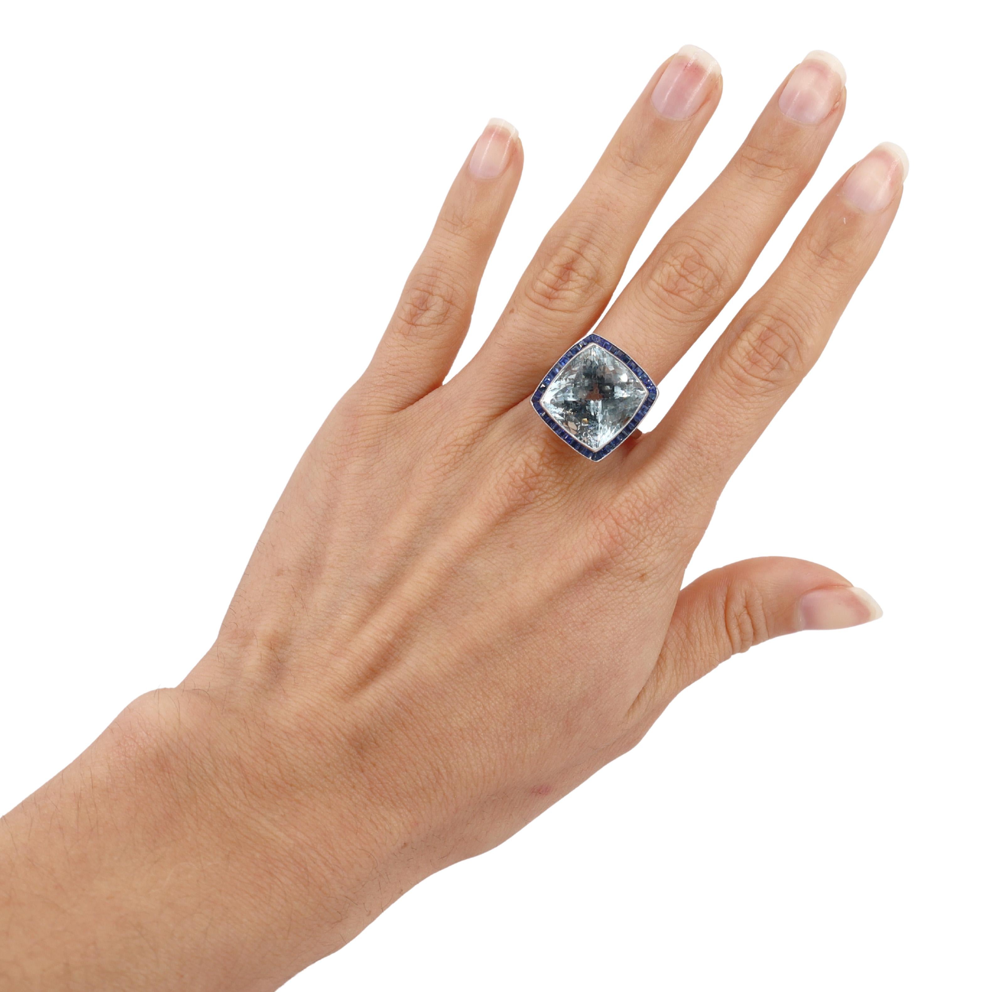 This exquisite gemstone is elegantly surrounded by 40 square-cut blue sapphires, weighing approximately 0.70 carats, which beautifully complement the aquamarine and enhance its vibrant color. Additionally, the ring features six graduated diamonds on the sides, with a total weight of around 0.08 carats in G color, adding a touch of brilliance and sophistication.